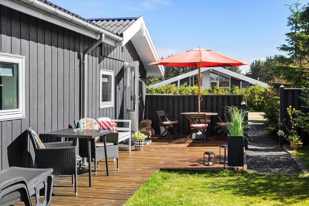 Når man har børn med på ferie, er det vigtigt med gode og brugbare udendørs faciliteter, og med legehus, gynge og basketballnet, opfylder dette sommerhus betingelserne til fulde. Det er også muligt at lege og spille bold på græsplænen, eller at tage en lur på liggestolene. Der er terrasser på flere sider af huset, mod vest også en overdækket del, som er ideel til de lange og lune sommeraftener, og grunden er fint afskærmet mod naboer og forbipasserende.