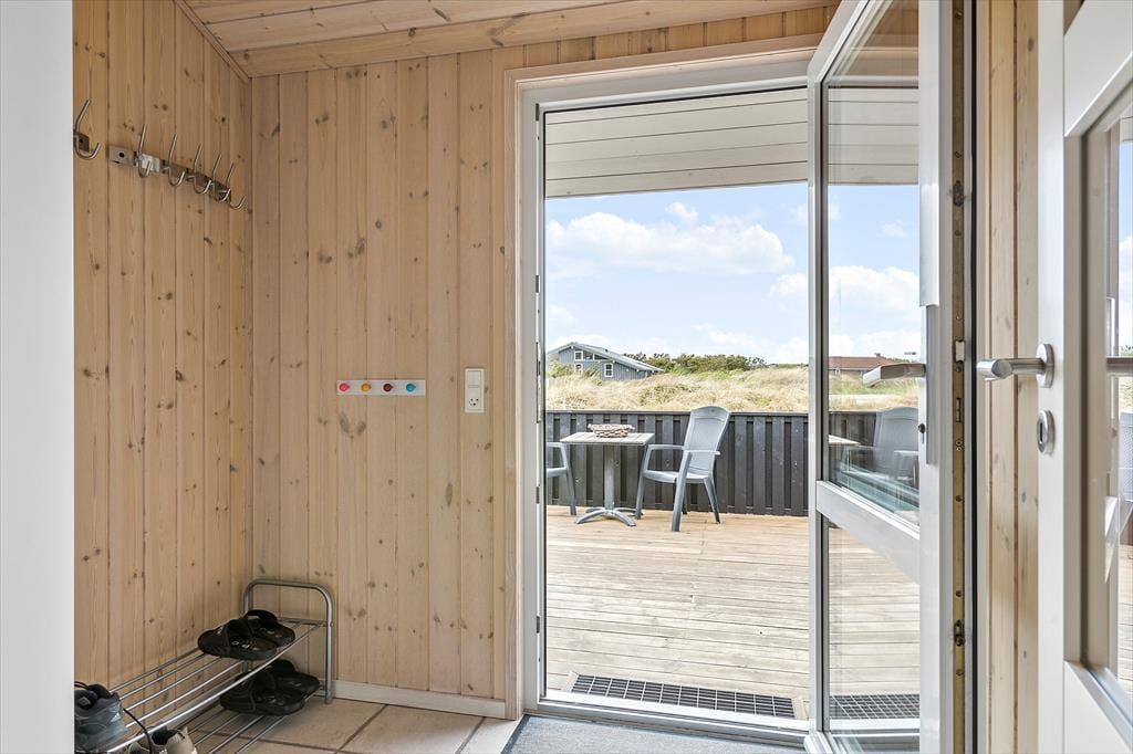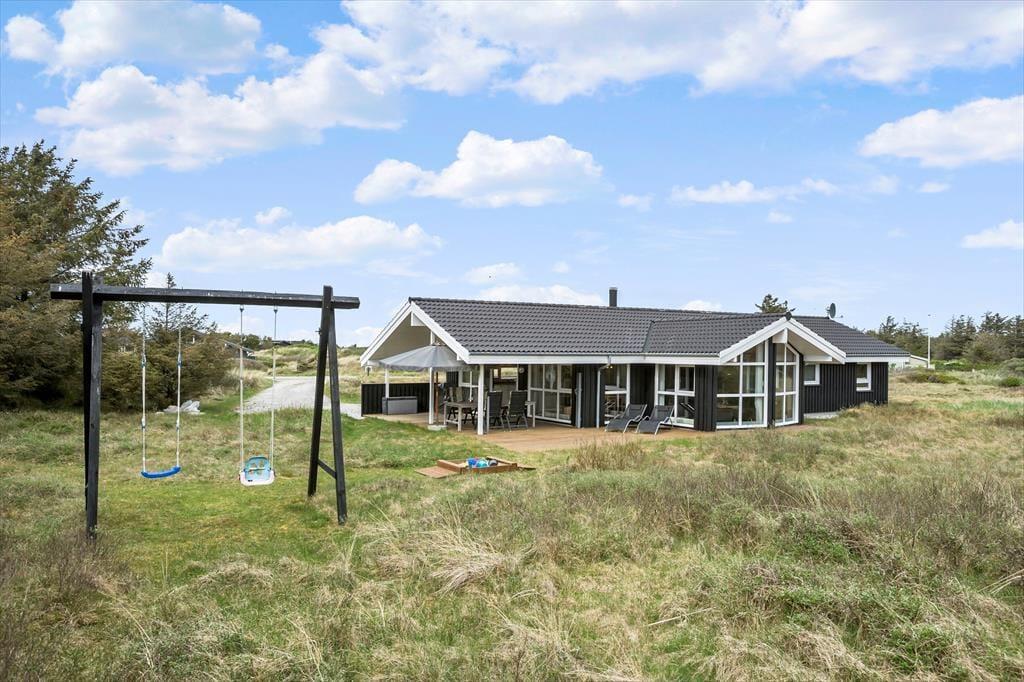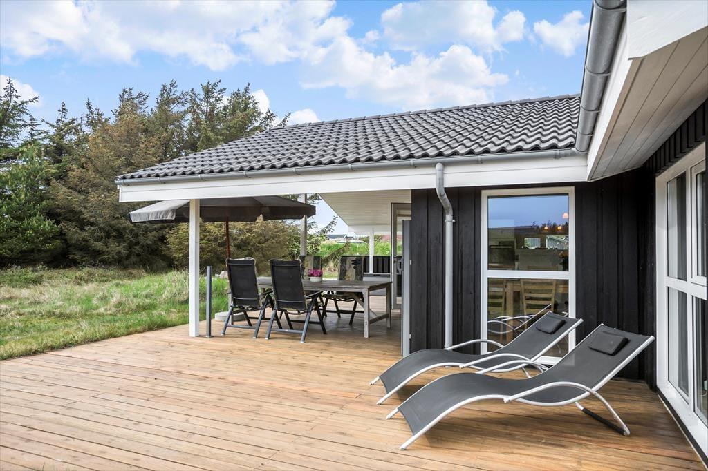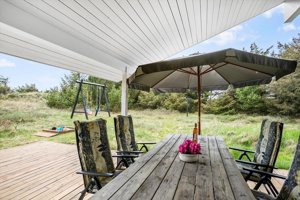 Sommerhuset ligger på en stor naturgrund med lidt blandet beplantning. Her er mulighed for både gemmeleg, boldspil og solbadning, og de yngste kan aktiveres i sandkassen og gyngerne. Mod sydvest ligger en stor træterrasse med gode muligheder for at finde læ på blæsende dage; her er også en dejlig overdækket del, som er god om aftenen, når duggen falder på.
