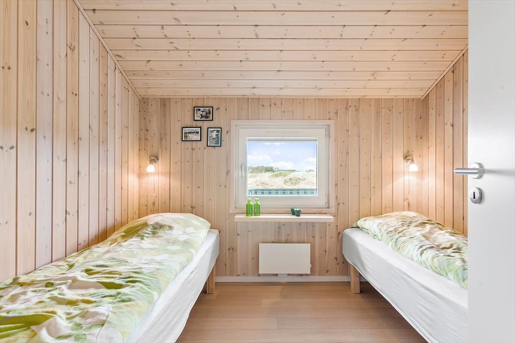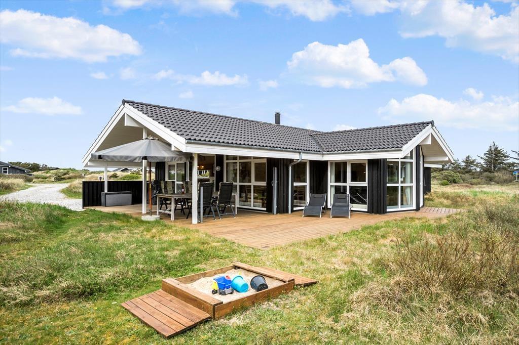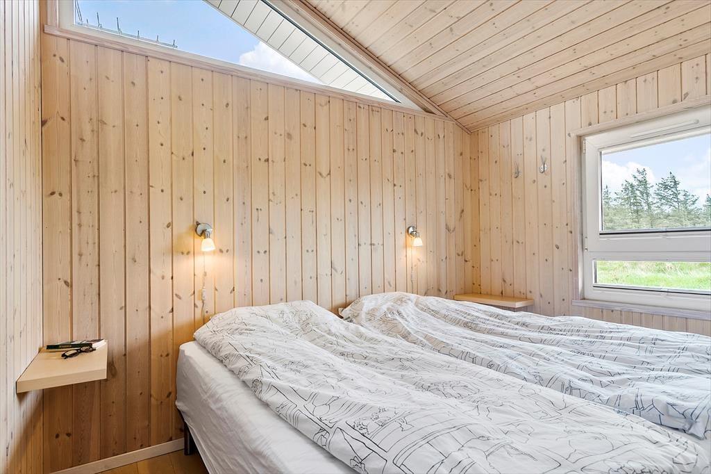 I dette sommerhus er nøgleordet ’kvalitet’. Her er gode møbler, velfungerende hårde hvidevarer, og flot og stilfuld indretning i lyse og varme farver. Den kombinerede spise- og opholdsafdeling fungerer som et helt naturligt samlingssted for hele familien; især sofaarrangementet ved de store vinduer lægger op til hyggelige stunder. Det er også muligt at tænde op i brændeovnen og gå på det trådløse internet. Køkkenet er veludstyret og har udgang til den overdækkede terrasse, og med fire soveværelser og to badeværelser i den ene ende af sommerhuset er her lagt vægt på funktionalitet og anvendelighed. Begge badeværelser har bruser, og det ene har derudover spabad og sauna, foruden vaskemaskine og tørretumbler. Derudover findes der også barneseng og barnestol, så der er lagt op til en dejlig ferie med både større og mindre børn. Nye fluenet i alle soverum.