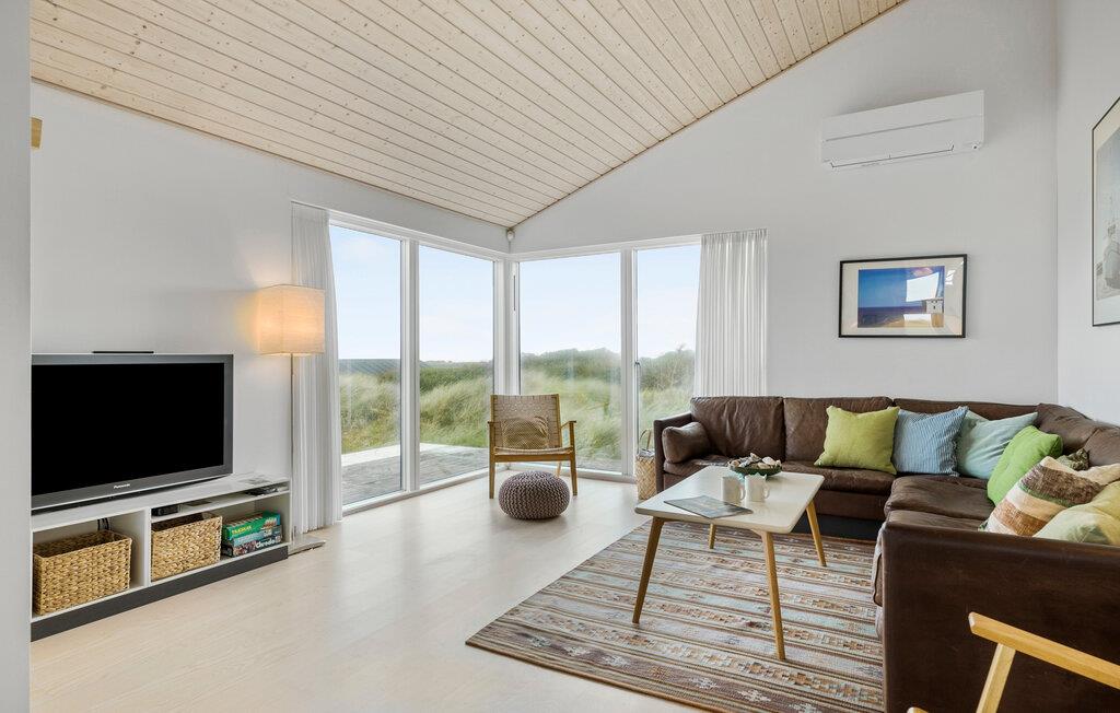 Dette skønne sommerhus er lyst og klassisk indrettet med gode faciliteter og store, åbne rum. I det hyggelige opholdsrum kan I nyde varmen fra brændeovnen, hvis vejret er køligt, og fra stuen kan I nyde udsigten over klitterne og helt ud til havet med en god bog til lyden af ildens knitren.
