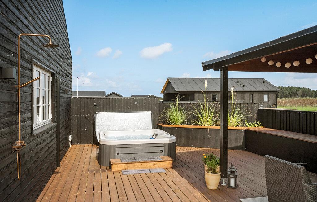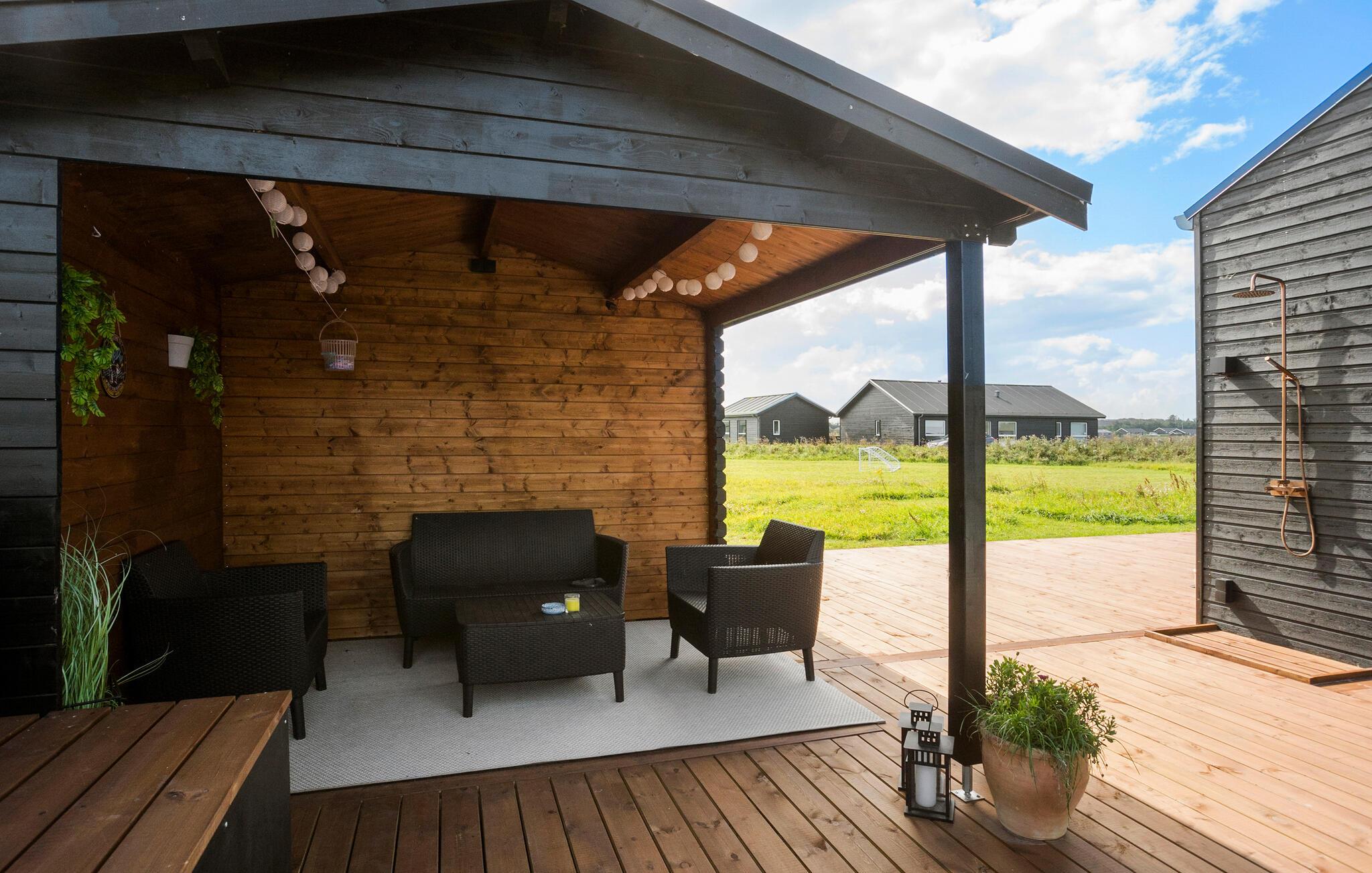 På de varme dage kan I nyde solen på terrassen lige fra morgenstunden eller i skygge under det overdækkede område. Hvis solen er ved at få jer, kan I skylle jer dejligt af under den udendørs bruser, og måske I skal forkæle jer selv med en tur i det udendørs spabad under stjernerne?
