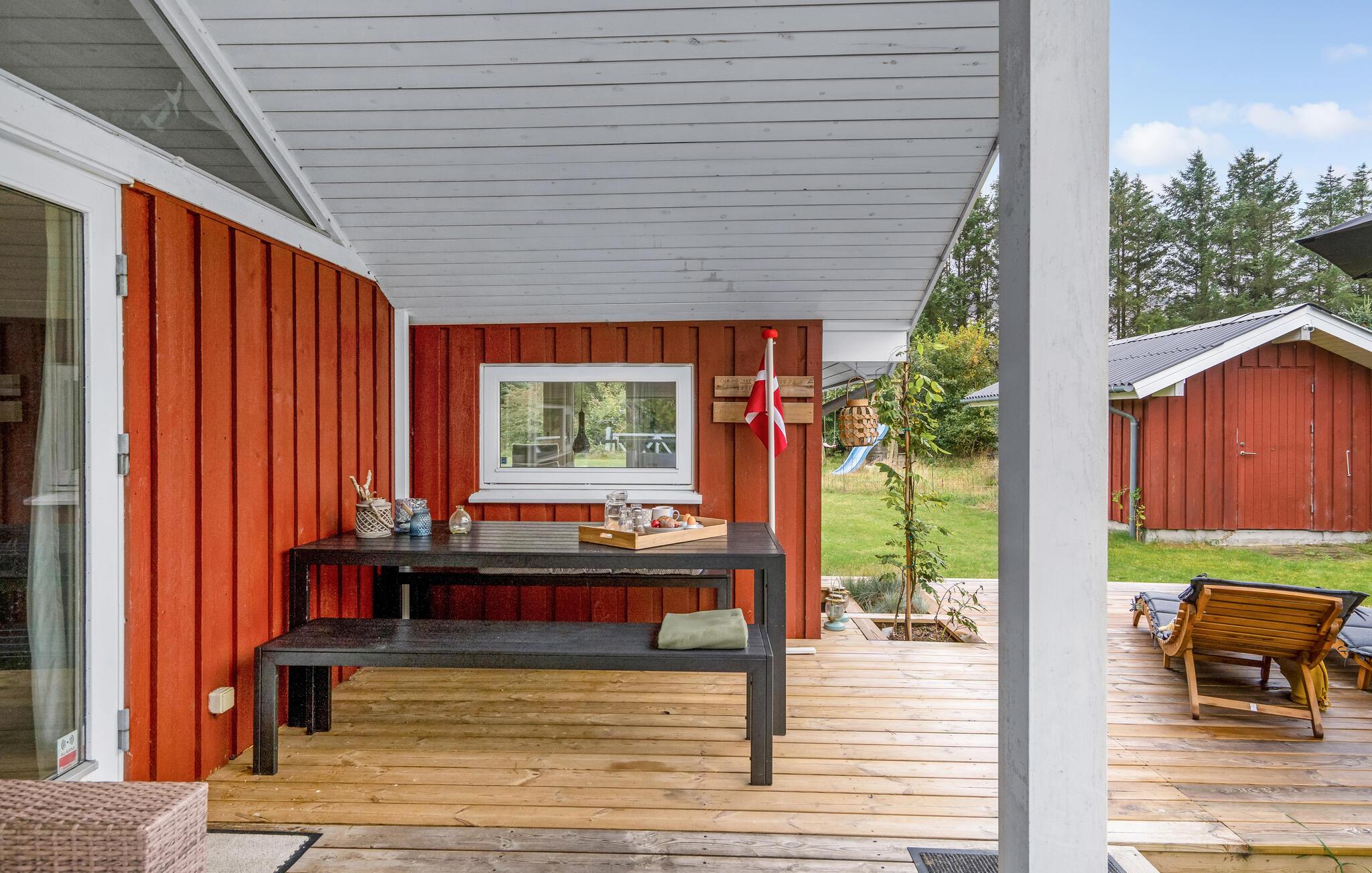 Hyggeligt sommerhus i Grønhøj med stor overdækket terrasse og adgang til fælles pool og sauna.