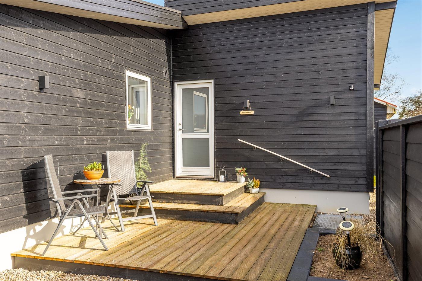 Udendørs venter et stort terrasseområde, der indbyder til udeliv fra morgen til aften, hvad enten dagen starter med morgenkaffe i solen, byder på afslapning i liggestolen eller afsluttes med hyggelige sommeraftener under åben himmel.