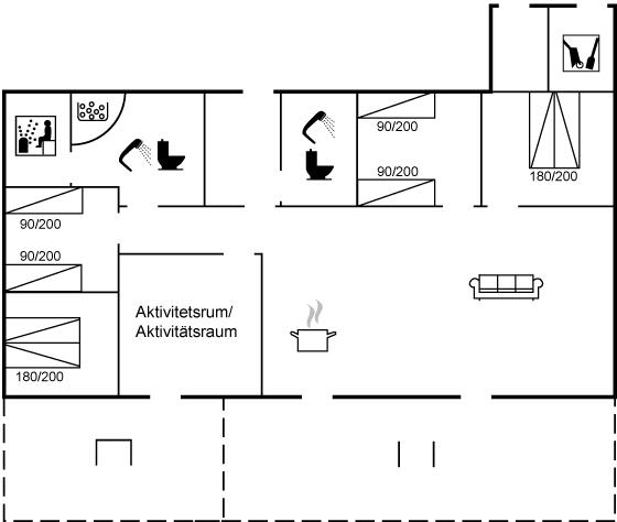 Der er i alt 4 soveværelser. Sovepladserne fordeler sig på: 4 sovepladser i dobbeltsenge. 4 sovepladser i enkeltsenge. 2 sovepladser på madrasser. 2 af disse sovepladser befinder sig på husets hems. Derudover er der 1 stk. barneseng.