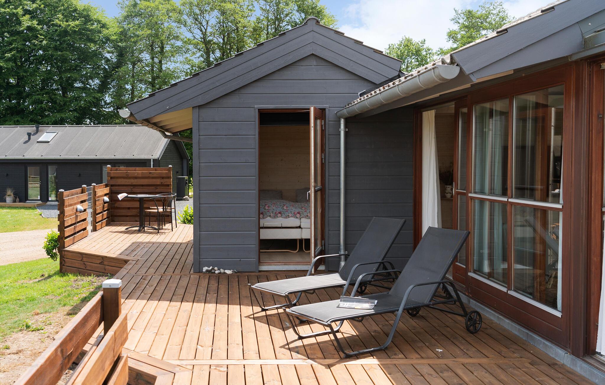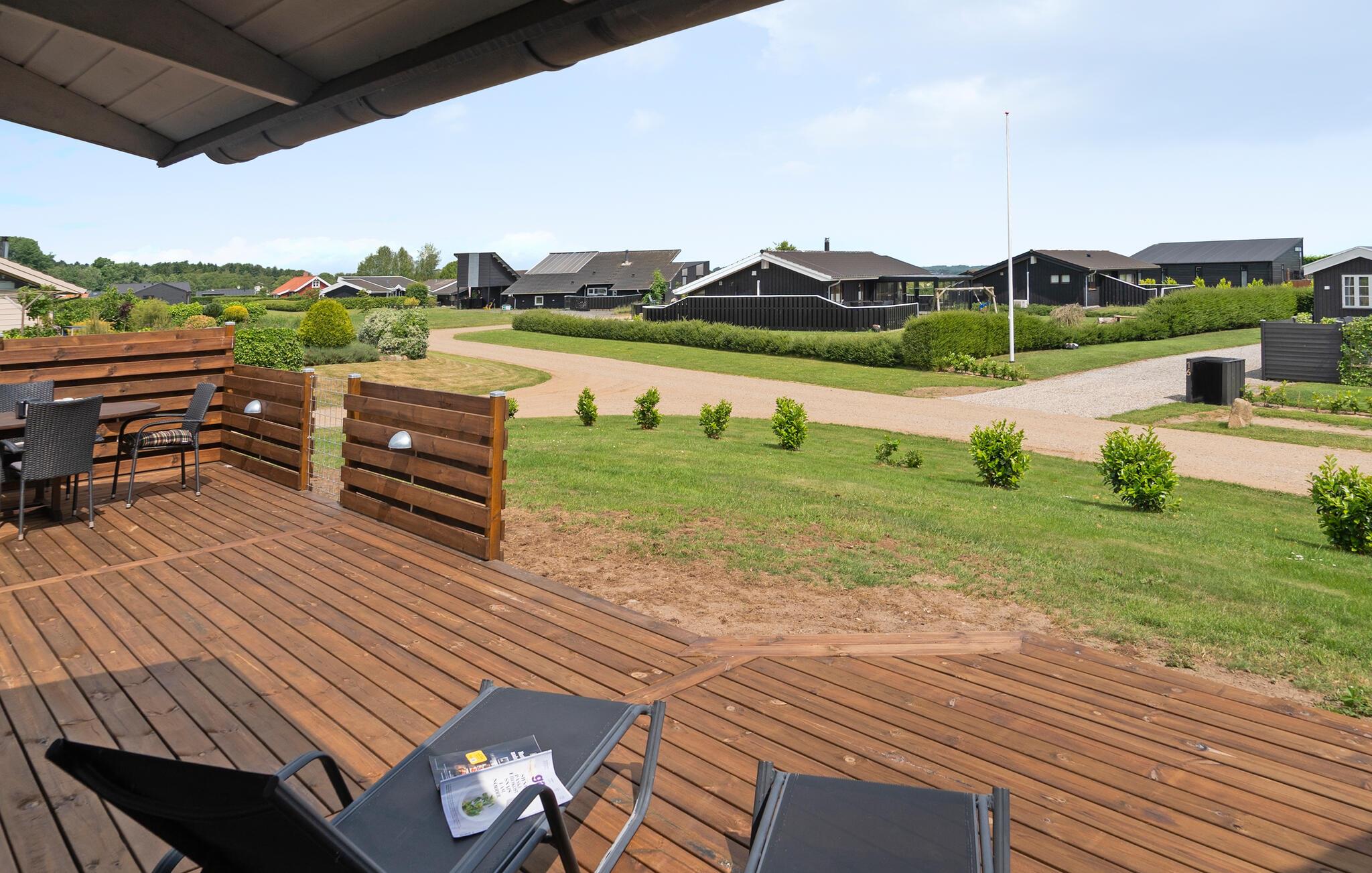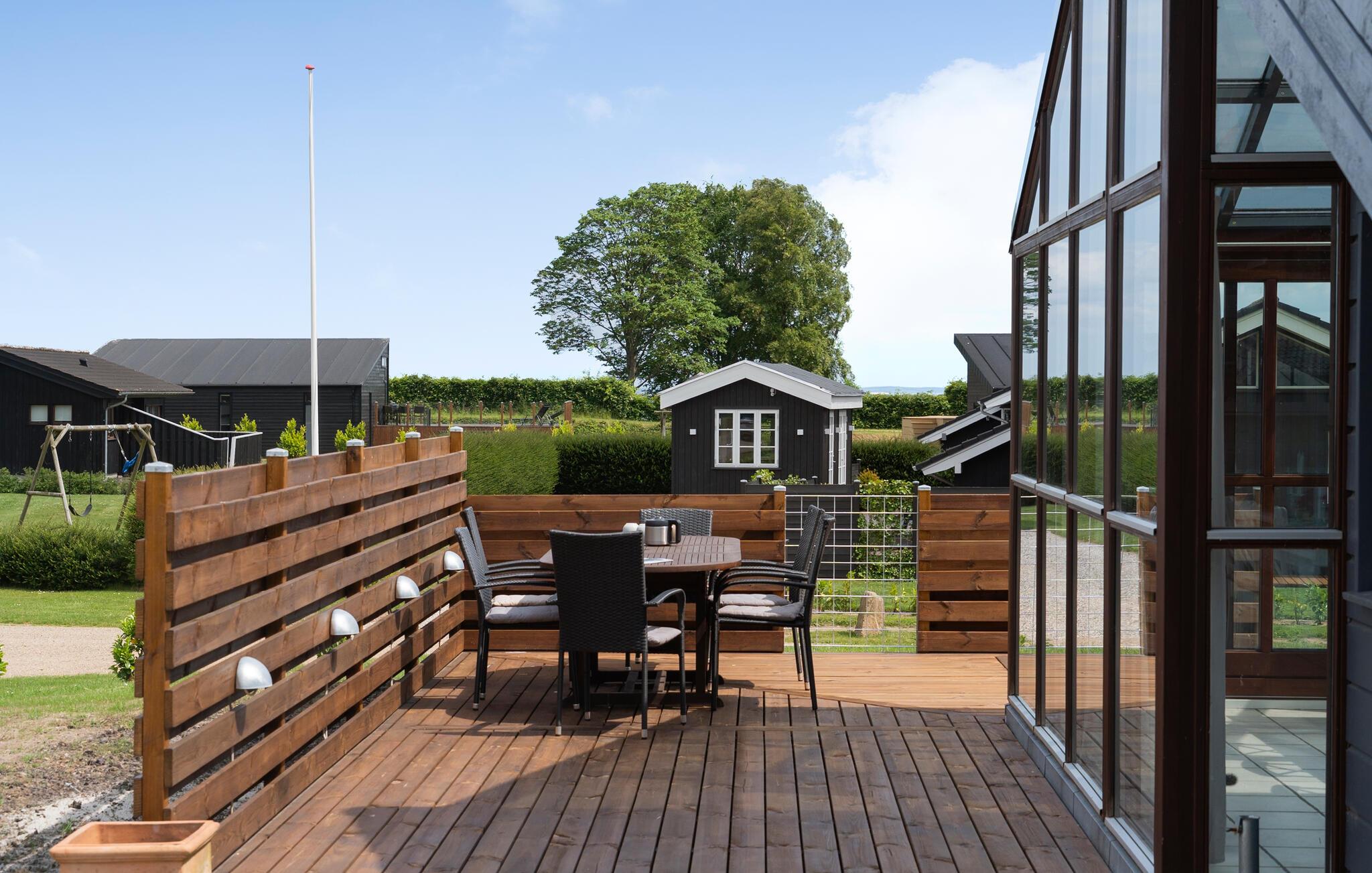 En stor terrasse indbyder til hyggelige timer under åben himmel og den åbne grund lægger op til alle former for aktiviteter til store og små. Her finder I udendørslege som sandkasse og rutsjebane, en grill til at afslutte aftenen med afslappende måltider og liggestole, så I i ro og mag kan se de skiftende skyformationer.