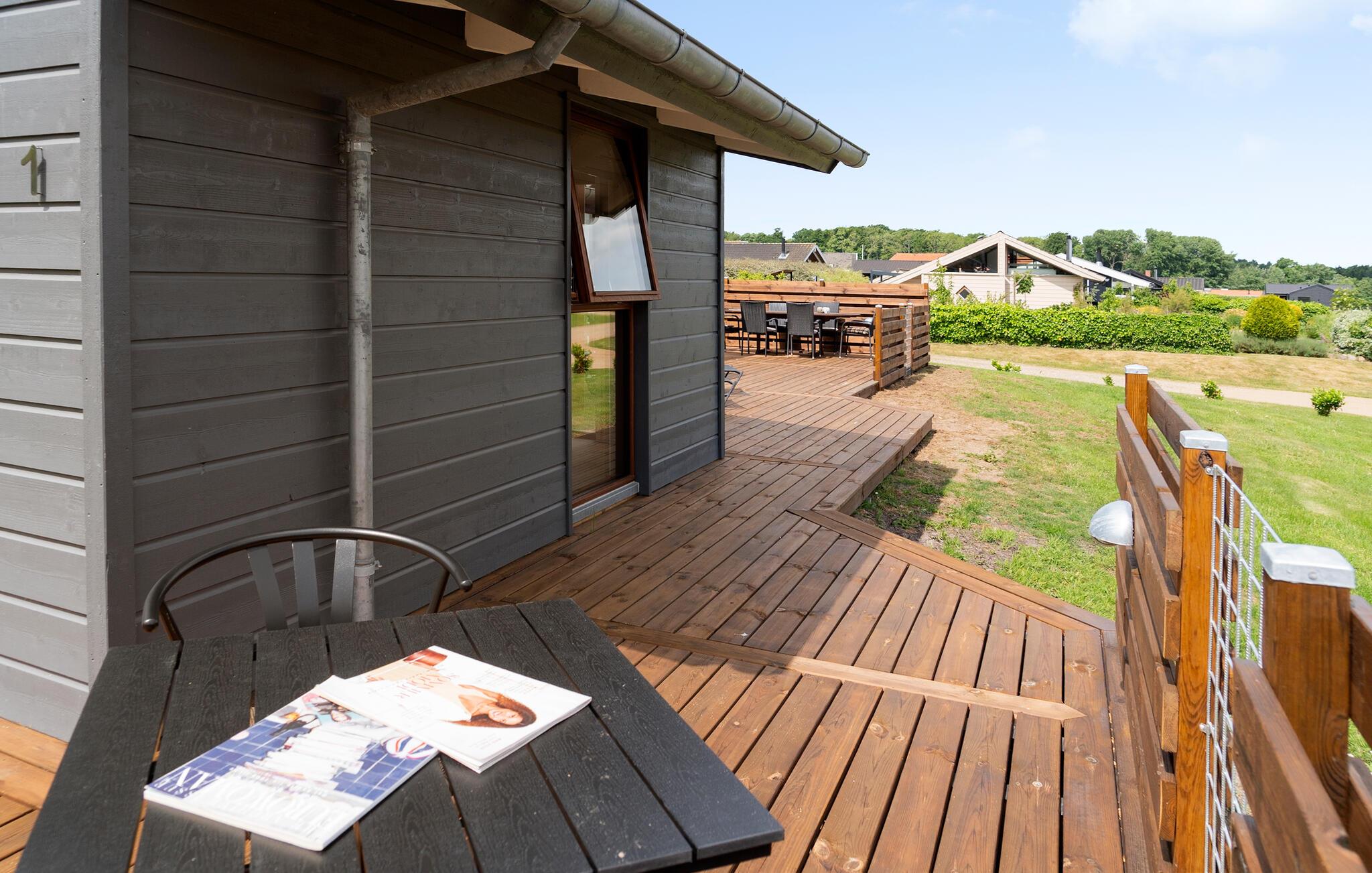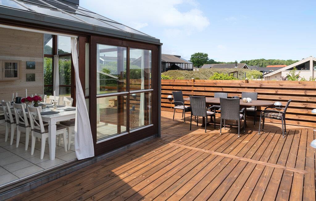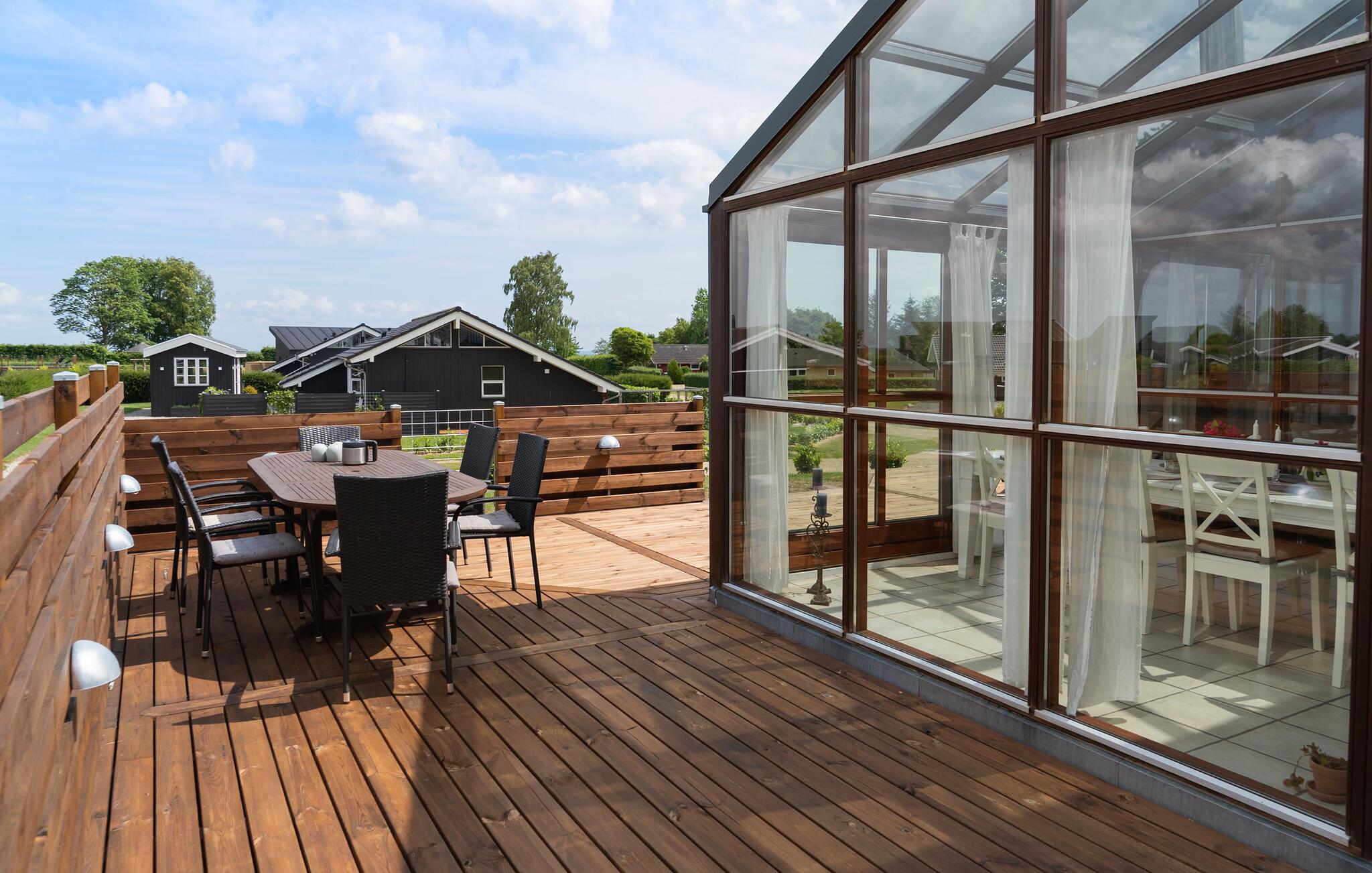 En stor terrasse indbyder til hyggelige timer under åben himmel og den åbne grund lægger op til alle former for aktiviteter til store og små. Her finder I udendørslege som sandkasse og rutsjebane, en grill til at afslutte aftenen med afslappende måltider og liggestole, så I i ro og mag kan se de skiftende skyformationer.