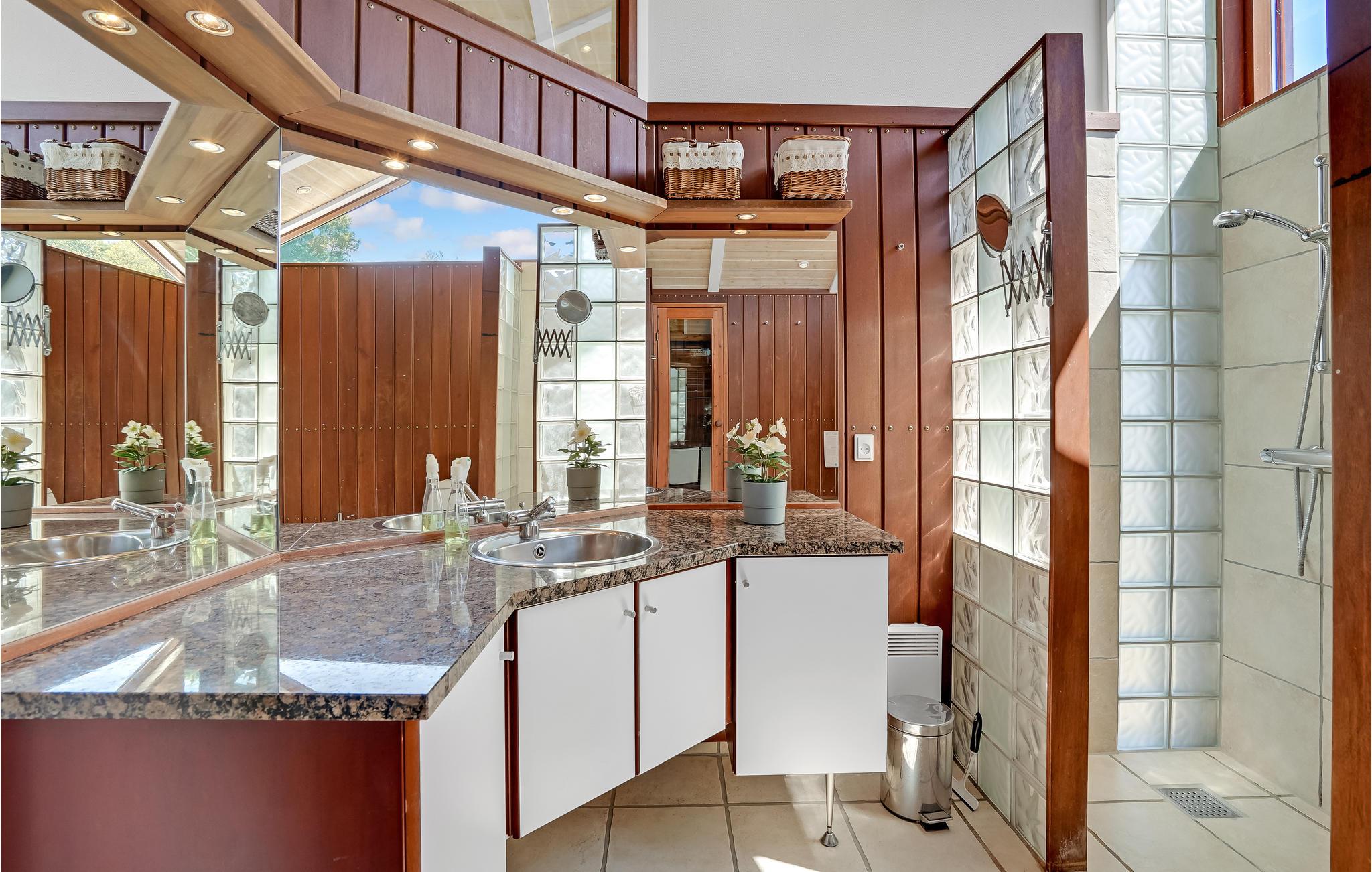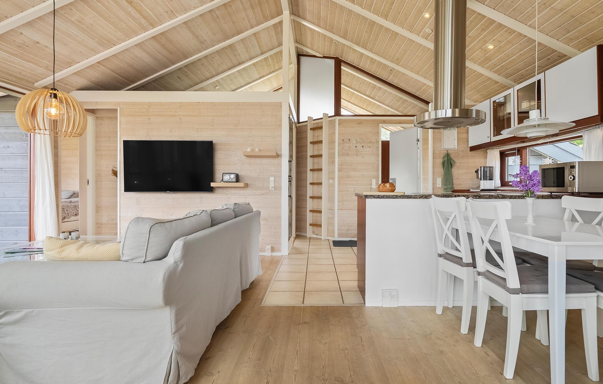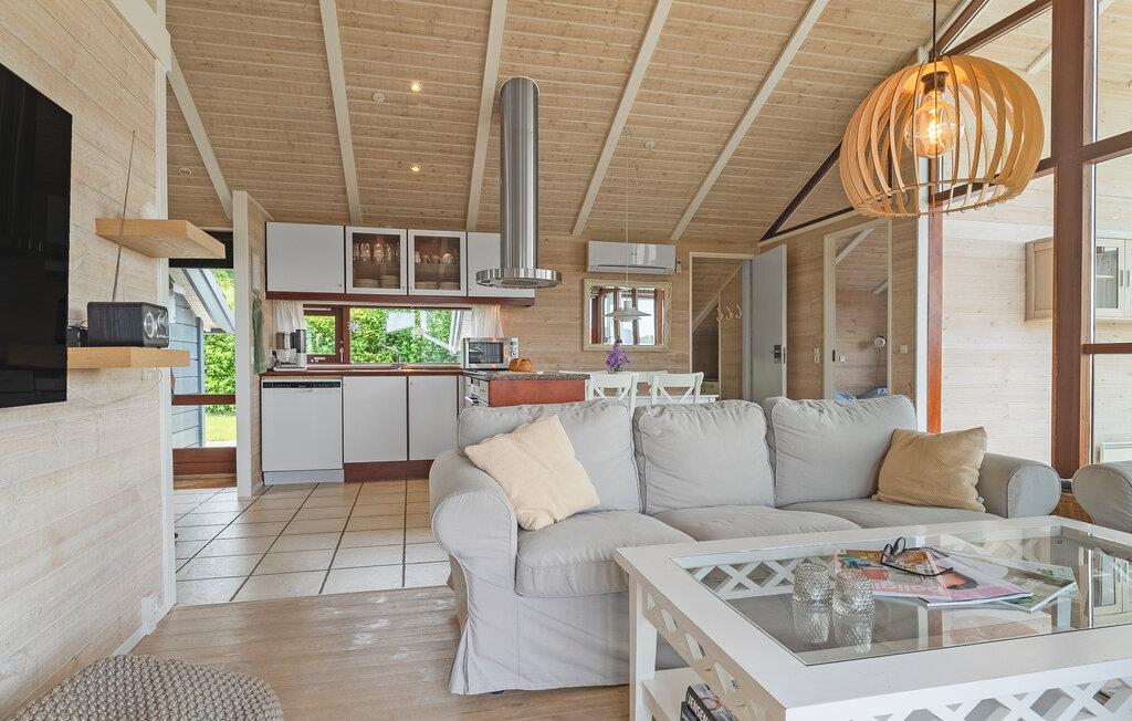 Dette sommerhus er lyst og hyggeligt indrettet. Køkken og stue er integreret i samme rum, så begge steder nyder I godt af det smukke lysindfald. Ud over spabadet på badeværelset er der også sauna, brændeovn til de kolde måneder og klimaanlæg til de varme sommerdage.