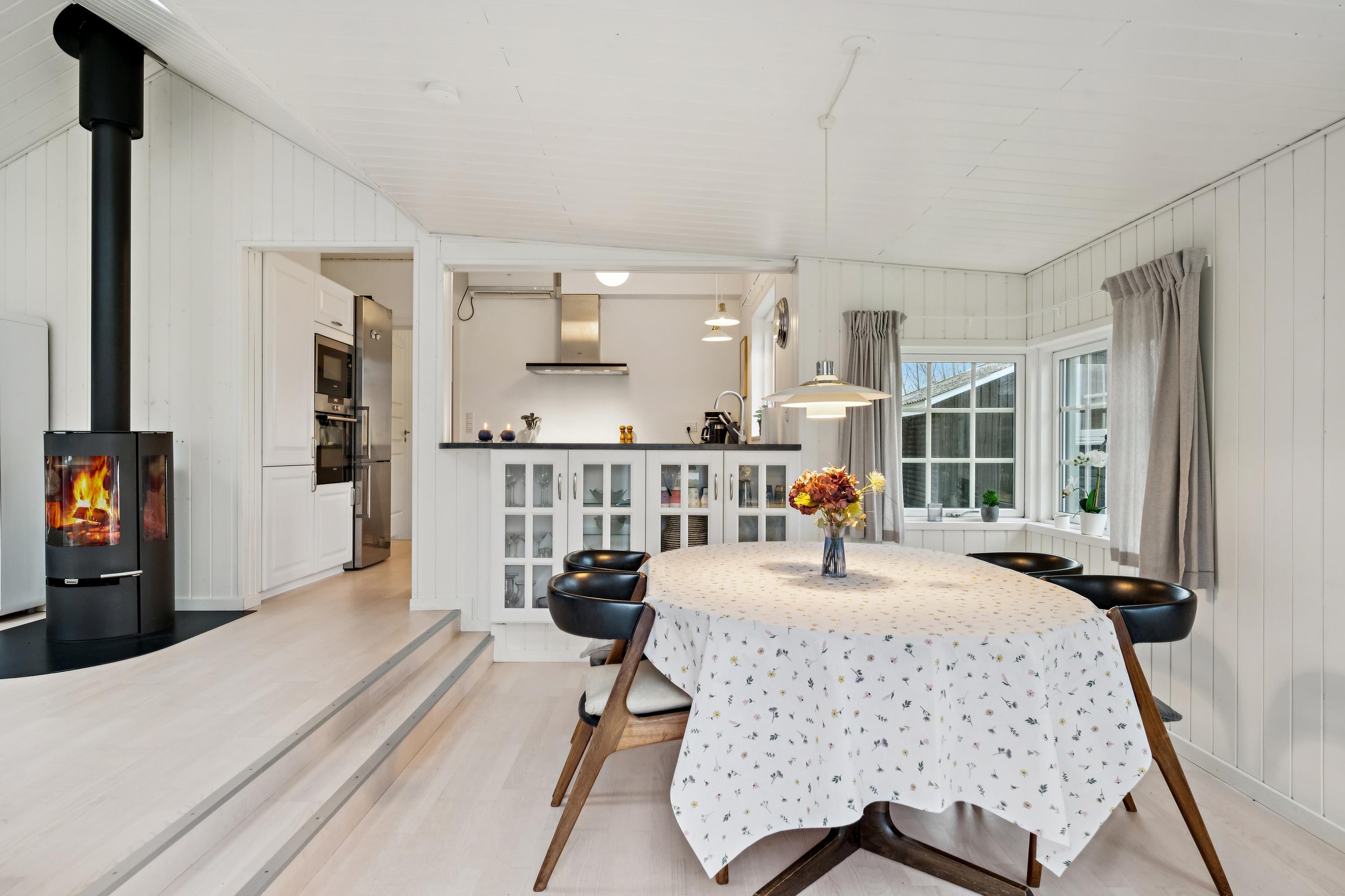 Tæt på en af Jyllands bedste badestrande finder man dette hyggelige feriehus. Her bliver man budt indenfor i en dejlig stue i to plan. Hyggelig møbleret opholdsstue med brændeovn og varmepumpe med udgang til terrasse samt en god spiseafdeling. Flot køkken med b.la. opvaskemaskine. Husets sovepladser finder man i tre værelser. Stort badeværelse med bruseniche, gulvvarme og vaskemaskine samt udgang til haven. Ved huset er der flere terrassearealer med havemøbler og overdækket veranda. Stor græsplæne velegnet til leg og udendørsaktiviteter.