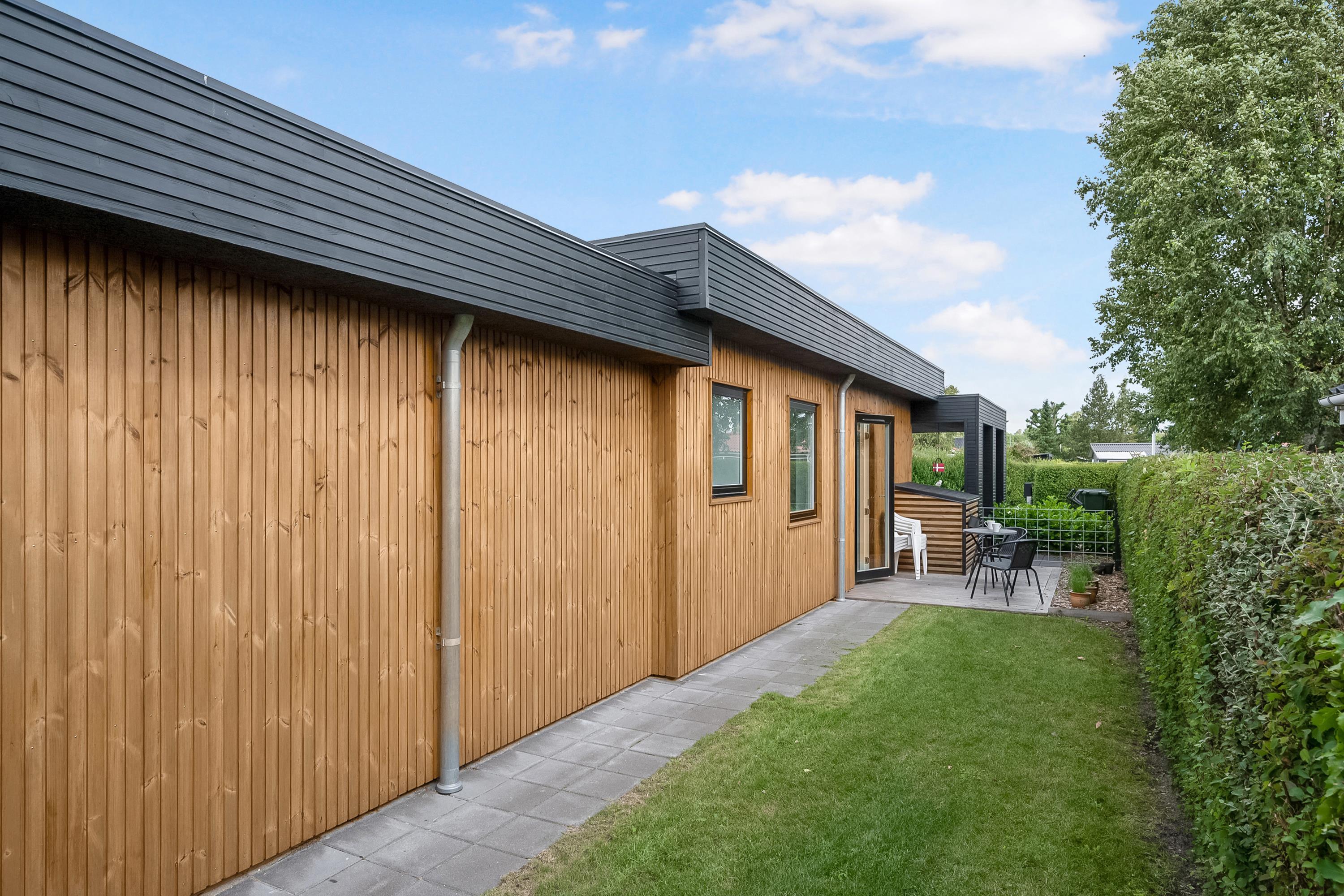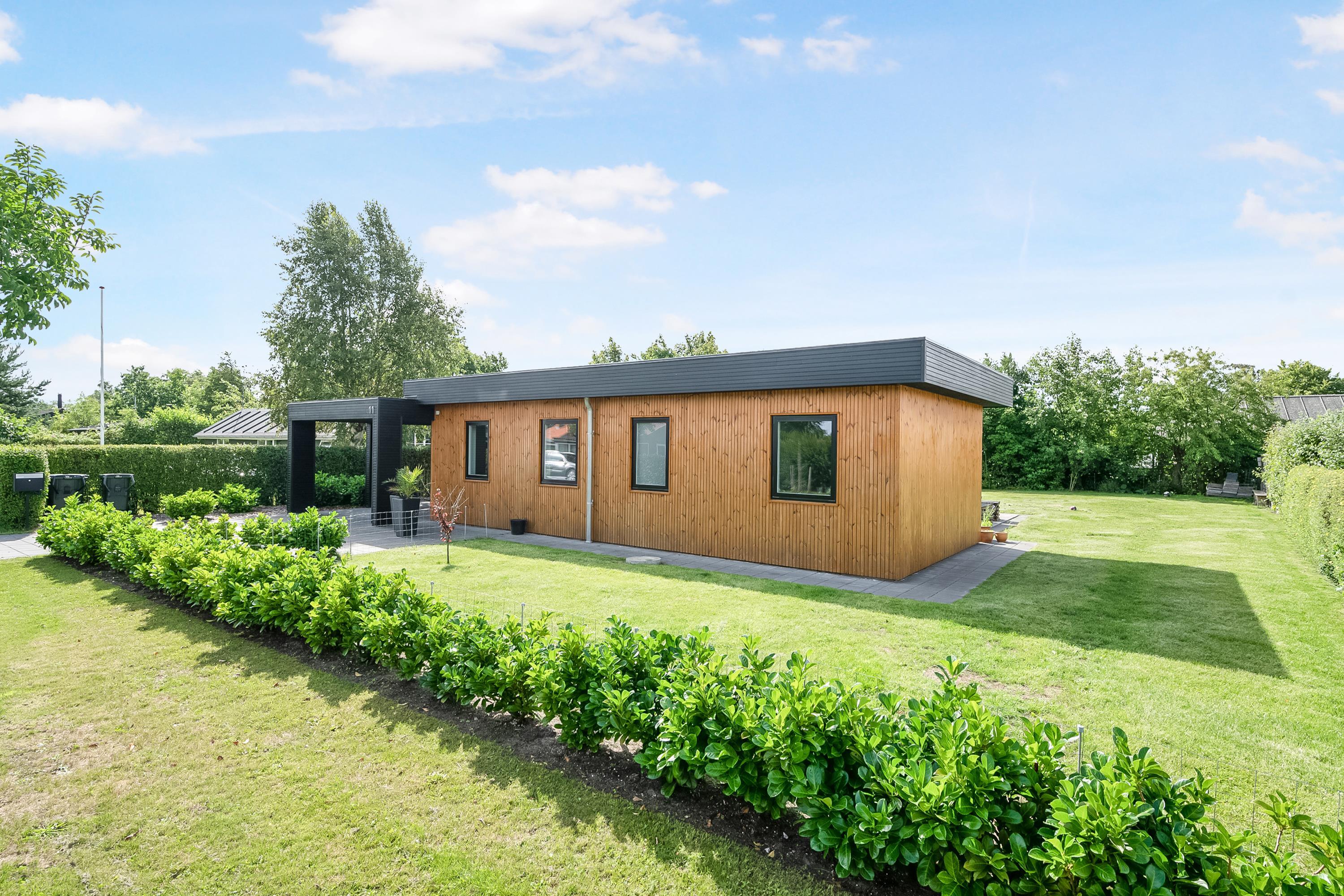 Tæt på en af Jyllands bedste badestrande, finder man dette rummelige og flotte feriehus bygget i 2021. Her finder man en dejlig lys stue, hyggelig indrettet med gode møbler. I forbindelse med stuen finder man det flotte og velindrettede køkken og en stor spiseafdeling med masser plads. Både fra køkken og stue er der udgang til skønne terrassearealer- både åben og overdækket med havemøbler og grill. Huset indeholder to værelsesafdelinger, i alt fire dejlige soveværelser, hvoraf to værelser er med enkelt senge (kan skubbes sammen) og to værelser med dobbeltsenge. Flot badeværelse med bruseniche samt et gæstetoilet. I den store entre er der både vaskemaskine og tørretumbler til rådighed. Huset er beliggende på en skøn og velplejet grund med stor græsplæne, velegnet til leg og boldspil. Her finder man et hyggeligt bålsted, hvor man en lun sommeraften kan sidde og lave snobrød. Er man et udendørs menneske, kan man også vælge at sove i det hyggelige shelter.