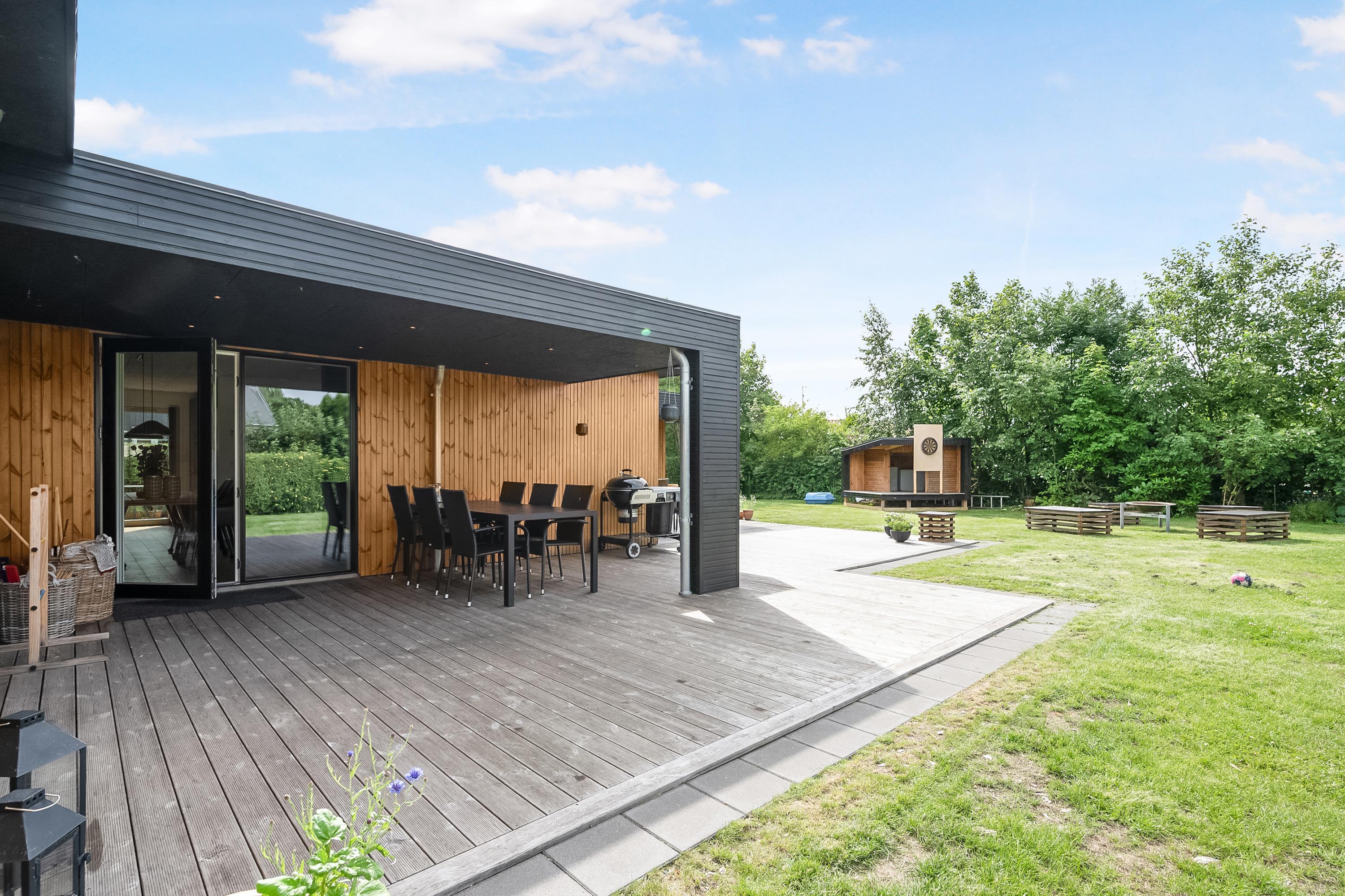Rummeligt feriehus nær Grenaa Strand med fire soveværelser, stor terrasse og hyggeligt bålsted.