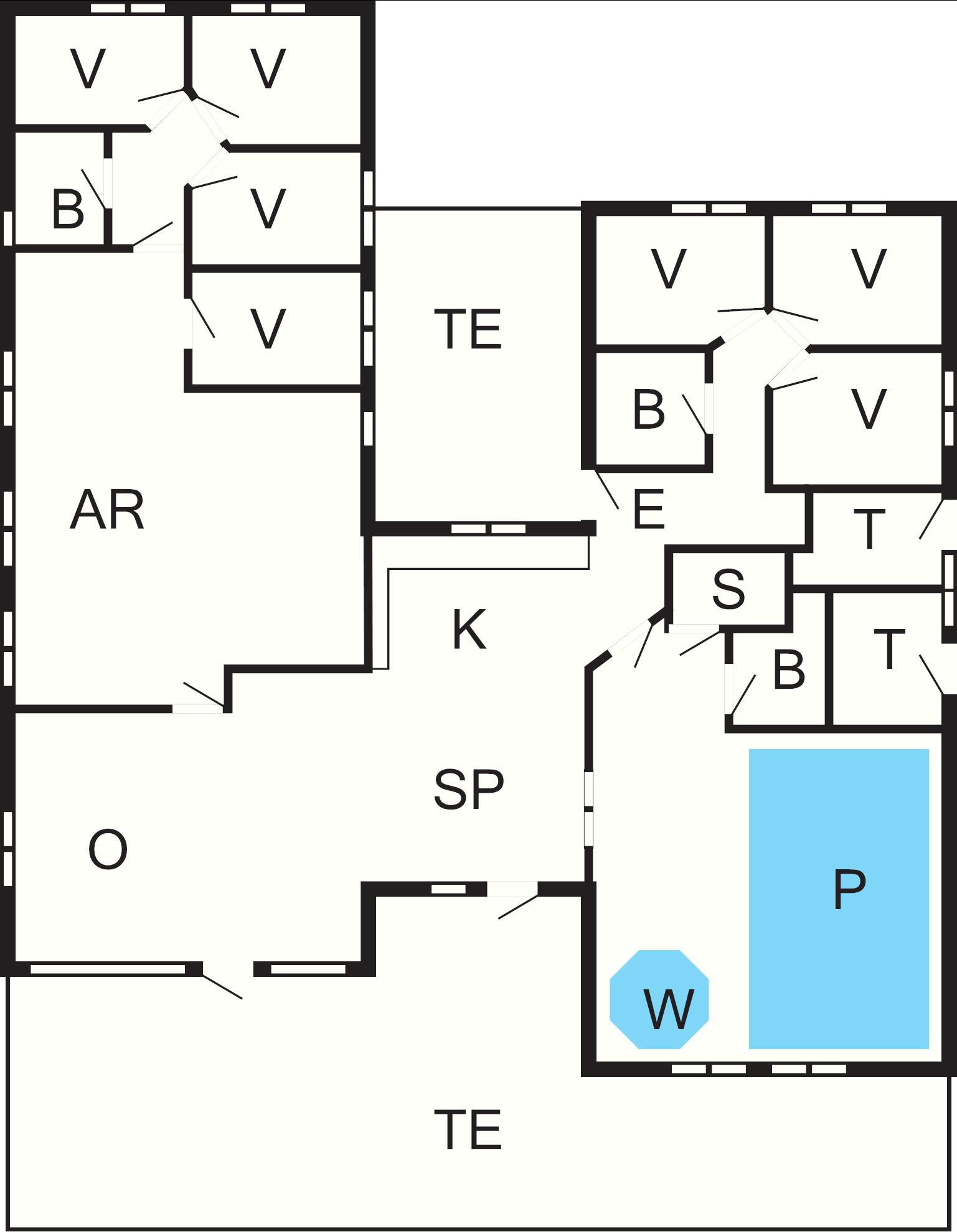 Huset er yderst rummeligt og veldimensioneret og bygget op omkring to separate soveafdelinger. Hver afdeling har et badeværelse, og der er et ekstra badeværelse i forbindelse med poolafdelingen. I alt tre badeværelser, der selvfølgelig alle har gulvvarme. Huset opvarmes i øvrigt med el-varme og energibesparende varmepumpe.