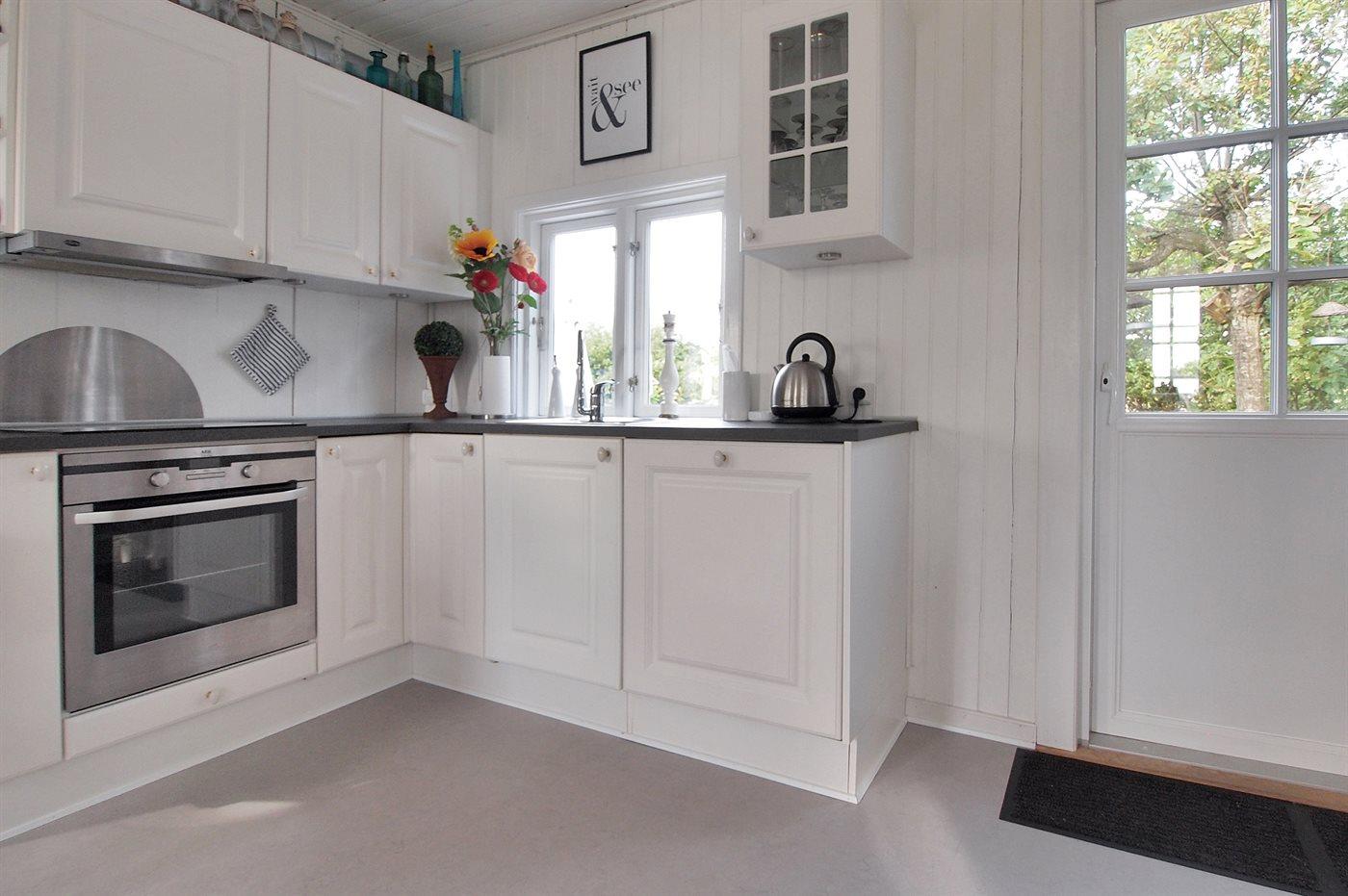 Køkkenet er udstyret med 1 køleskab. Der er 4 keramiske kogeplader, varmluftovn, mikrobølgeovn samt opvaskemaskine.