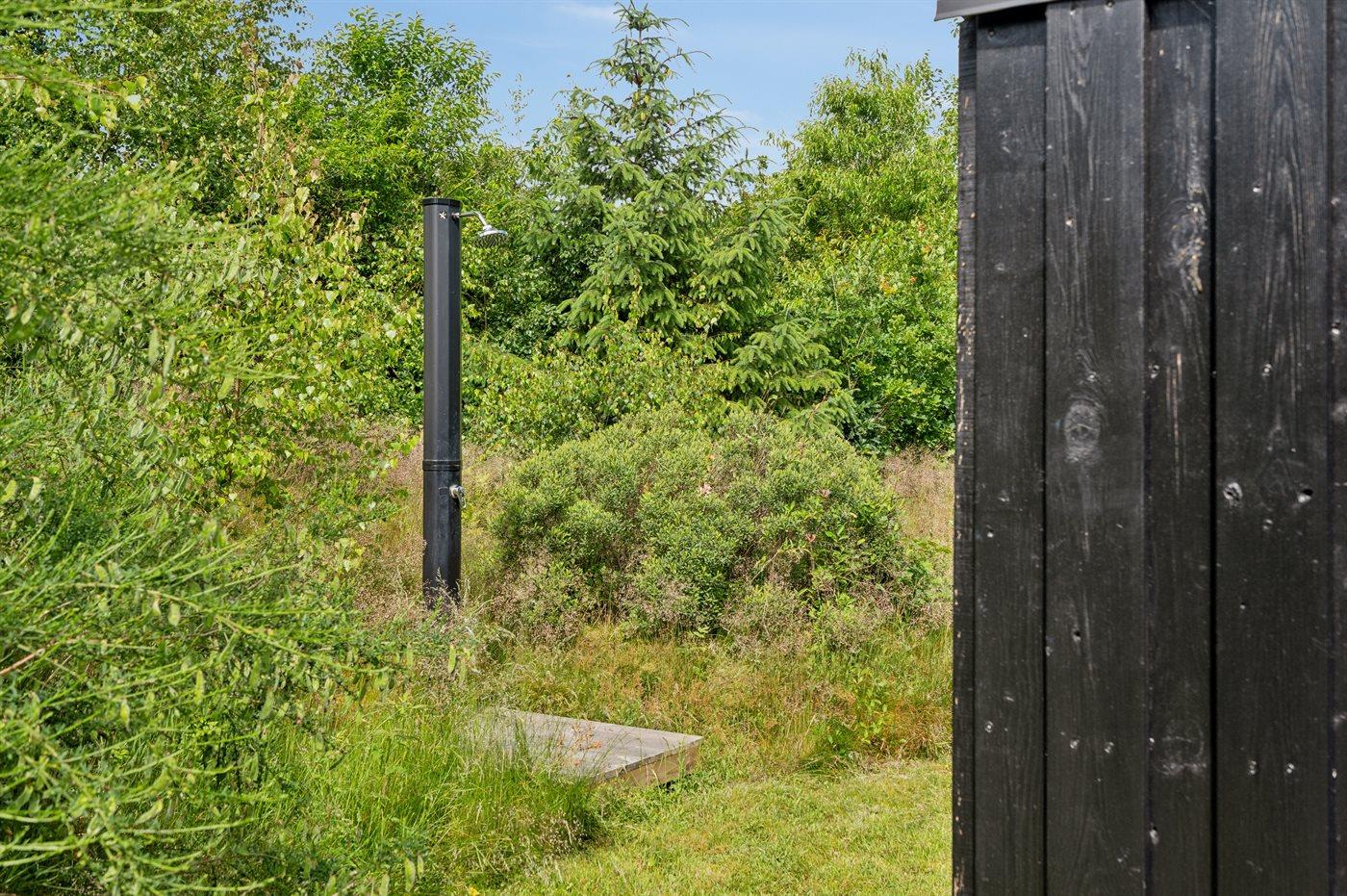 Den 2900 m² store havegrund er et kapitel for sig – et privat, grønt åndehul med plads til både leg, afslapning og lange sommerdage under åben himmel. Her finder du solrige terrasser, en overdækket terrasse til de stille aftener, udendørs bruser til stranddagene og en grill, der indbyder til feriemiddage i det fri. Havet og nærmeste indkøb ligger blot 600 meter væk, og der er parkering ved huset.