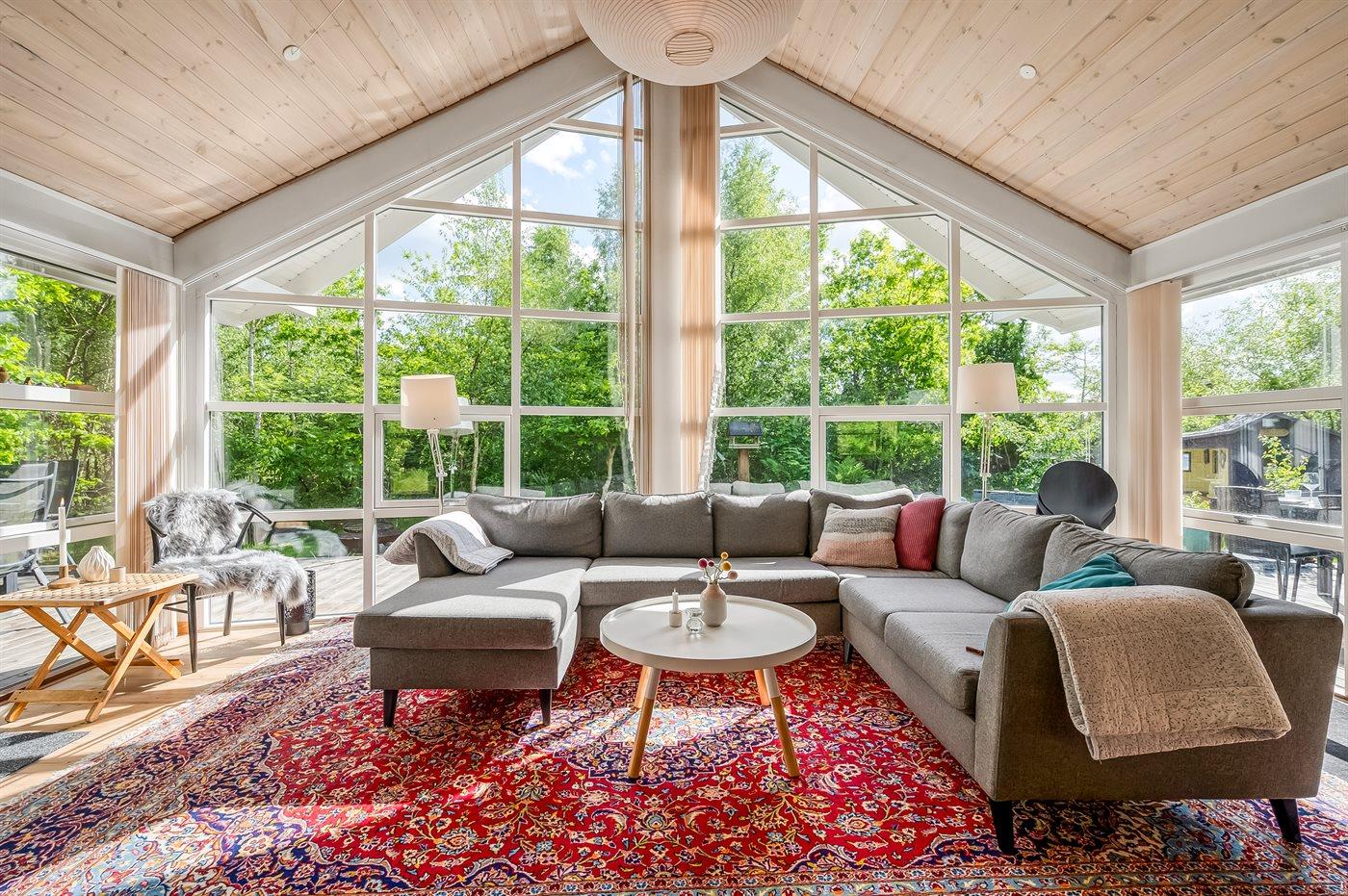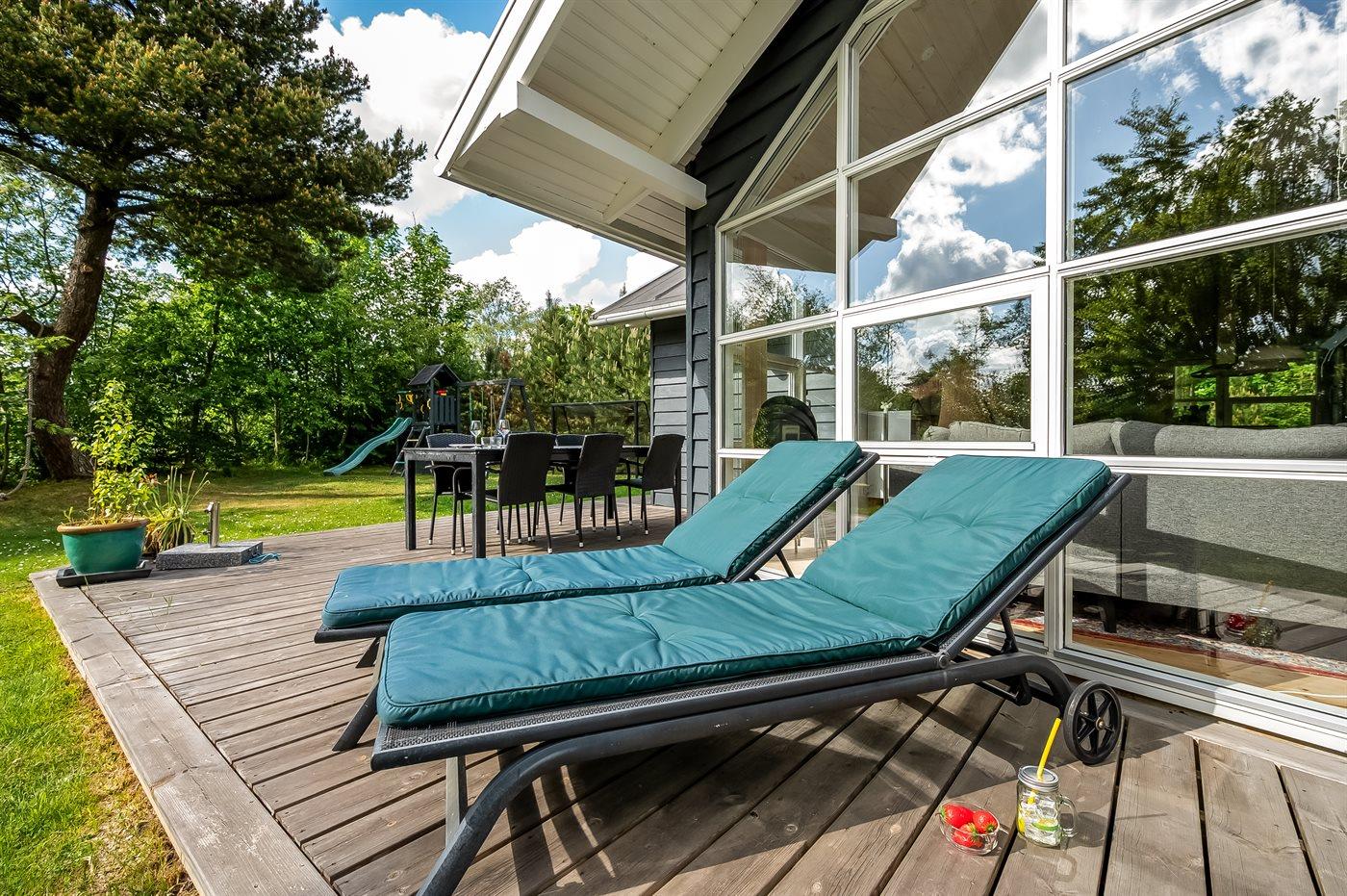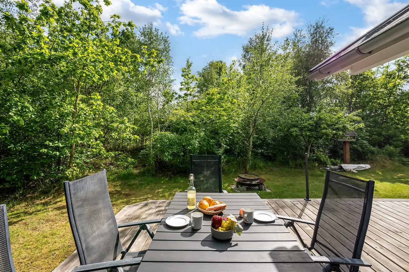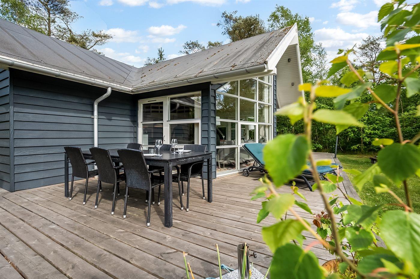 Der findes et skønt terrasseareal på begge sider af huset, hvor man kan sidde i helt ugenerte omgivelser og nyde stilheden og de smukke omgivelser med et glas god vin eller en kop kaffe. Tilmed er terrassen også delvist overdækket, således de skønne sommeraftener kan forlænges.