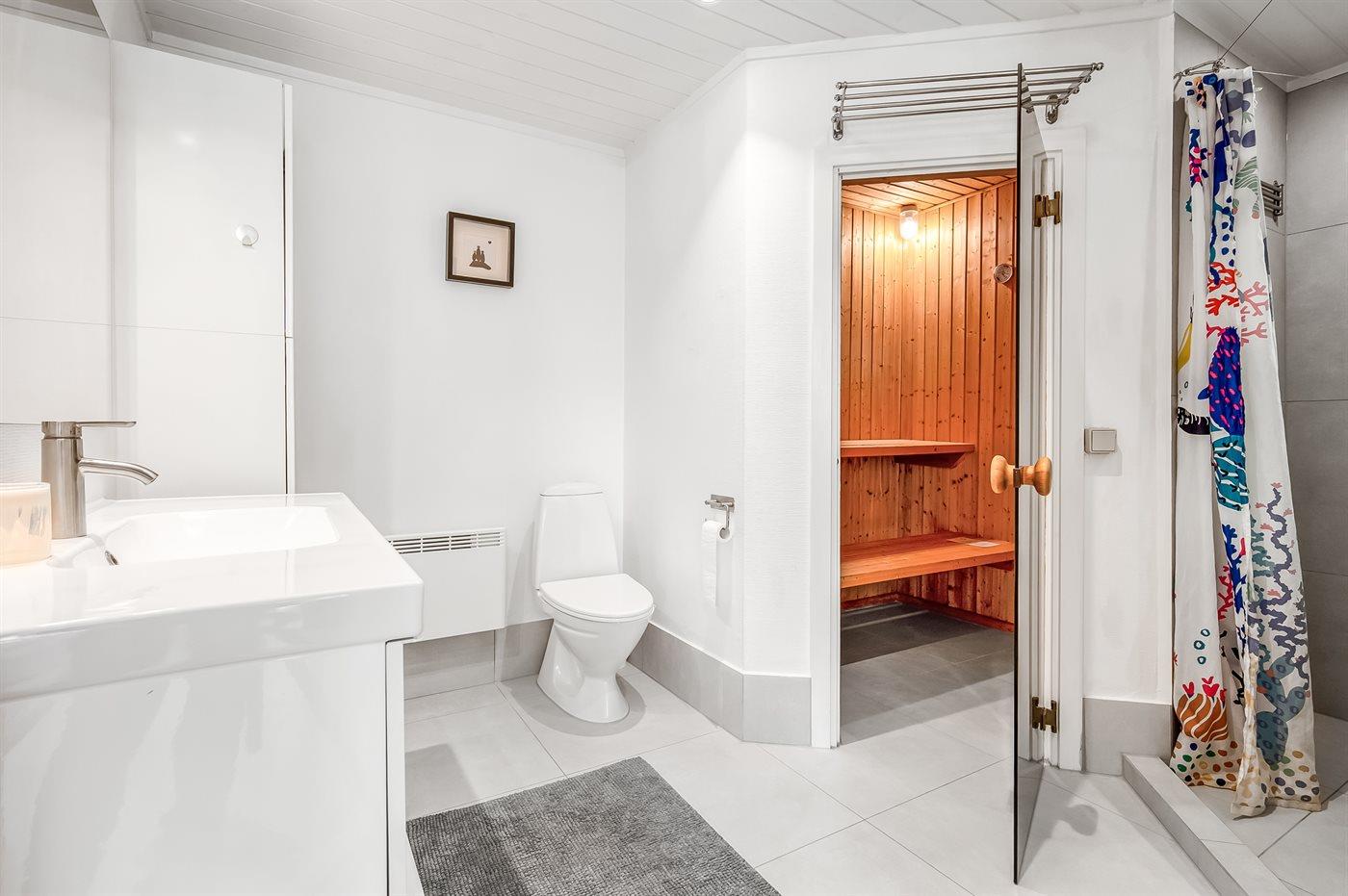 Der er 1 badeværelse med bruseniche og 1 toilet.. Der er gulvvarme på 1 badeværelse. I saunaen er der mulighed for afslapning.