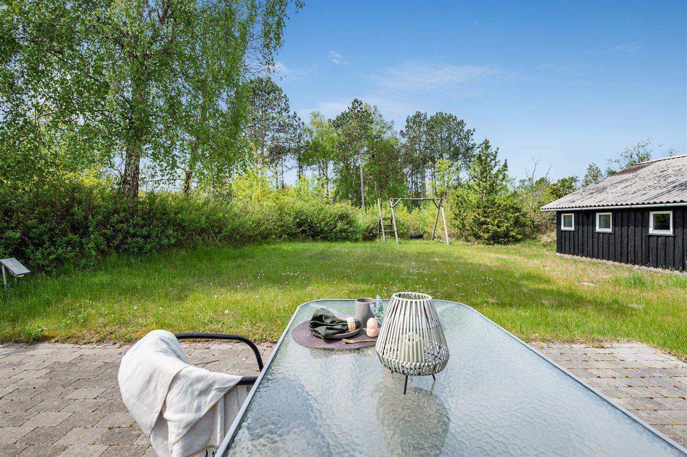 Ferieboligen er beliggende på en 2505 m² stor naturgrund. Der er 600 m til havet. Nærmeste forretning er beliggende i en afstand af 3500 m. Til ferieboligen hører åbent terrasseareal. Ligeledes er der adgang til udestue. Sandkasse. Der er installeret stik til opladning af elbil. Type 2 stik. Med 11 kW ladeeffekt. Parkering ved ferieboligen.