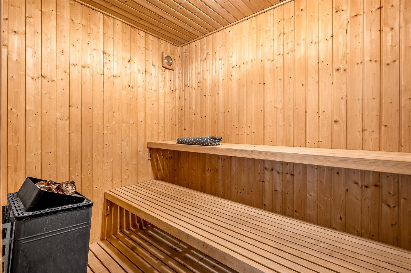 Der er 2 badeværelser med bruseniche og 2 toiletter. Der er gulvvarme på 2 badeværelser. I saunaen er der mulighed for afslapning.