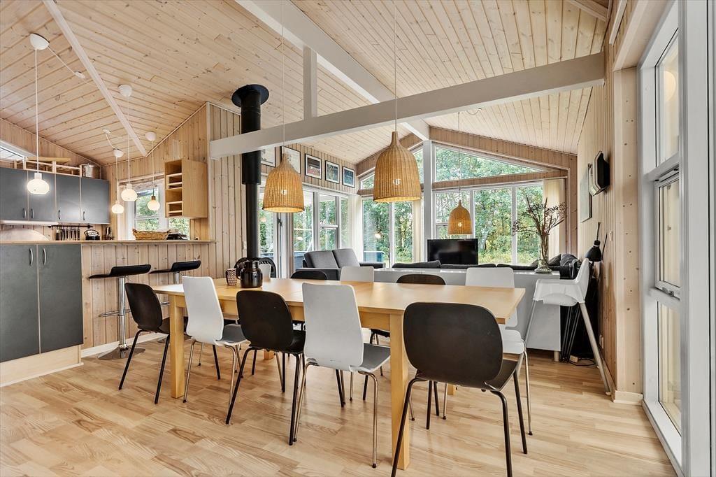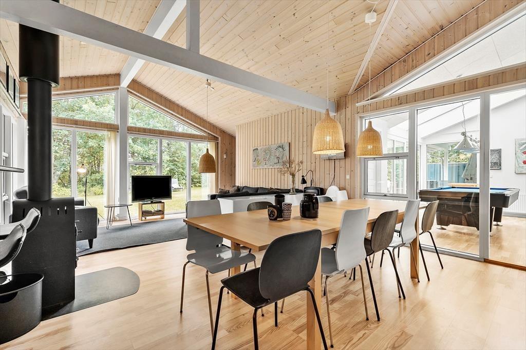 Velkommen indenfor i dette dejlige sommerhus, hvor det er rart at være mange og hvor I kan trække stikket, samle familien og nyde hinandens selskab i smukke omgivelser. Huset er fra 2007 og nymalet udenfor. Inde går lofterne til kip, hvilket giver en god rumfornemmelse og store vinduer gør huset lyst. I kan være 10 personer og 3 husdyr i huset, hvilket gør det ideelt til store familier med børn i alle aldre. Sommerhuset byder på fire rummelige soveværelser samt en hyggelig alkove, hvor du kan finde ro. Her er et aktivitetsrum med billardbord, hvor I kan tilbringe mange sjove timer sammen. To gode badeværelser, hvoraf det ene er udstyret med en spa, hvor du kan bade og boble efter en dejlig feriedag. Efter en smuk tur langs vandet og klitterne, hvor du har fået masser af vind i kinderne, kan du nyde den varme sauna. Huset har gulvvarme overalt, hvilket skaber en behagelig atmosfære, uanset årstiden. I den hyggelige stue er der en brændeovn, der spreder varme og hygge, når mørket falder på og på kølige aftener. Med TV i 3 rum er der gode muligheder for at følge med i yndlingsprogrammerne, selv når I er mange sammen. Endelig er der det veludstyrede køkken og det praktiske bryggers, hvor der både er vaskemaskine og tørretumbler. Huset er netop blevet malet sort.
