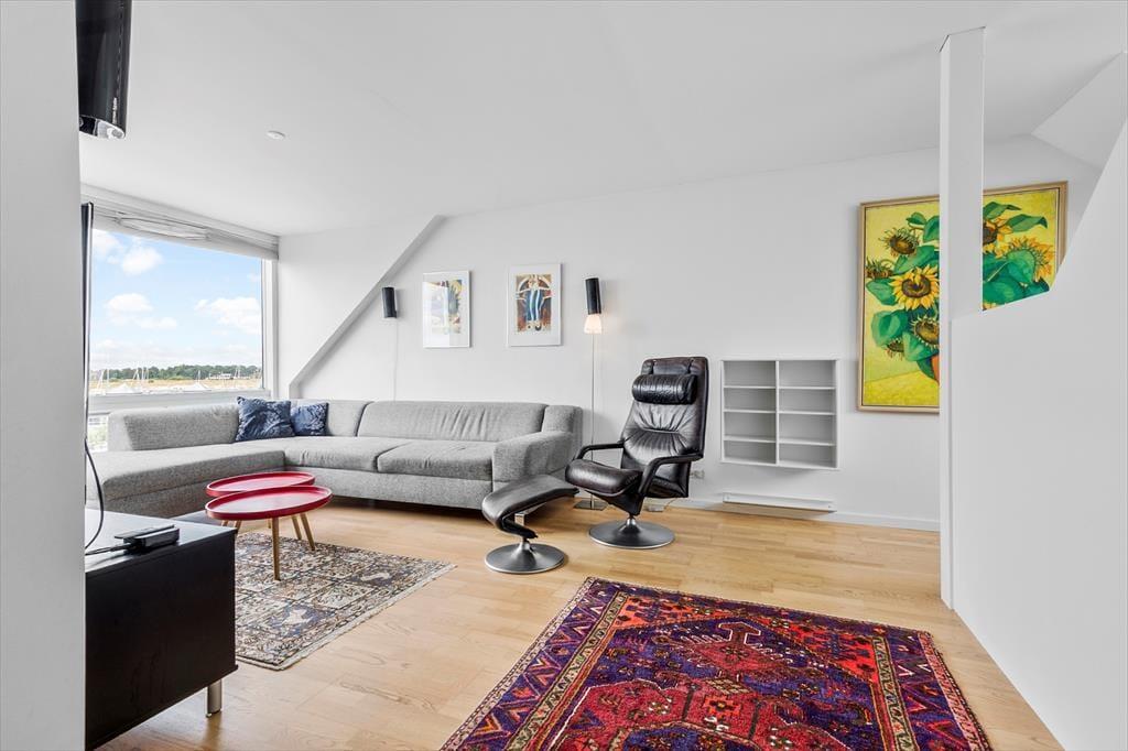På første sal samles hele opholdslivet i ét stort og indbydende rum, hvor lyset og udsigten til vand, master og åben himmel brager ind. Her er et herligt køkken, stort spisebord til lange feriemiddage, en hyggelig sofagruppe og et generøst hjørne indrettet med plads til at være kreativ, spille, arbejde eller bare dagdrømme. Fra dette skønne opholdsrum er der udgang til to dejlige udsigtsterrasser, hvor du kan følge solen fra morgen til aften.