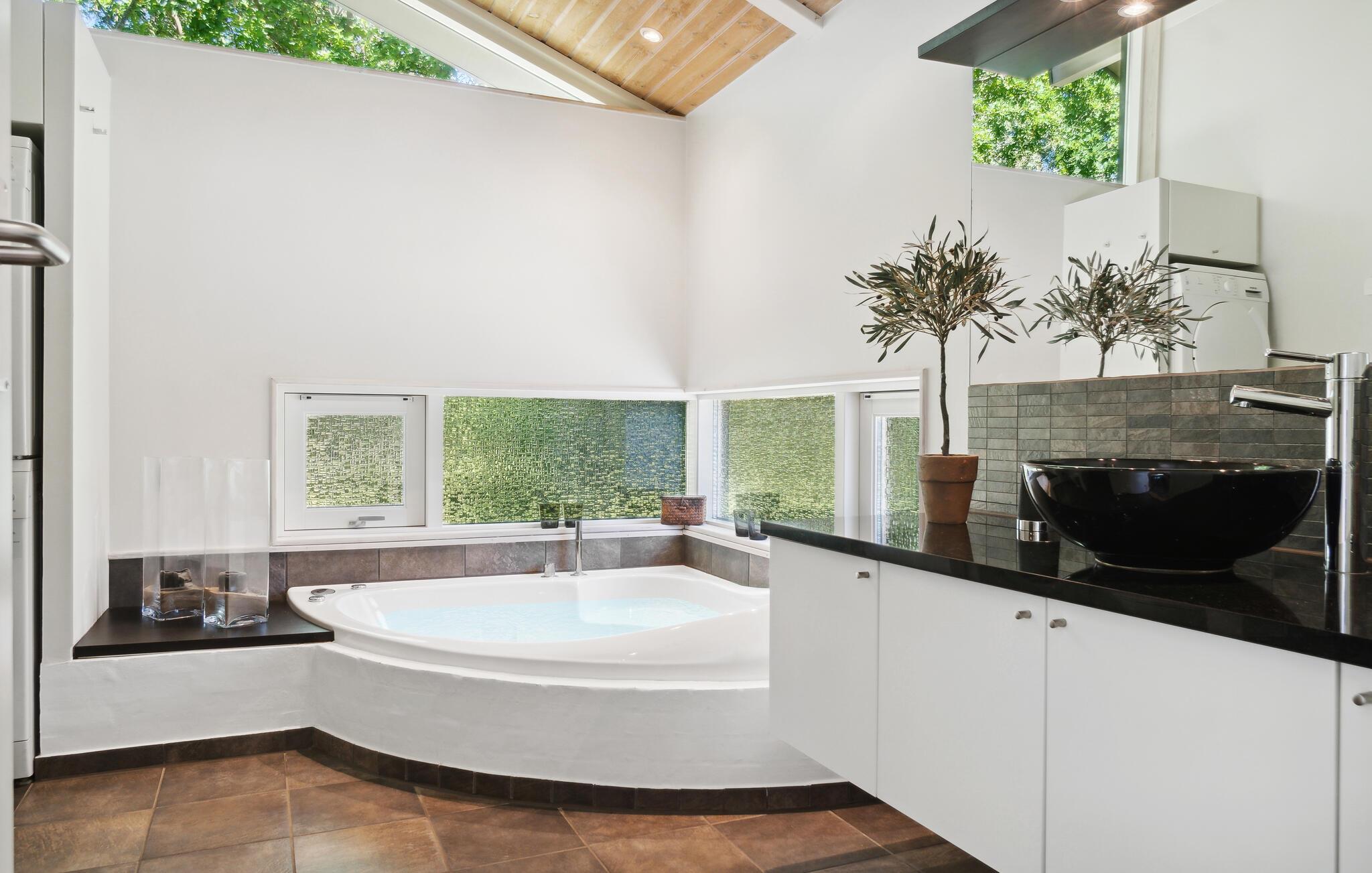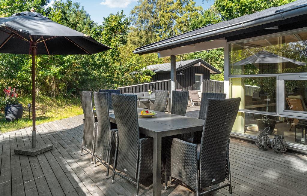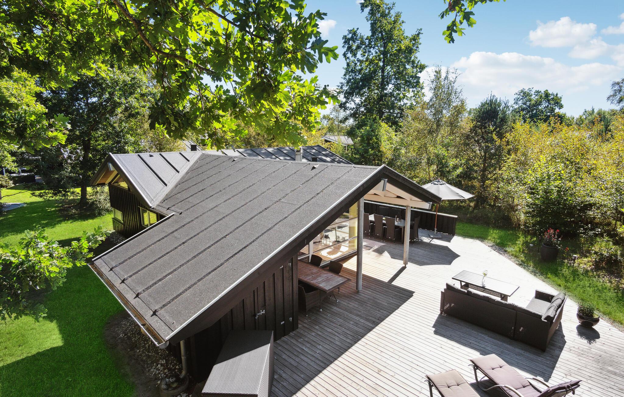 Flot arkitektonisk feriehus nær Grenå Strand med stor terrasse og nærhed til by og sandstrand.