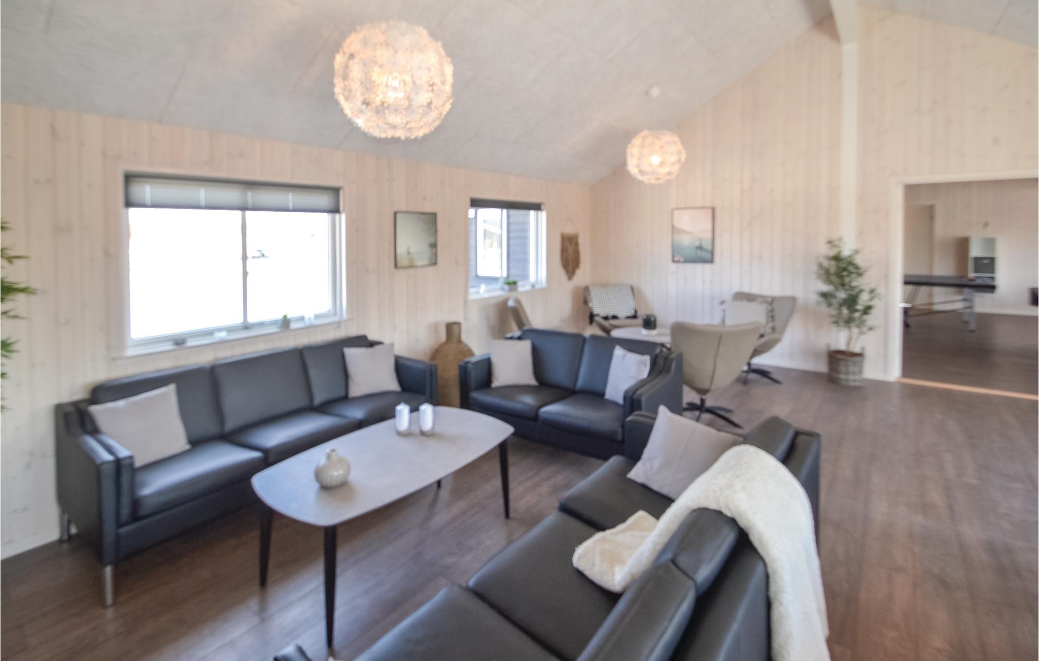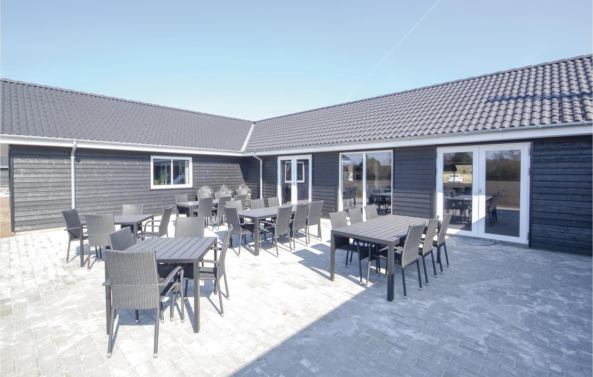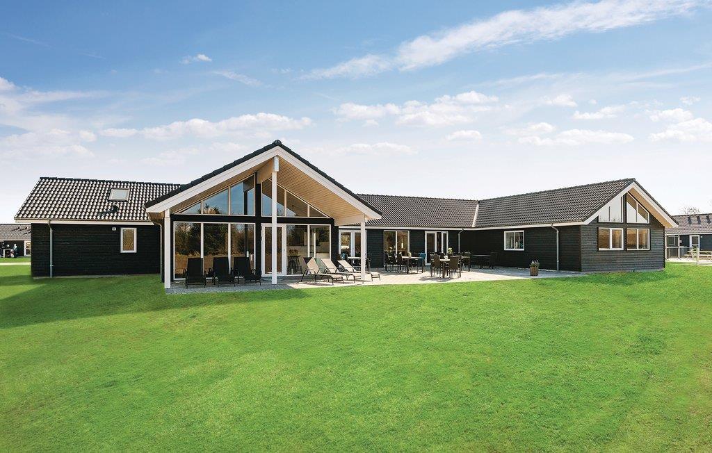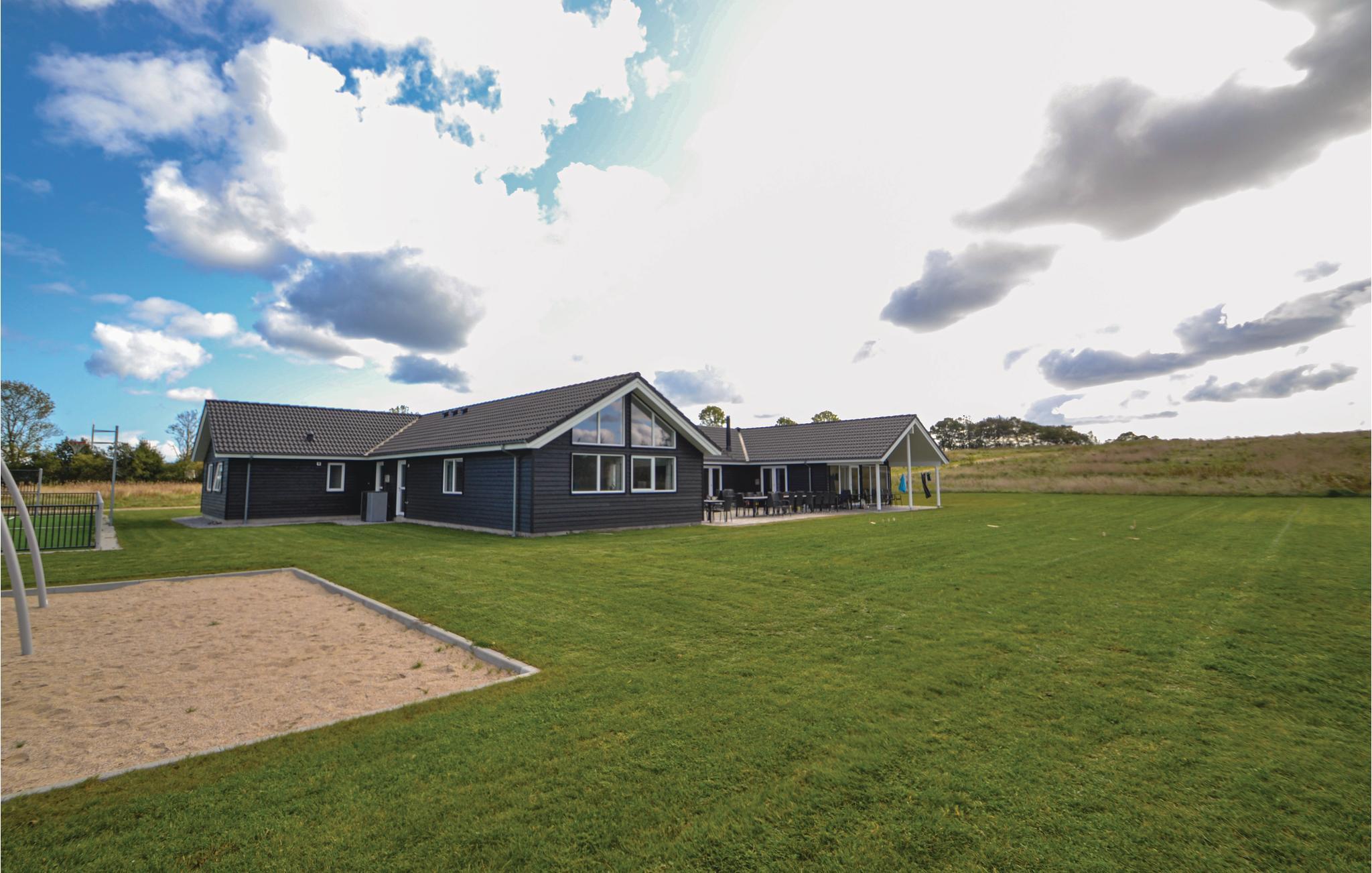 I den hyggelige sofakrog i det centrale fællesrum kan der slappes af foran fjernsynet efter en aktivitetsfyldt dag. I køkken-alrummet er der desuden et langt spisebord med plads til alle og et velindrettet køkken. Her er selvfølgelig dobbelt op på ovne, kogeålader og opvaskemaskiner, så det bliver lettere at lave mad til mange mennesker. Huset har i alt 30 sovepladser, som er fordelt på fire soveafdelinger med hver tre soveværelser og et badeværelse og to hemse med plads til i alt seks overnattende gæster (bedst til børn). I alt har sommerhuset fem badeværelser. På den store og delvist overdækkede terrasse kan I grille og nyde den danske sol. Her er også en sandkasse og en trampolin. Huset er udstyret med ladestik til Elbiler.