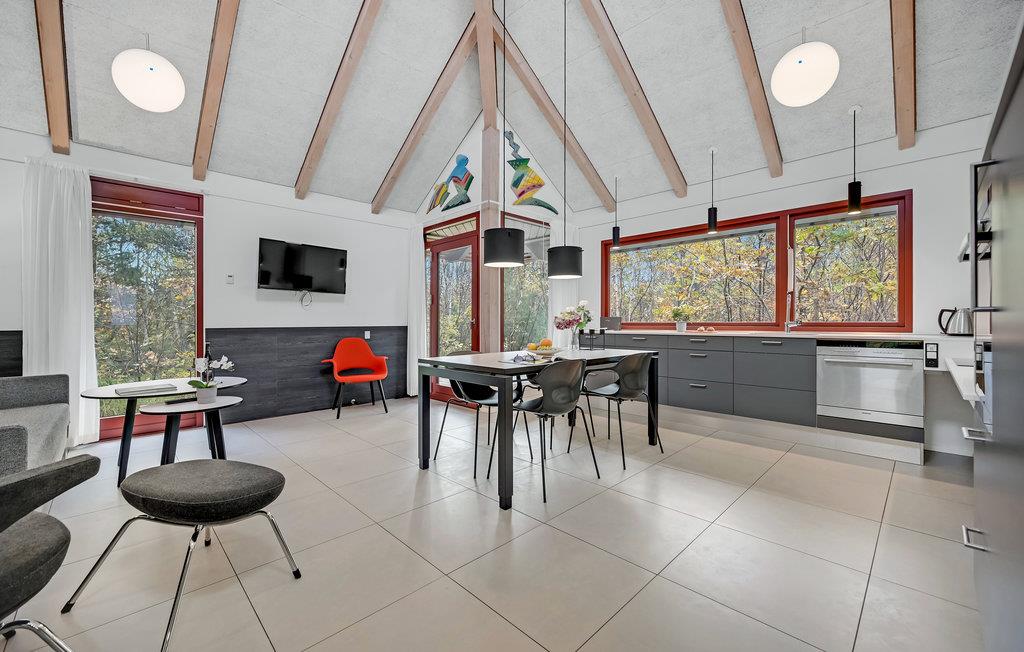 Dette lyse, indbydende og praktiske sommerhus byder op til fem gæster og et barn velkommen. Det har en hyggelig stue med køkken, hvor I kan slappe af foran brændeovnen. Der strømmer dejligt meget lys ind gennem de store vinduespartier.