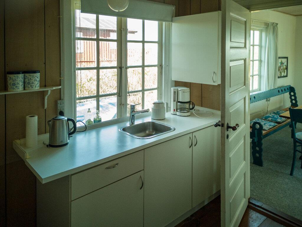 Køkkenet indeholder, hvad I har brug for til den daglige madlavning. Der er badeværelse med brusebad. Huset er delvist opvarmet med elradiator og herudover er der i 2020 installeret en varmepumpe, der giver god opvarming og bedre indeklima. Brændeovnen er en lukket ovn af typen, der minder om en kakkelovn, og som det tager lidt tid af få til at give varme. Et skønt hus på aller tider af året, men i vinterhalvåret skal man være opmærksom på at huset er ældre og ikke fuldt isoleret.