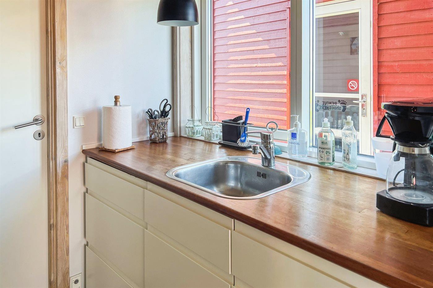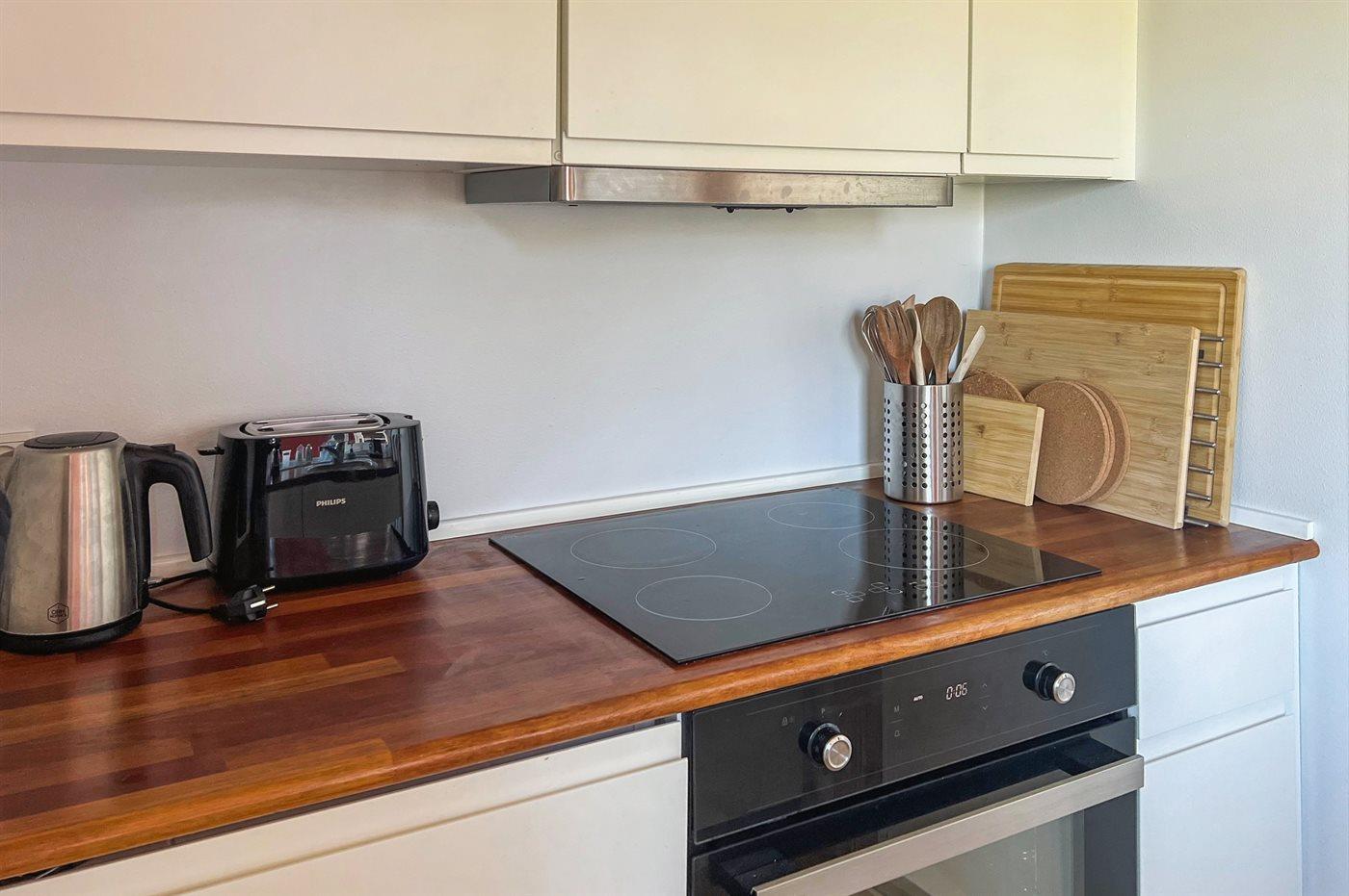 Køkkenet er udstyret med 1 køleskab. Der er 4 keramiske kogeplader, varmluftovn samt opvaskemaskine.