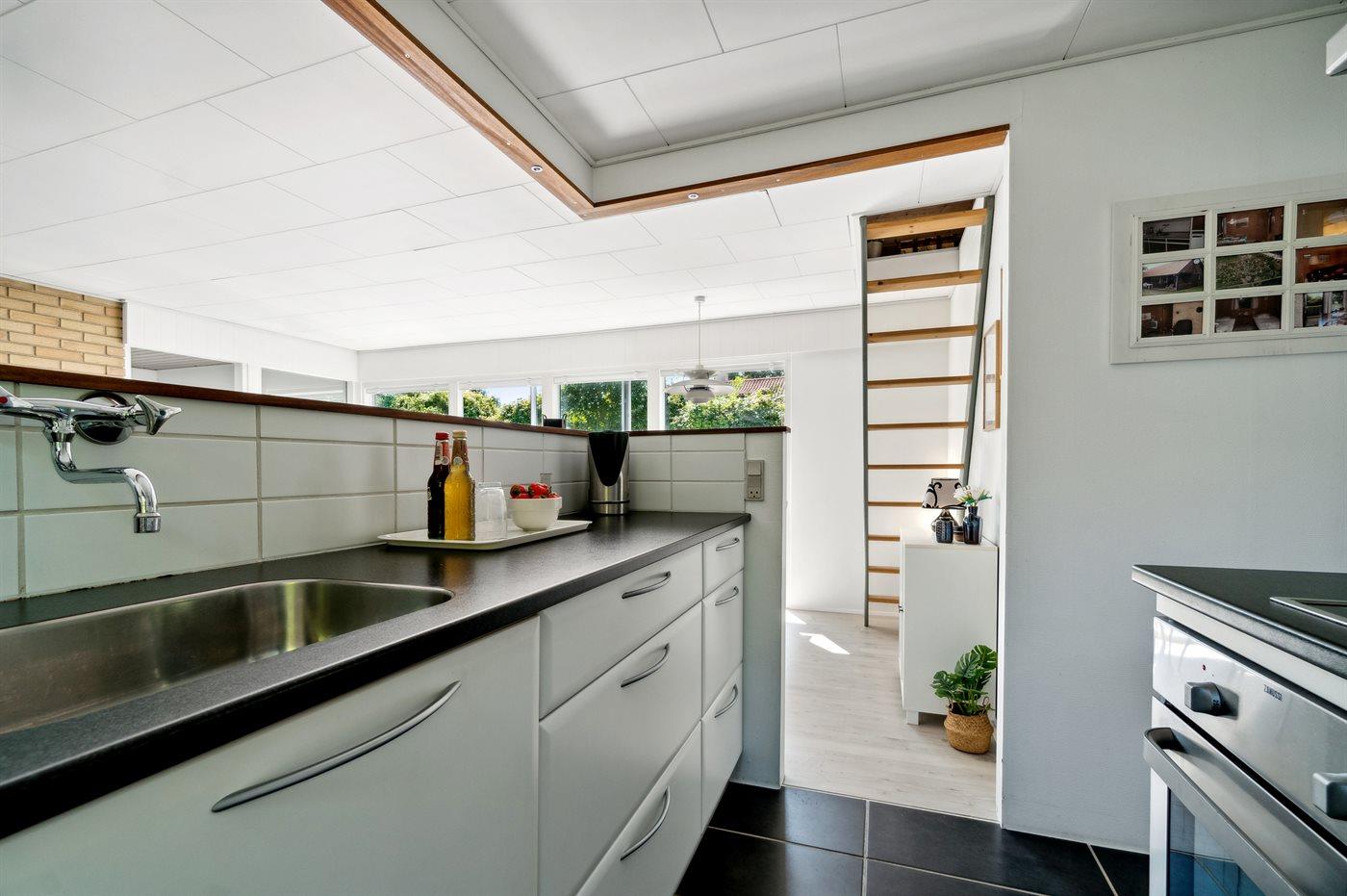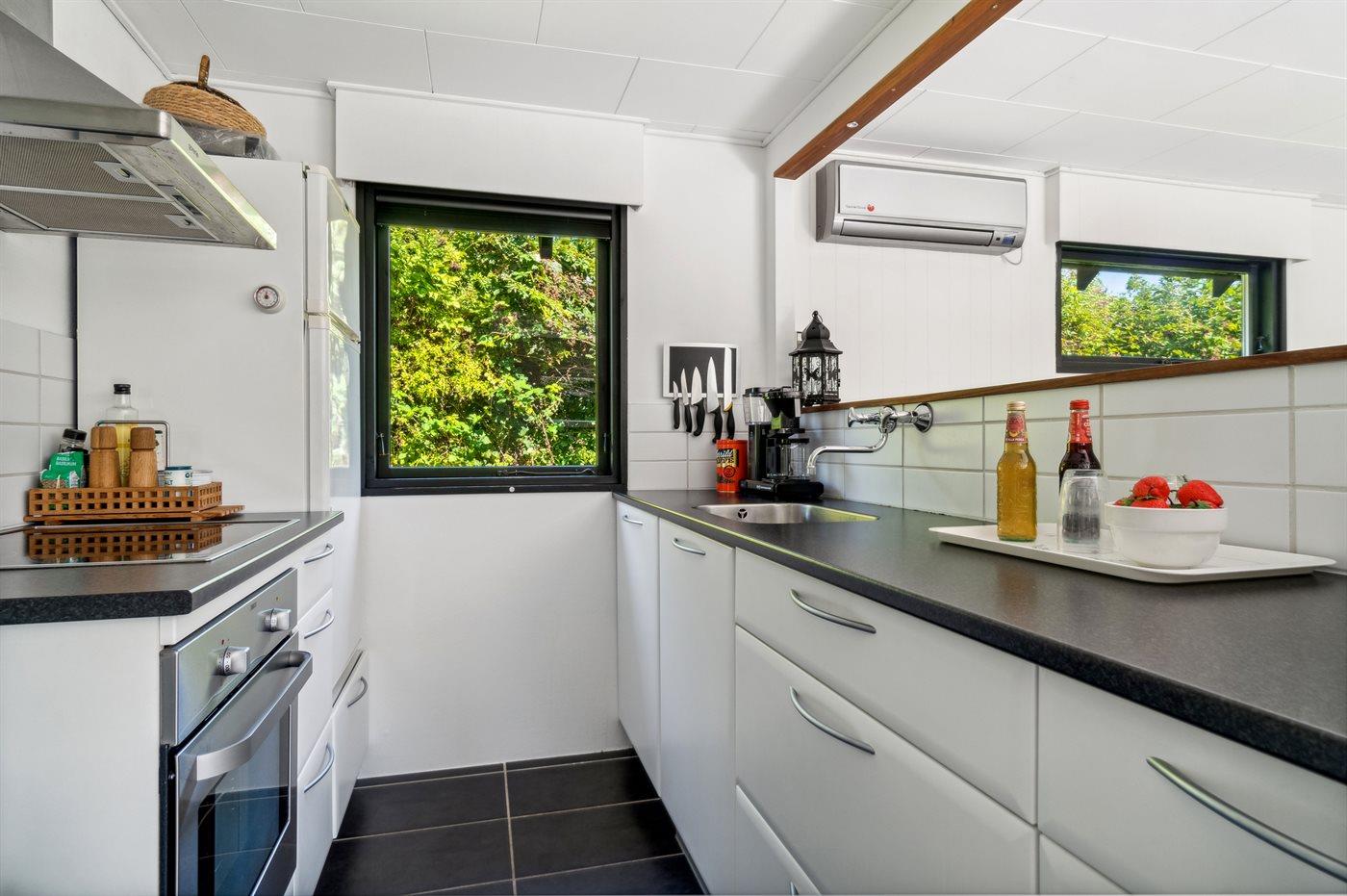 Køkkenet er udstyret med 1 køleskab. Der er 4 keramiske kogeplader, varmluftovn samt opvaskemaskine.