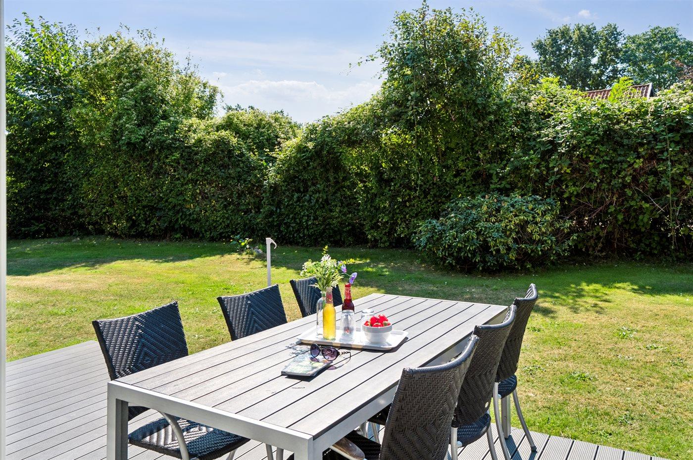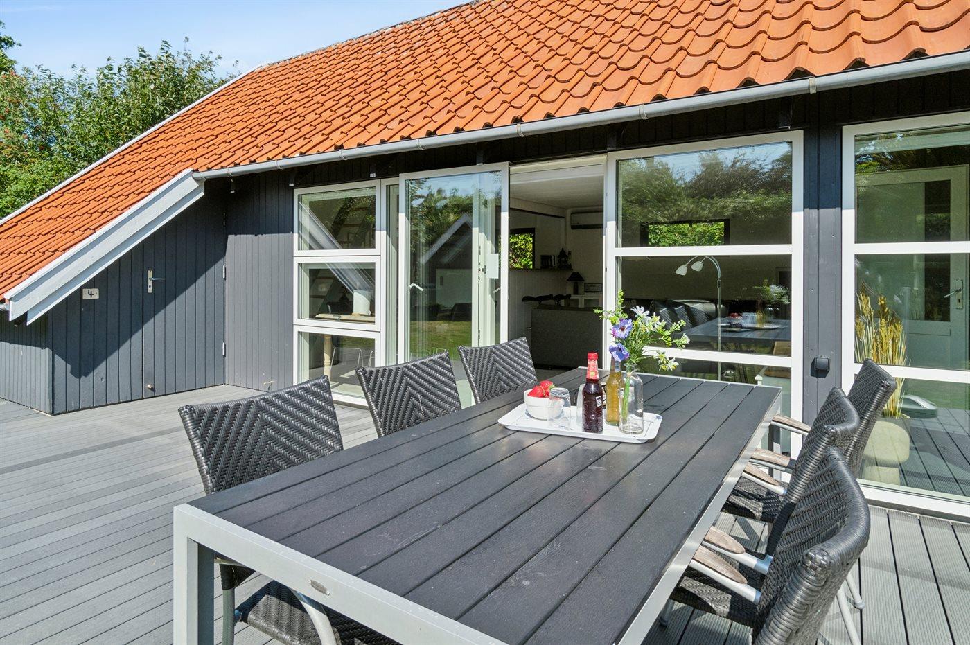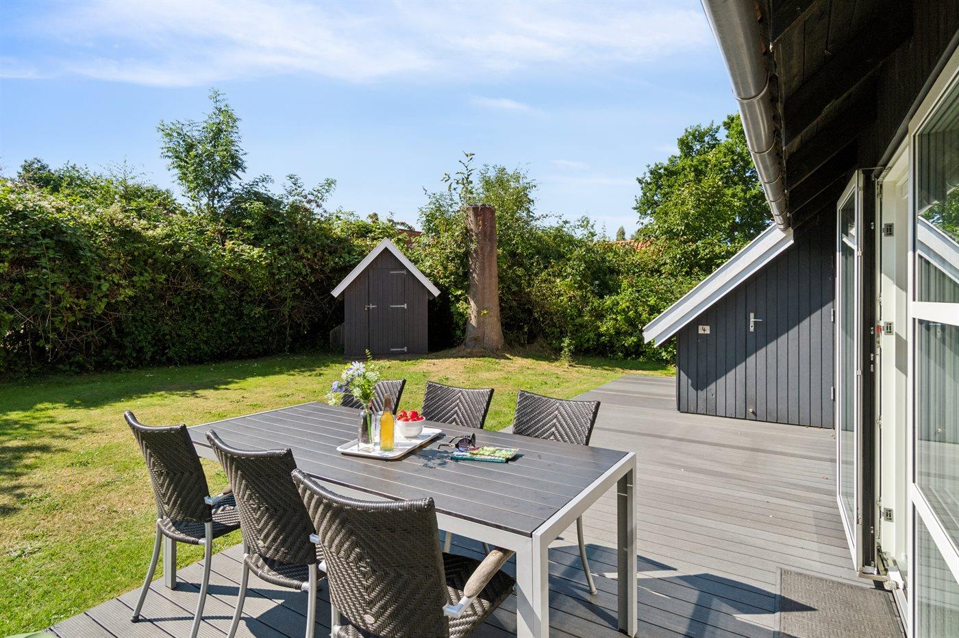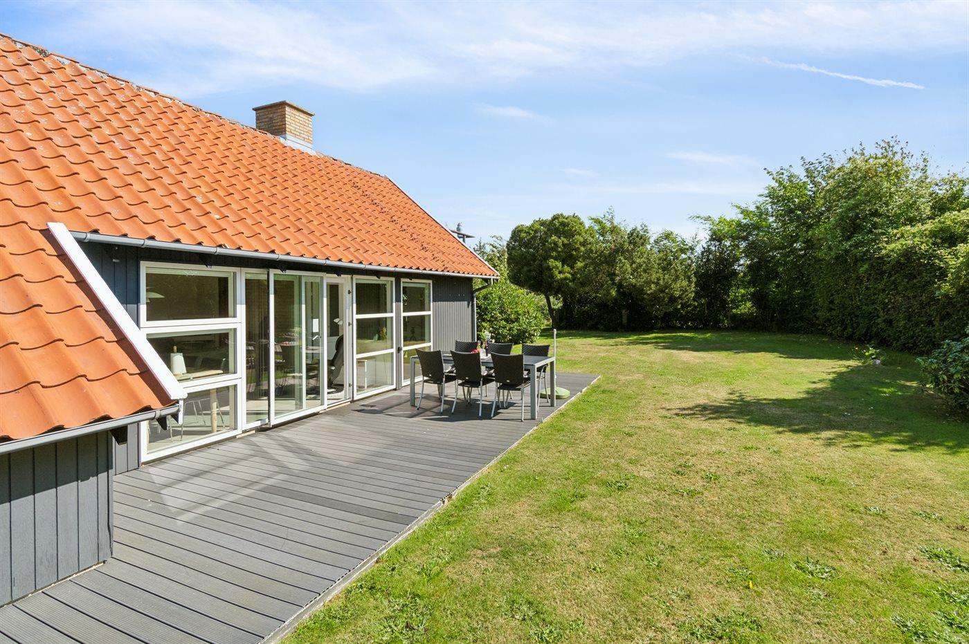 Ferieboligen er beliggende på en 635 m² stor naturgrund. Der er 200 m til havet. Nærmeste forretning er beliggende i en afstand af 500 m. Til ferieboligen hører åbent terrasseareal. Desuden er der overdækket terrasse. Grill til rådighed. Parkering ved ferieboligen.