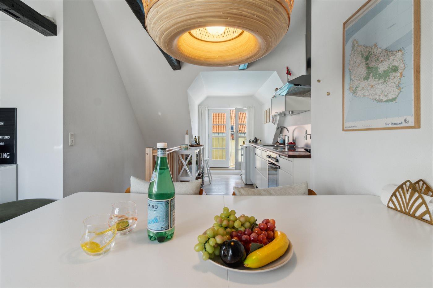 Fin ferielejlighed i to plan beliggende i den populære Gudhjem Købmandsgård midt i Gudhjem.