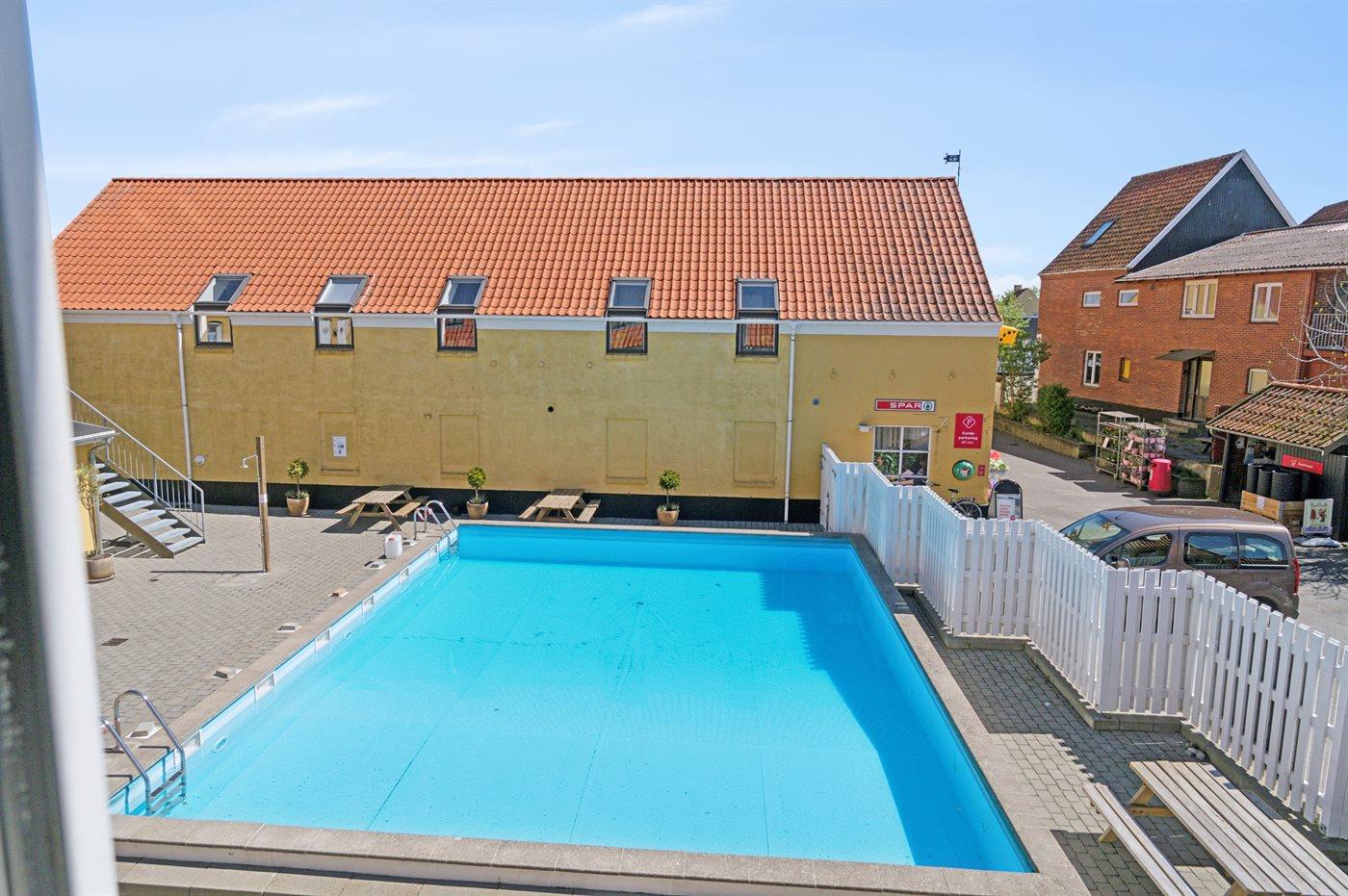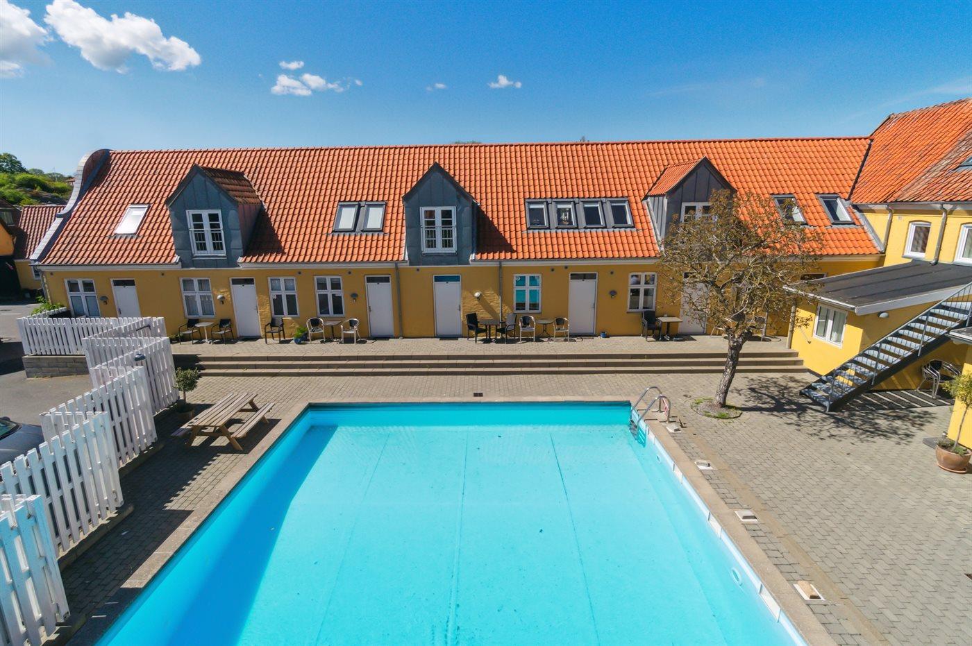 I den flisebelagte gård er der en fælles udendørs swimmingpool (uopvarmet) - poolen kan benyttes fra 1. juni til 30. september. Supermarked lige ved komplekset, så der er ikke langt til morgenbrødet under ferien. Restauranter, Røgeri, is og chokolade og små cafeer - det hele er lige ved hånden. Husk gode travesko - gaderne i Gudhjem er stejle, men absolut charmerende.