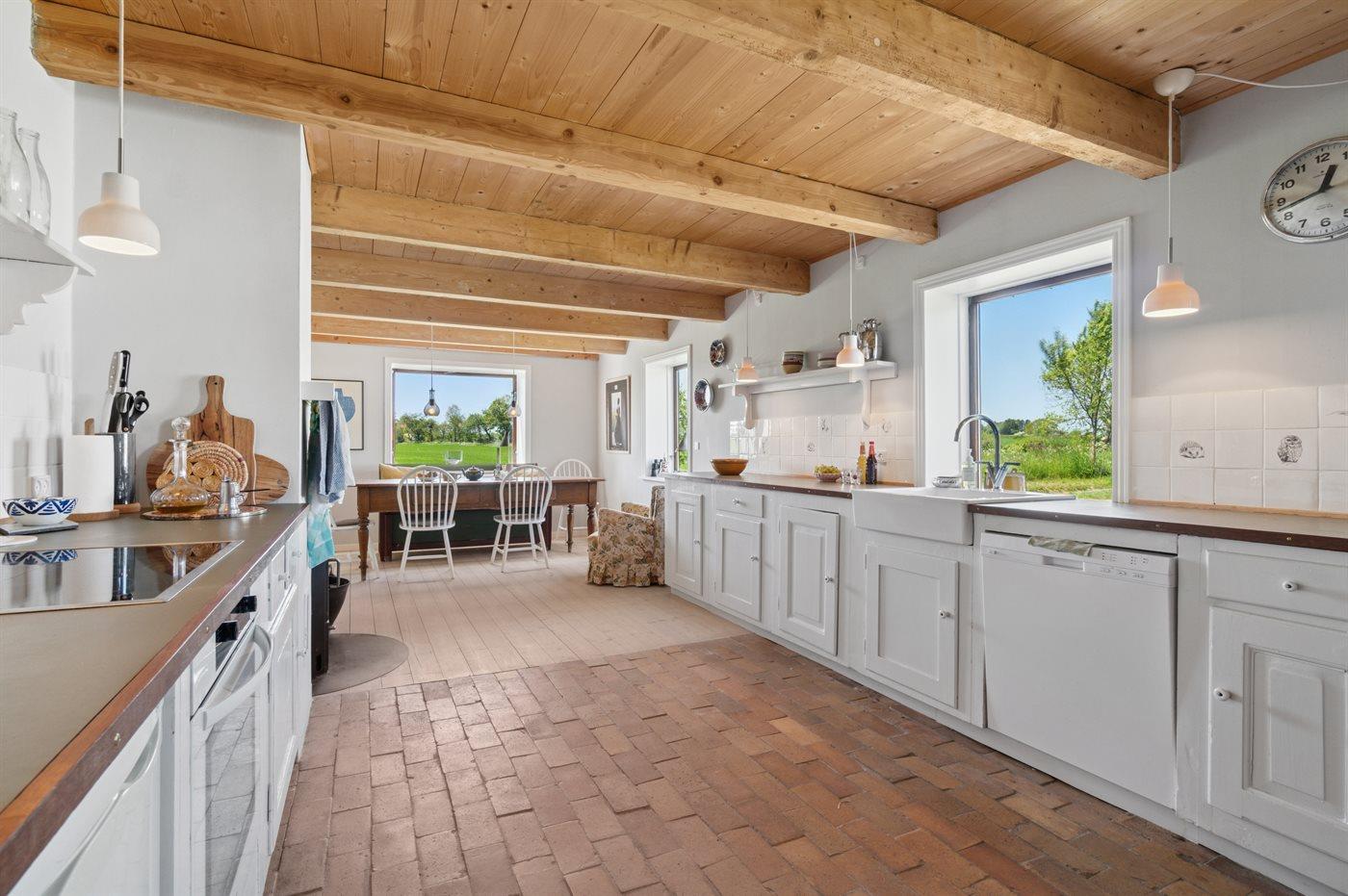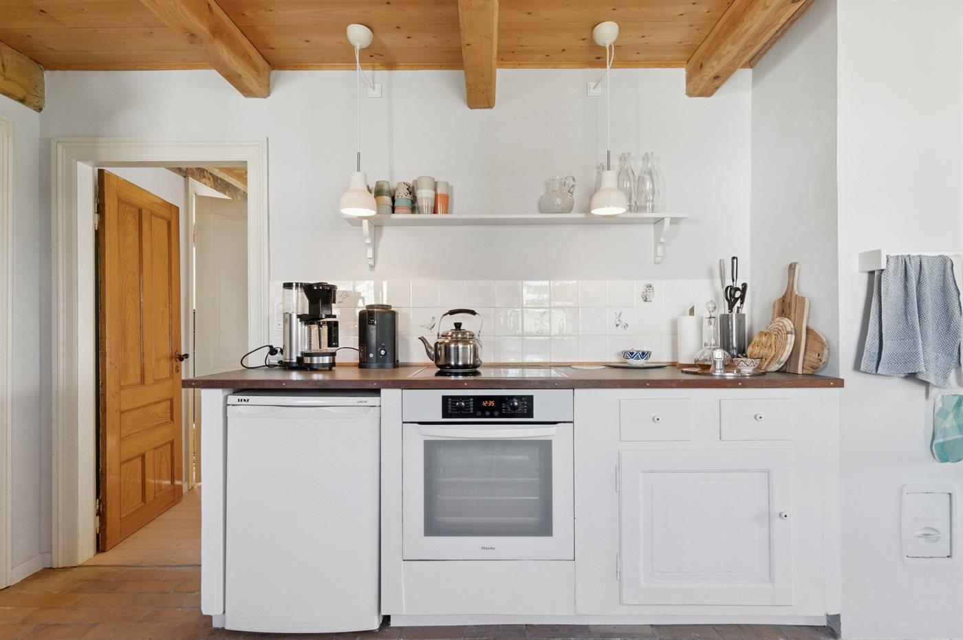 Køkkenet er udstyret med 1 køleskab. Der er 4 induktionskogeplader, varmluftovn samt opvaskemaskine.