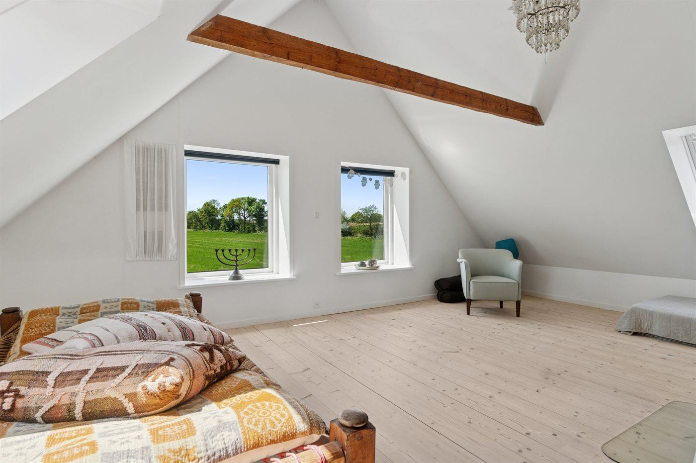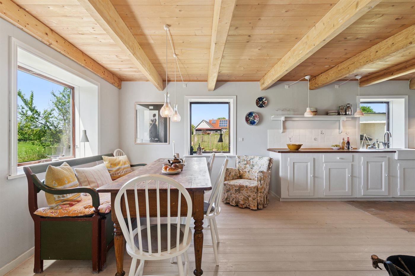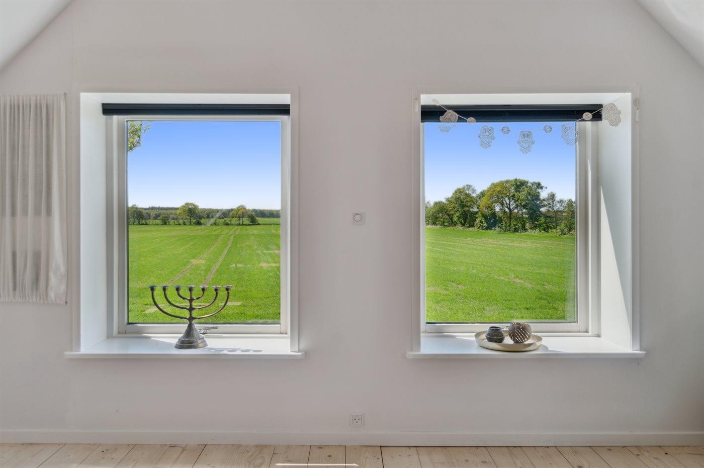 Huset ligger på en meget stor naturgrund langt ude på landet. Fuglefløjt, måske et pindsvin, en fasan eller hvis du er heldig et rådyr i haven – her venter der dig gode naturoplevelser. Lyst og rart men først og fremmest med naturens ro og alle de grønne farver lige udenfor - kan det næsten ikke blive meget bedre.