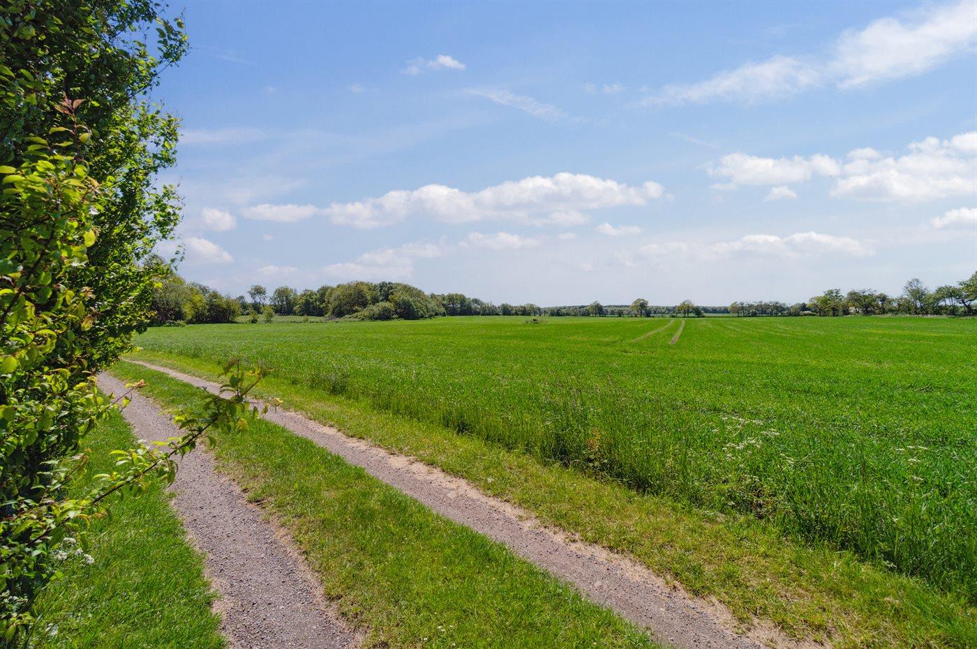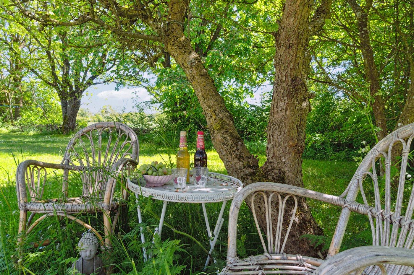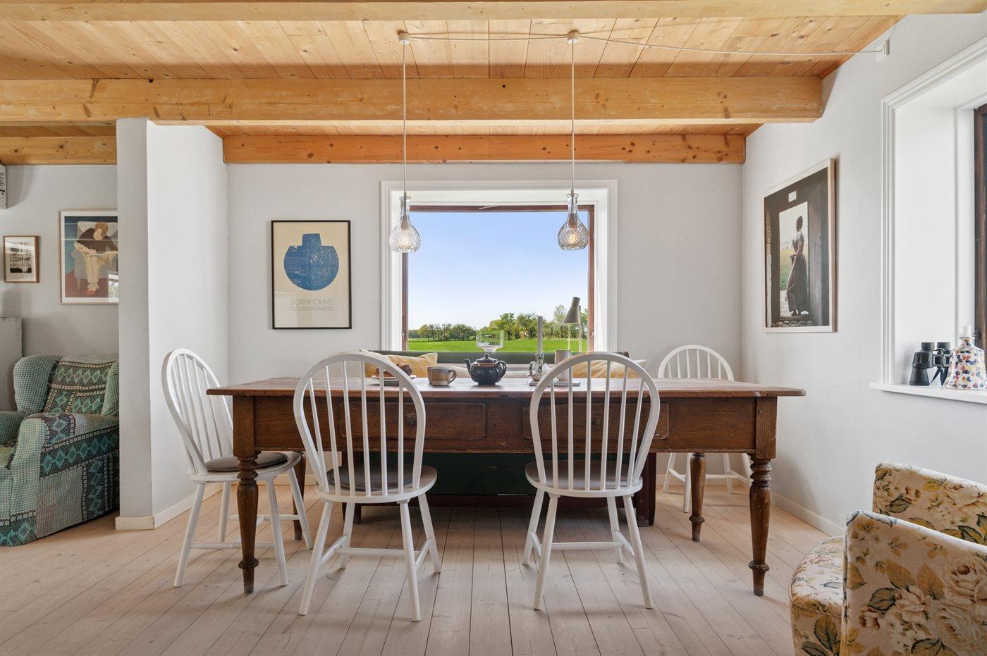 Huset ligger på en meget stor naturgrund langt ude på landet. Fuglefløjt, måske et pindsvin, en fasan eller hvis du er heldig et rådyr i haven – her venter der dig gode naturoplevelser. Lyst og rart men først og fremmest med naturens ro og alle de grønne farver lige udenfor - kan det næsten ikke blive meget bedre.