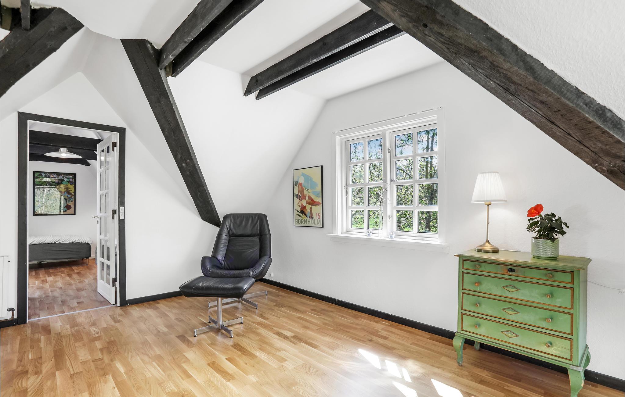 Lejligheden er flot og lyst indrettet med synlige tagbjælker. Den har en behagelig atmosfære over sig og byder på flere hyggelige kroge og siddepladser, hvor I kan slappe af med en bog og nyde udsigten over de grønne omgivelser.