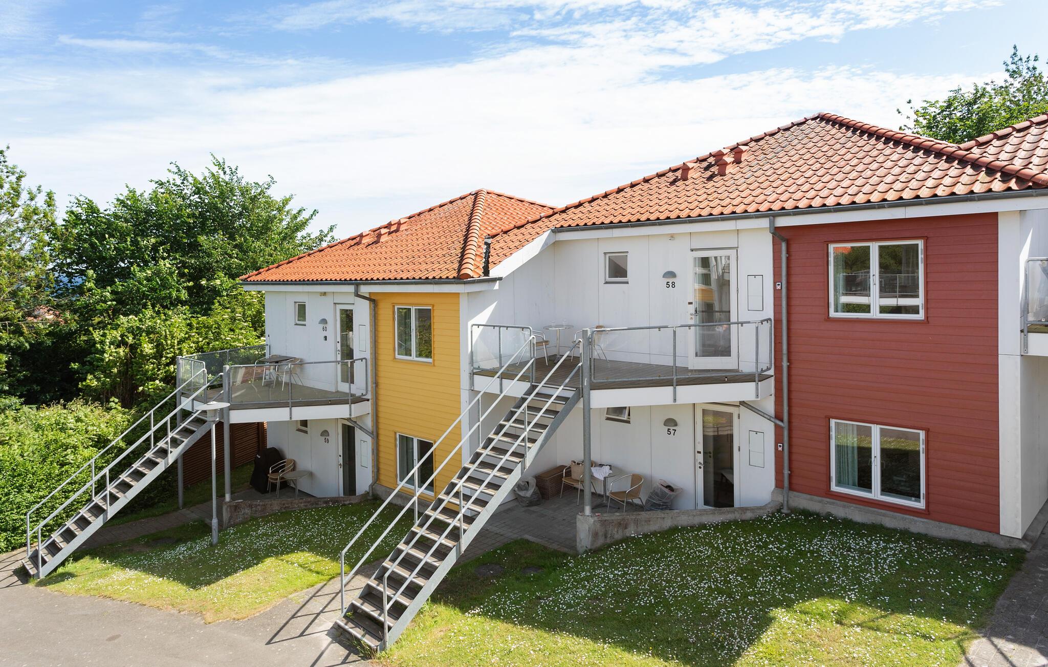 Denne charmerende bolig i Gudhjem er del af et større kompleks med andre lignende ferielejligheder. Her kan I se frem til et behageligt ophold. Den lyse og indbydende lejlighed er noget særligt med velvalgte møbler og en varm og behagelig atmosfære. Glæd jer til nogle vidunderlige feriedage her med at lave mad sammen, holde sjove spilaftener eller bare slappe af. Fra altanen kan I se havets glitrende blå og nyde den friske luft. Havet kan nås på få minutter til fods.