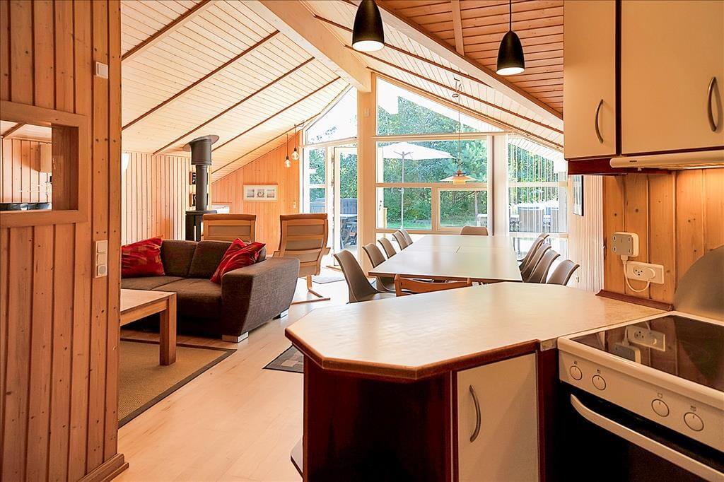 I dette store rummelige og moderne familiesommerhus har I alle faciliteter og masser af plads til alle. Stuen med udkik til terrassen og haven er det naturlige samlingssted, hvad enten det er i sofaarrangementet eller ved spisebordet, og her kan I tilbringe mange timer med at spille og hygge. Skulle det blive for varmt, slår I bare døren op til terrassen. Bliver det køligt, sørger brændeovnen for en behagelig hyggelig varme. Ellers er det også muligt at få varmen fra en tur i husets sauna eller spabad.