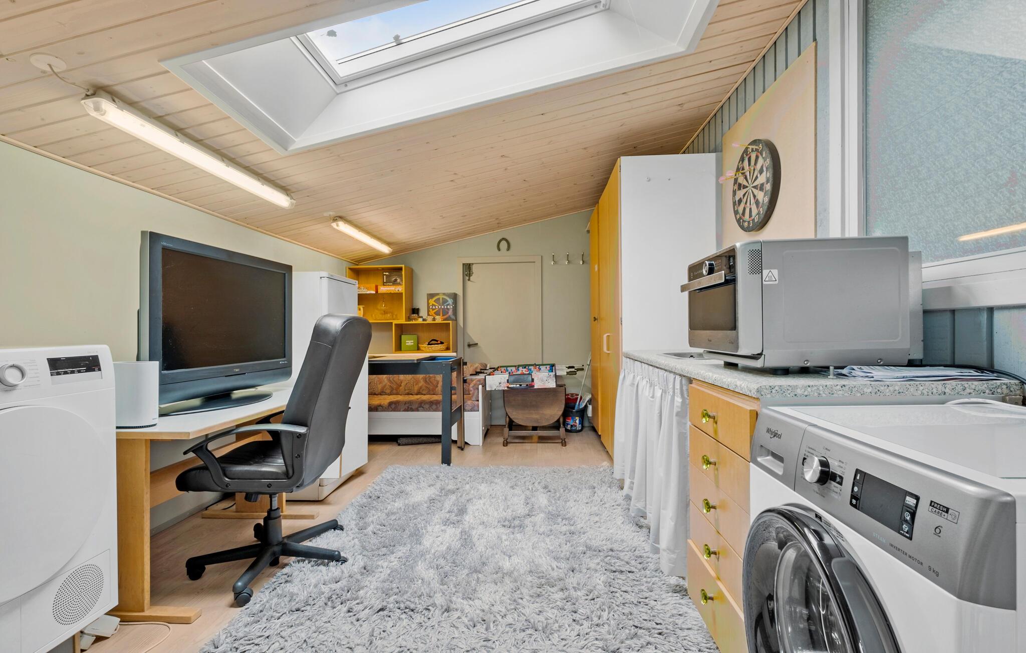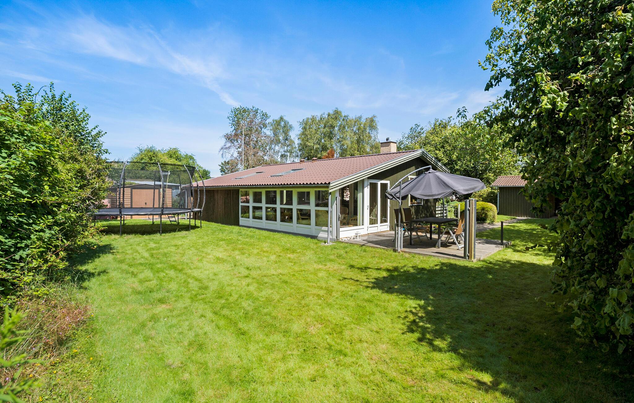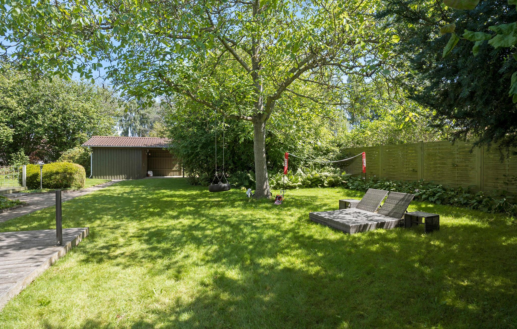 I kan også se frem til en masse gode stunder udendørs. Benyt lejligheden til at spille en volleyballkamp eller læn jer tilbage på terrassen, mens børnene hygger sig på gyngerne, i sandkassen og hopper på trampolinen. De høje træer sørger for behagelig læ og skygge på de varme solskinsdage. Skulle en regnsky kigge forbi, er der både bordfodbold, billard og dart inde i huset.