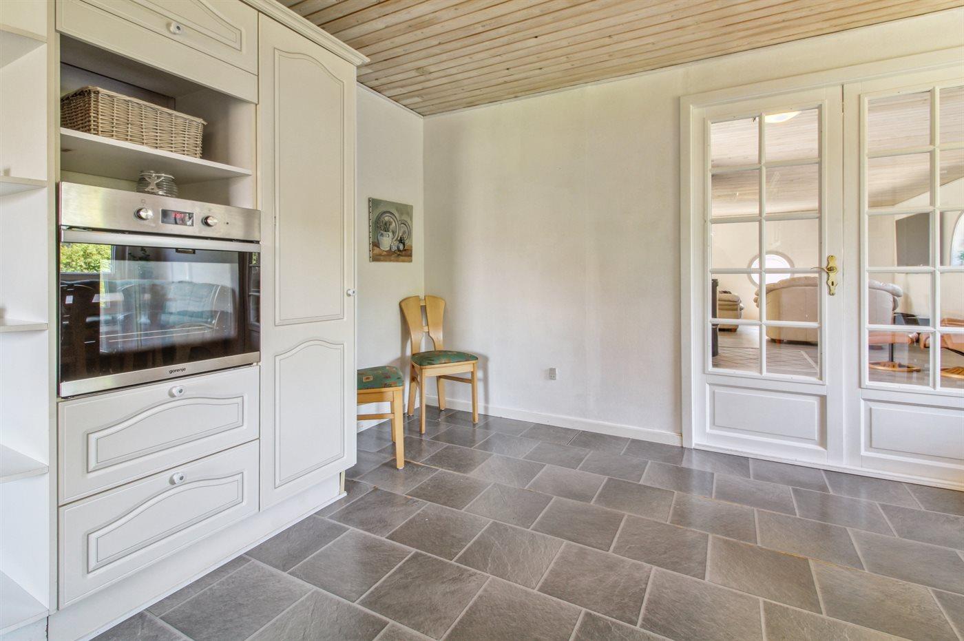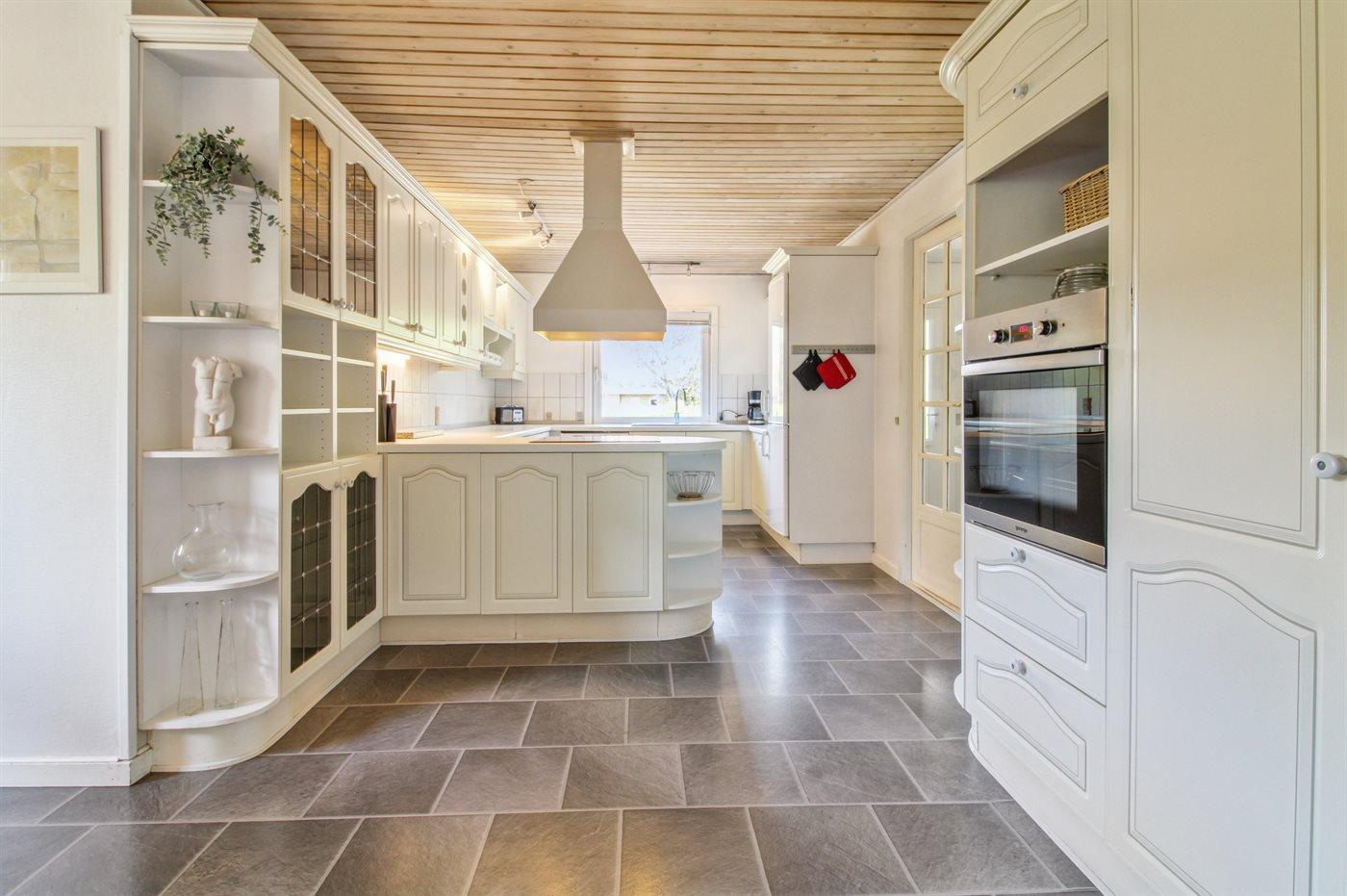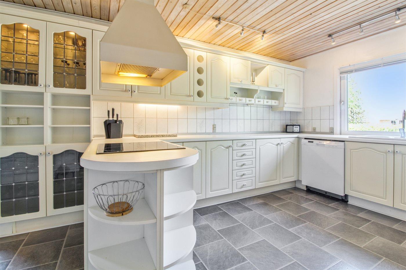 Køkkenet er udstyret med 1 køleskab. Der er 4 keramiske kogeplader, varmluftovn samt opvaskemaskine Der er gulvvarme i køkkenet.