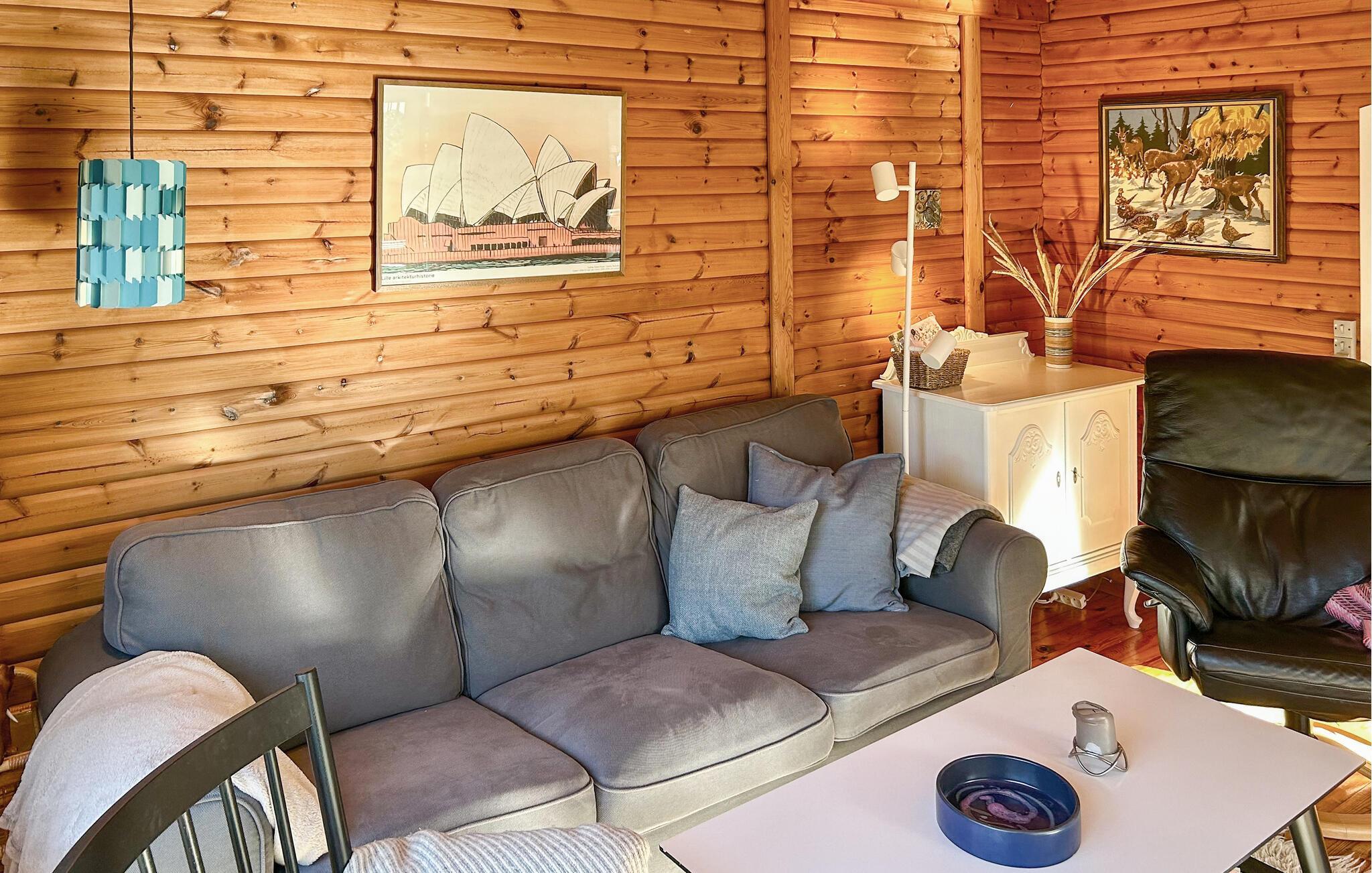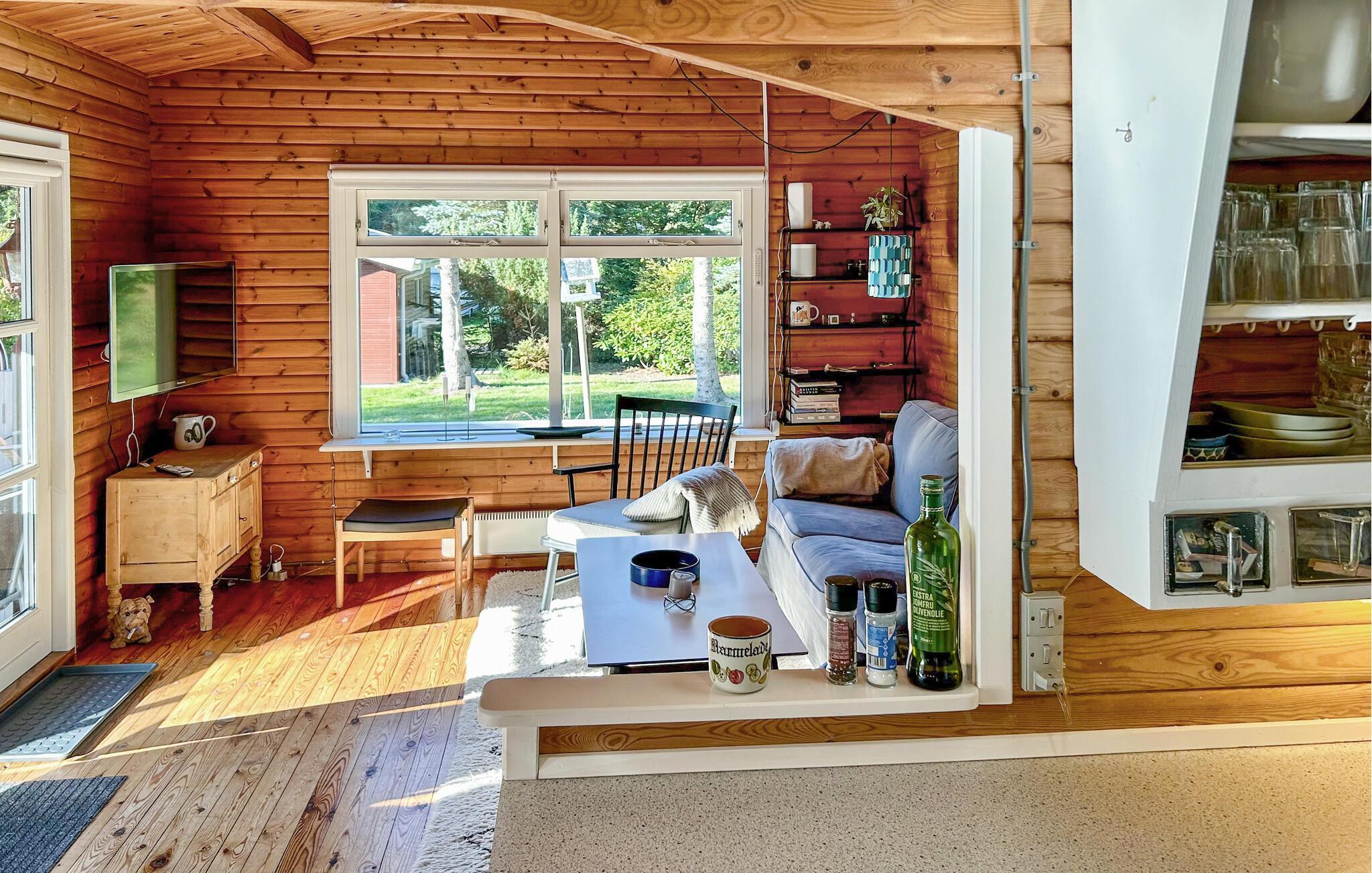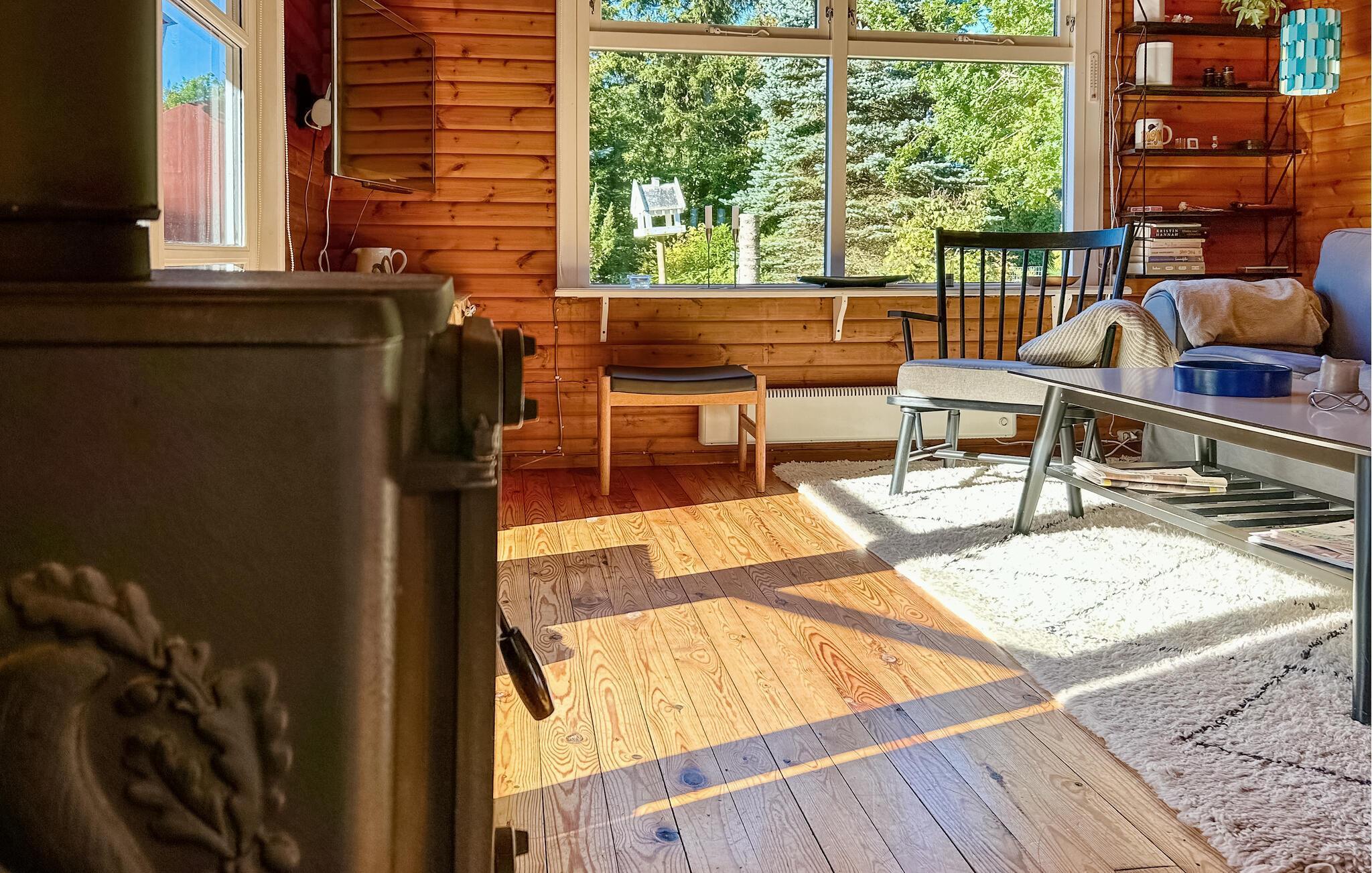 Omgivet af træer og natur tilbyder dette feriehus de ideelle rammer for familier, der søger fred, samhørighed og nærhed til havet. Bliv budt velkommen af ??den varme atmosfære i interiøret. Det lyse træ på vægge og loft skaber en hyggelig atmosfære, mens store vinduer åbner ud mod haven. Sæt jer godt til rette i den komfortable sofa foran brændeovnen eller nyd måltiderne sammen ved spisebordet med udsigt over de grønne områder. Det kompakte køkken giver jer mulighed for at tilberede enkle feriemåltider.