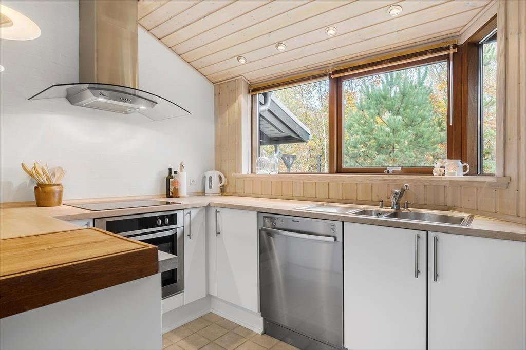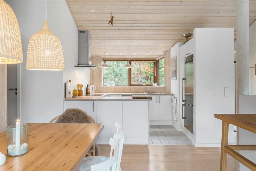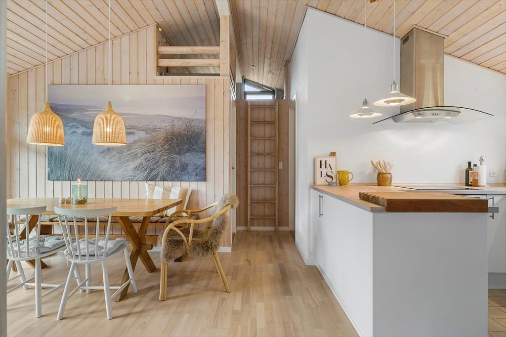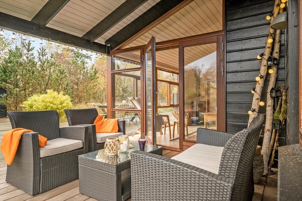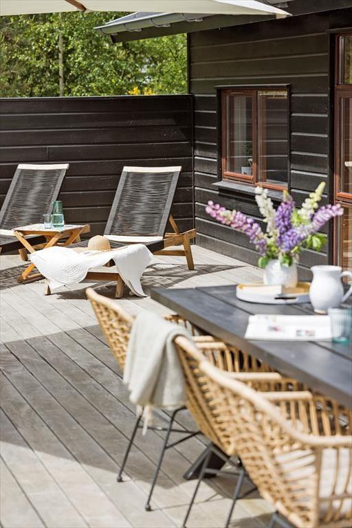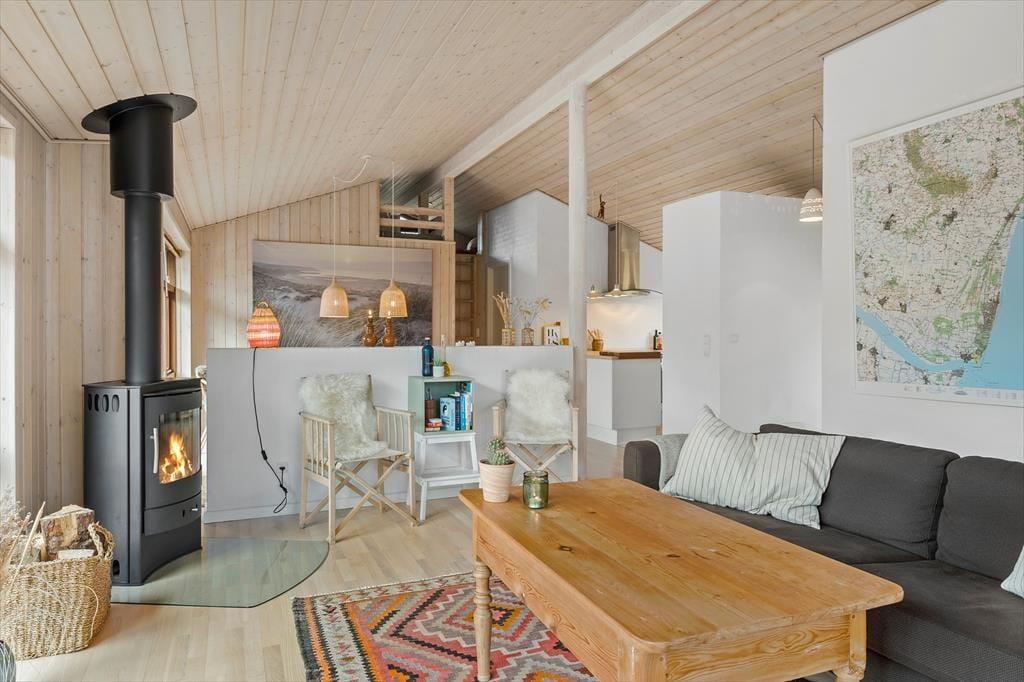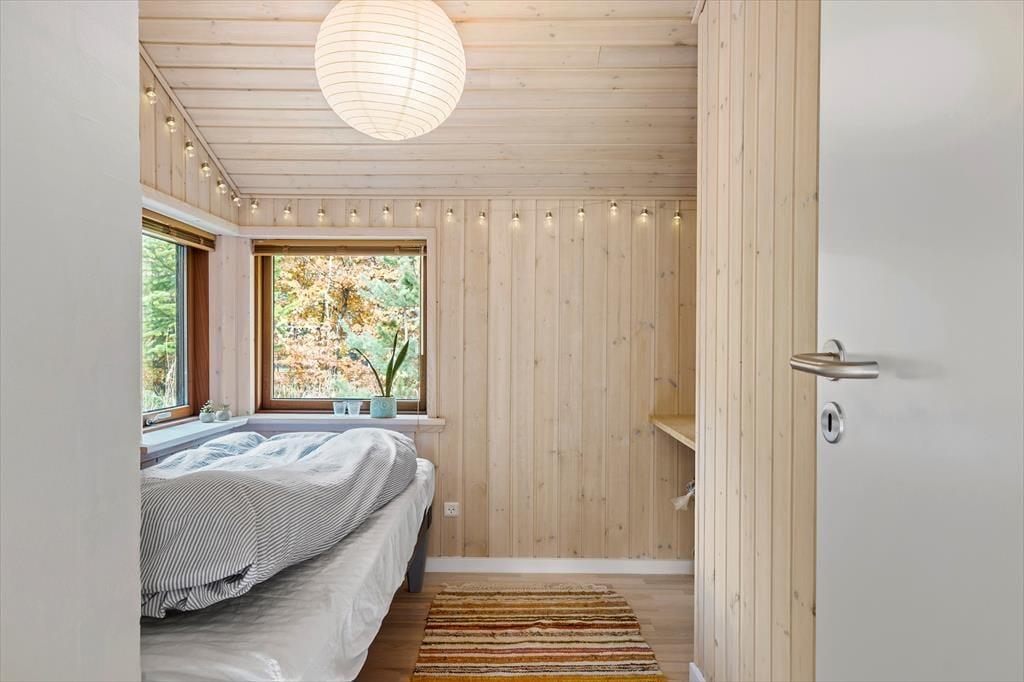 Med spabad og sauna på det største badeværelse, brændeovn i stuen og komfortable senge på soveværelserne er der lagt op til wellness og afslapning inden døre i det 96 m2 store sommerhus. Som supplement til husets tre soveværelser er der flere sengepladser i et anneks på 11 m2, og derfor kan I uden problemer være op til seks personer. En stor del af feriens vågne stunder kommer sikkert til at udspille sig i sommerhusets opholdsafdeling, hvor køkken-alrum og stue ligger i åben forbindelse. Her er der loft til kip og store vinduer, som skaber en god kontakt til terrassearealerne og giver udsigt til den grønne grund. Hvis I har børn med, vil de måske synes, de er hyggeligt at kravle op på hemsen for at lege, mens de voksne kræser om maden i det veludstyrede køkken eller hyggesnakker ved spisebordet.