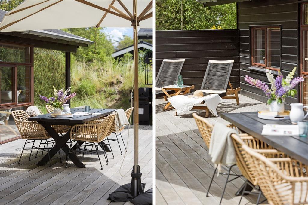 Når det ikke er vejr til brændeovnshygge og varme spabade, men derimod til solbeskinnede sommerfrokoster og havespil, får I en skøn ramme om ferielivet på den 1050 m2 store grund. Rundt om sommerhuset er der flere terrasser at vælge imellem, så I kan sætte jer lige der, hvor solforholdene er bedst – eller alternativt i skyggen på det overdækkede areal.