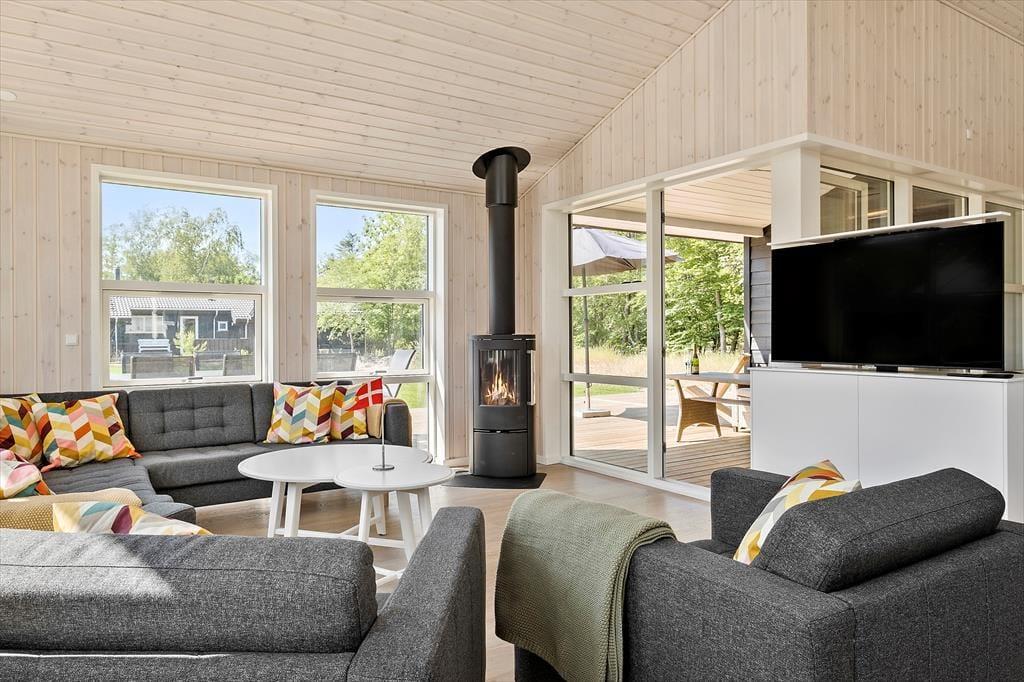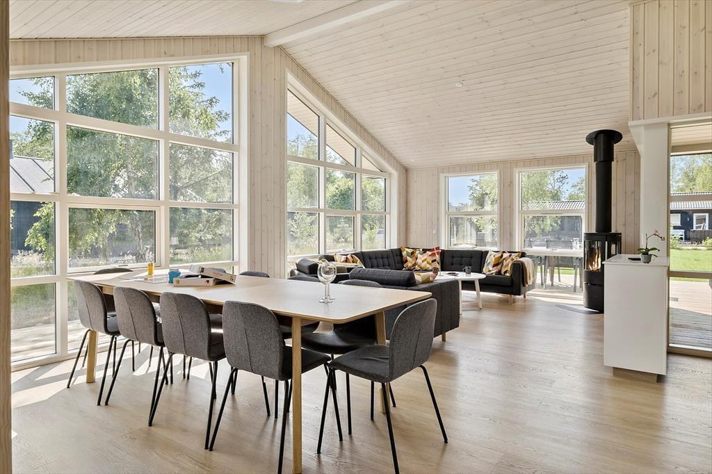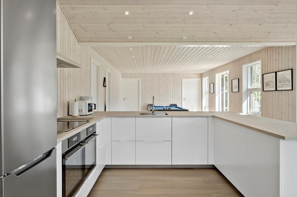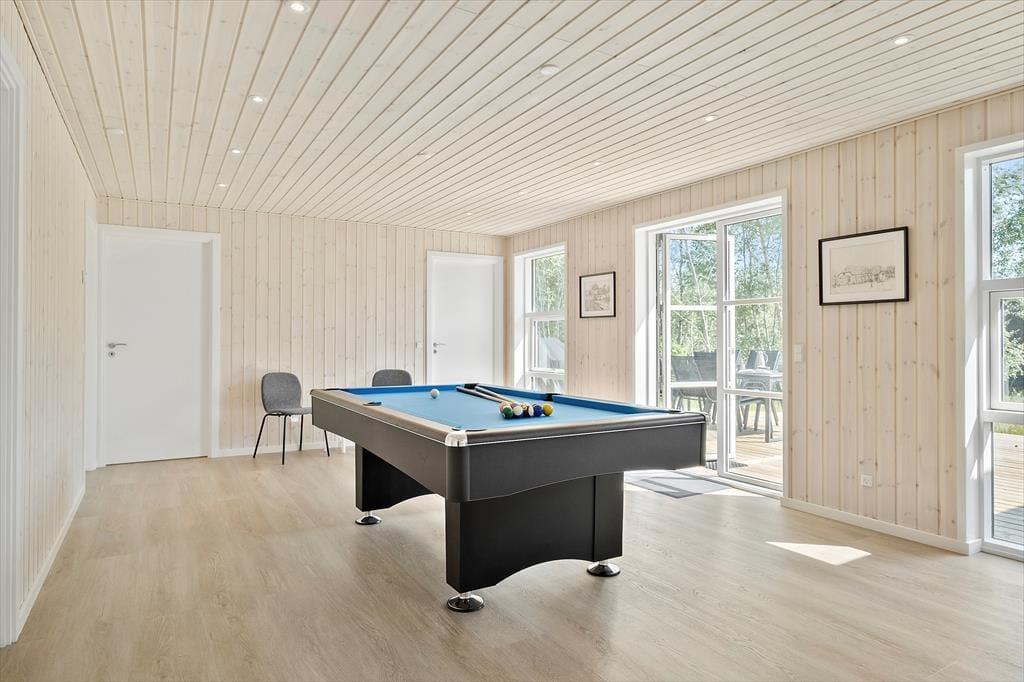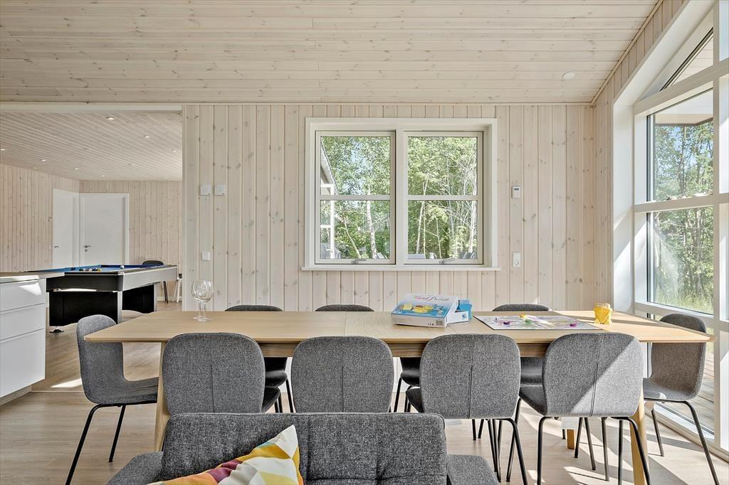 Hvis I er på udkig efter et moderne sommerhus til mange mennesker, har I fundet det helt rette, for med fem soveværelser, to badeværelser og i alt 159 m2 kan I være 14 personer samlet. Fire af værelserne har hver især to sengepladser, og på det femte står der to køjesenge. Herfra går der også en stige op til en hems med ekstra madrasser, så alt i alt kan rummet fungere som en hyggelig sovesal. Begge badeværelser er med bruseniche, og på det største får I også glæde af et spabad. Er I ikke i humør til wellness, men mere til sjov og ballade, kan I tage et slag pool eller lave bordtennisturnering for hele familien. Dagen kan også foregå i ro og mag nær brændeovnen i sommerhusets flotte og lyse stue, og når I er ved at blive sultne, kan I påbegynde madlavningen i det åbne køkken. Sammenlignet med almindelige sommerhuset er køkkenet særdeles rummeligt og veludstyret – blandt andet med to ovne, hvilket er dejligt, når huset er fuldt.
