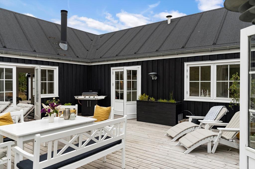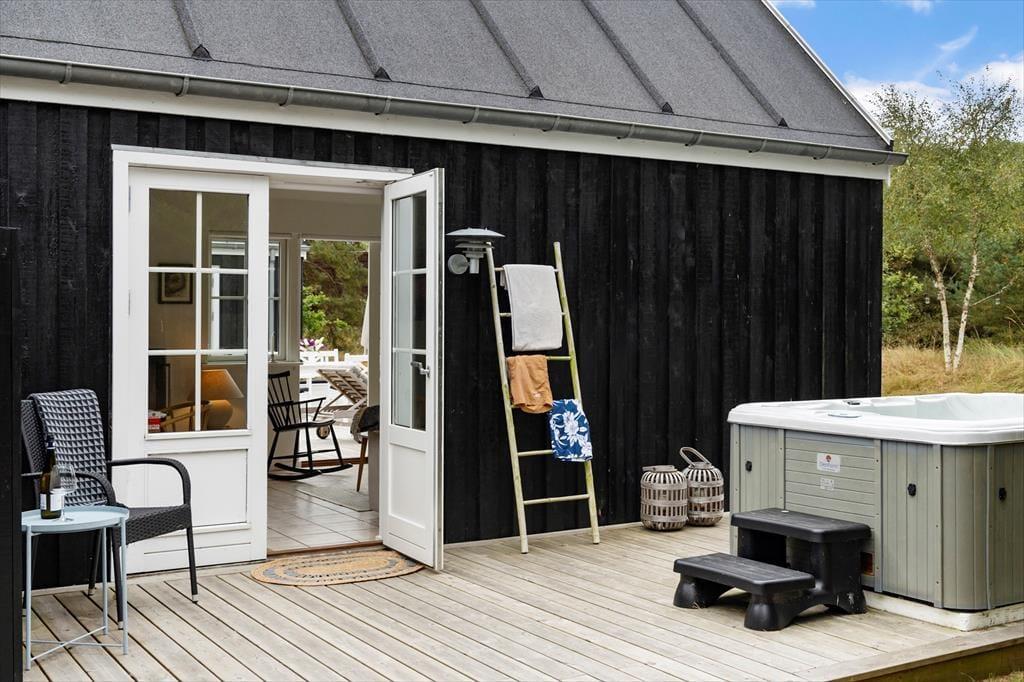 Også udenfor er sommerhuset skabt til at nyde feriedagene fuldt ud. Den store terrasse går hele vejen rundt om huset, så du altid kan finde en solkrog eller læfyldt plet, alt efter hvad dagen byder på. Sæt dig med en kop kaffe i morgensolen, indtag frokosten under åben himmel eller tænd op i grillen, når aftenen nærmer sig. Den skønne grund har mange små og hyggelige kroge, hvor du kan finde ro til at sidde med fuglesang i baggrunden – eller legeplads til både store og små på plænen. Som en ekstra luksus kan wellnessoplevelserne fortsætte udenfor, hvor et udendørs spabad står klar til at give dig en uforglemmelig stund under åben himmel – hvad enten det er med udsigt til blå himmel eller stjerneklar nat.
