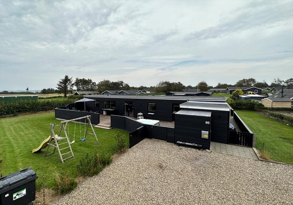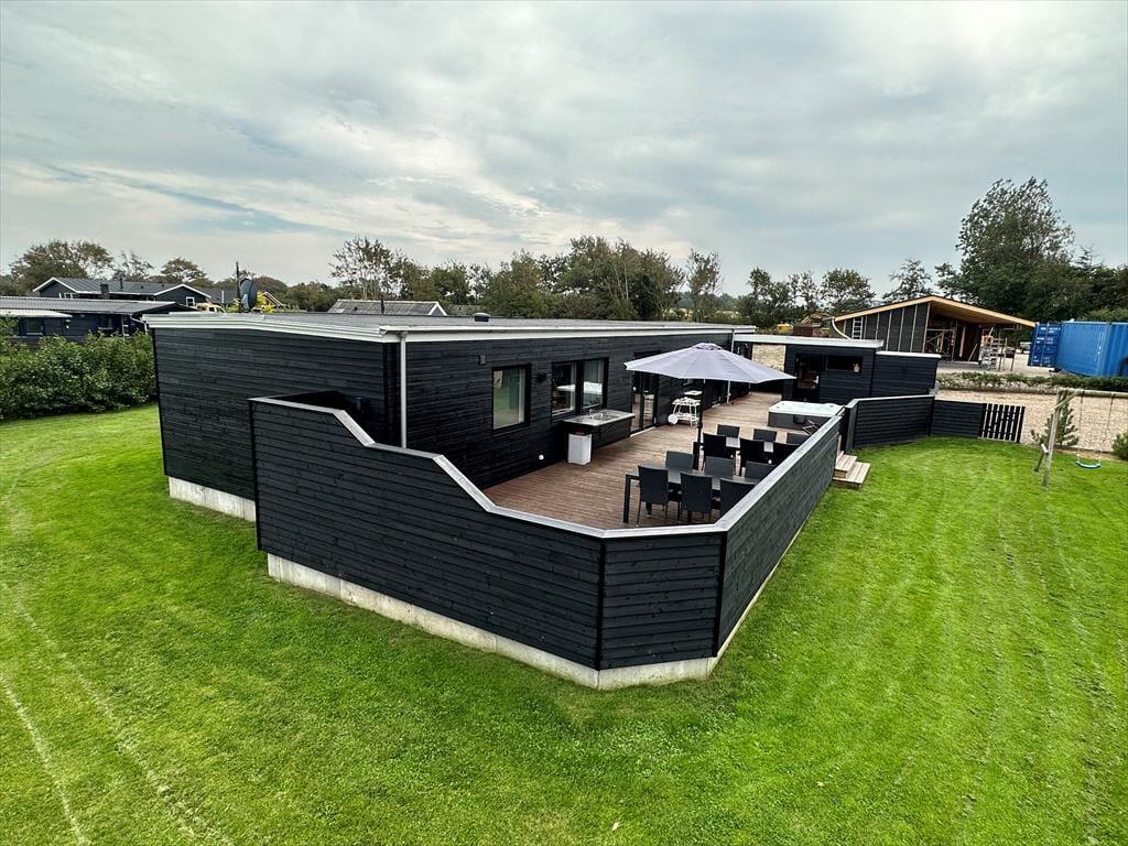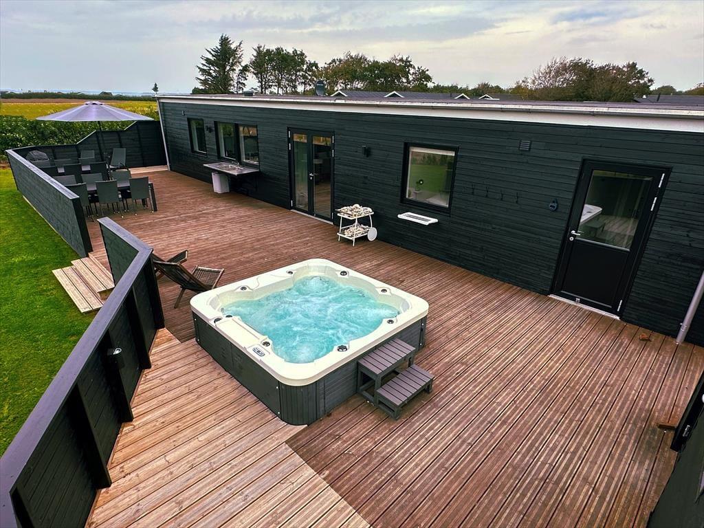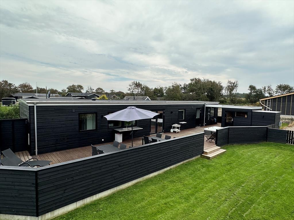 På husets store terrasse folder ferielivet sig ud med alt, hvad hjertet kan begære – og mere til. Her er god plads til at slappe af i solen med en bog, spille kort med børnene eller nyde lange, lune sommeraftener i godt selskab. Det lækre udendørs spabad er et af husets helt store højdepunkter. Forestil dig at sidde her under stjernerne med et glas bobler i hånden, mens vandet bruser blidt omkring dig – ren magi! Haven er rummelig og grøn, og her er rigelig plads til leg, boldspil og løbende hundepoter, for hele tre hunde er hjerteligt velkomne her. Med både åbne og mere afskærmede kroge på terrassen kan du altid finde et sted med læ – og når grillen tændes, spreder duften af sommer sig over hele haven.