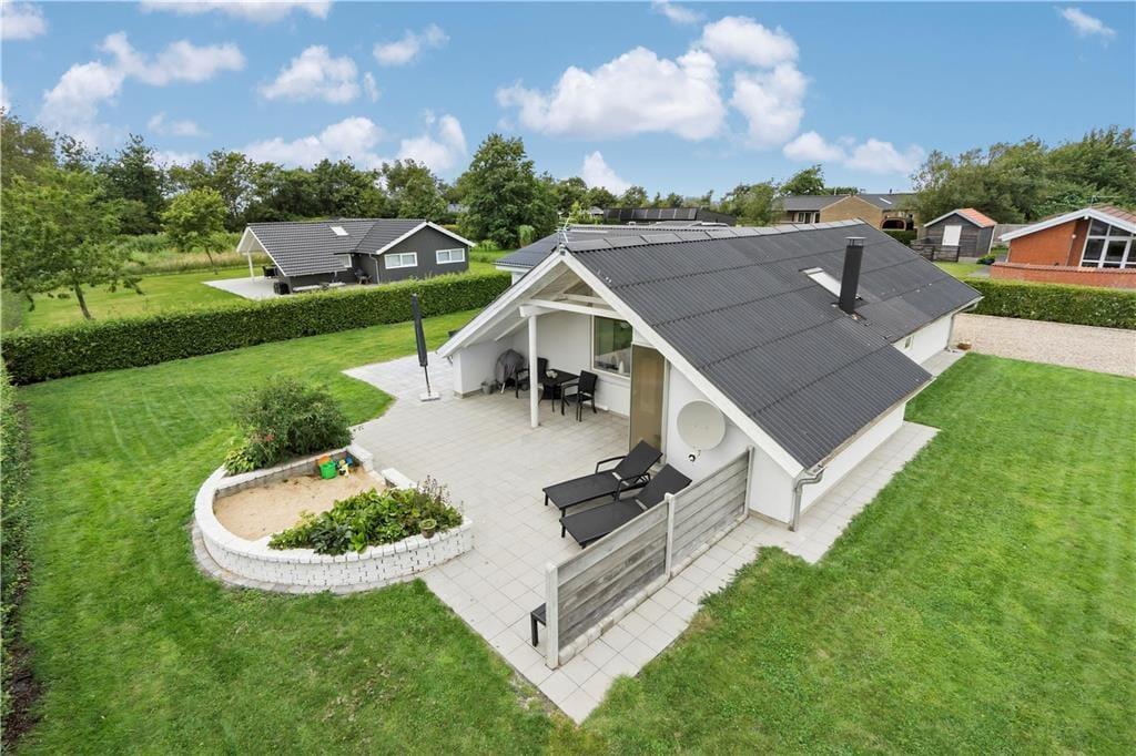 Afslapningsstunderne kan også foregå ude i det fri, for en rolig eftermiddag på sommerhusets store terrasse kan være den helt rette måde at få ladet batterierne op på. Terrassen har et mindre overdækket areal, men er ellers helt åben, og solforholdene er gode. I indkørslen kan der sagtens holde flere biler, og resten af grunden er helt enkelt holdt med græsplæne og randbeplantning.