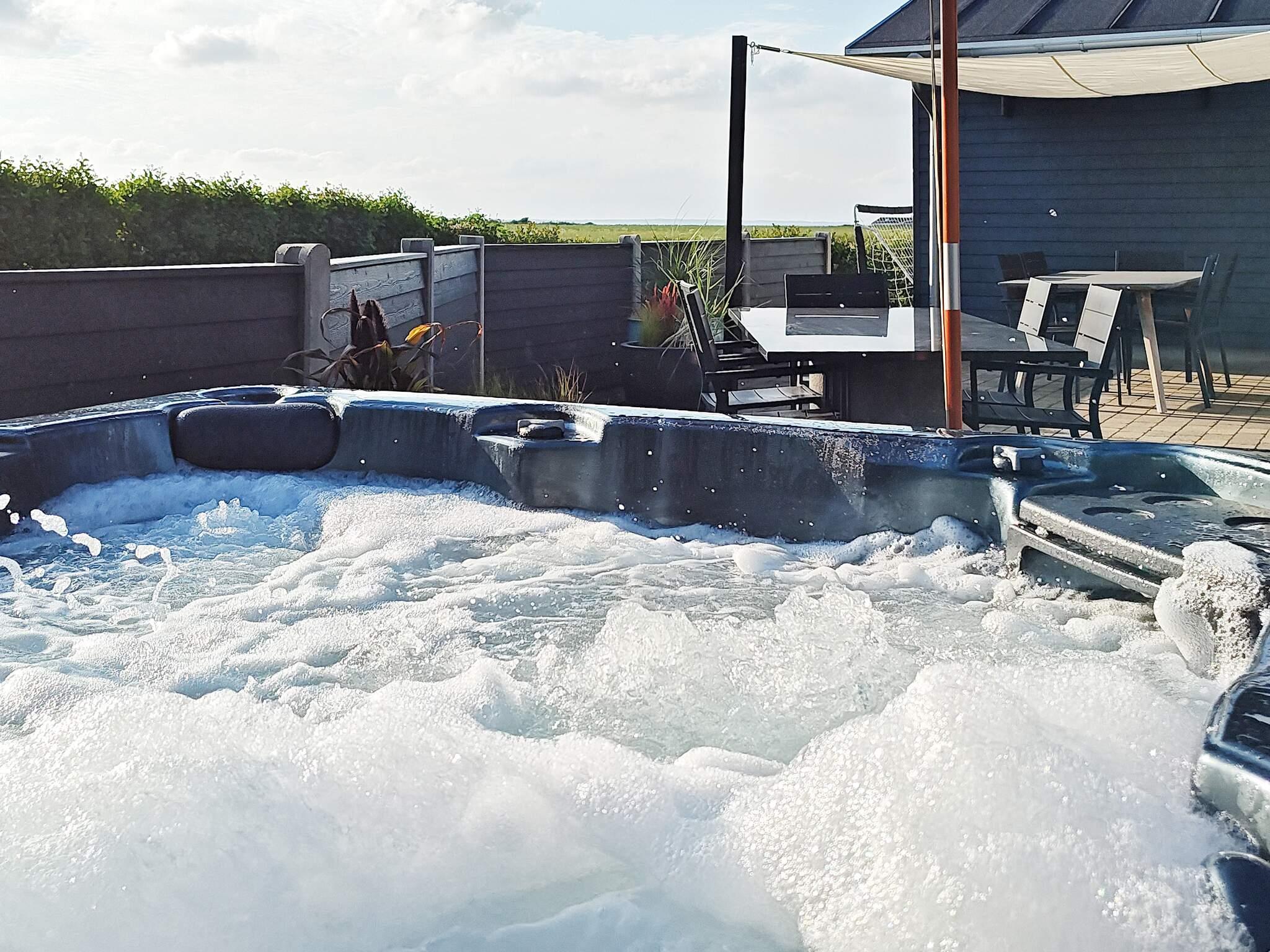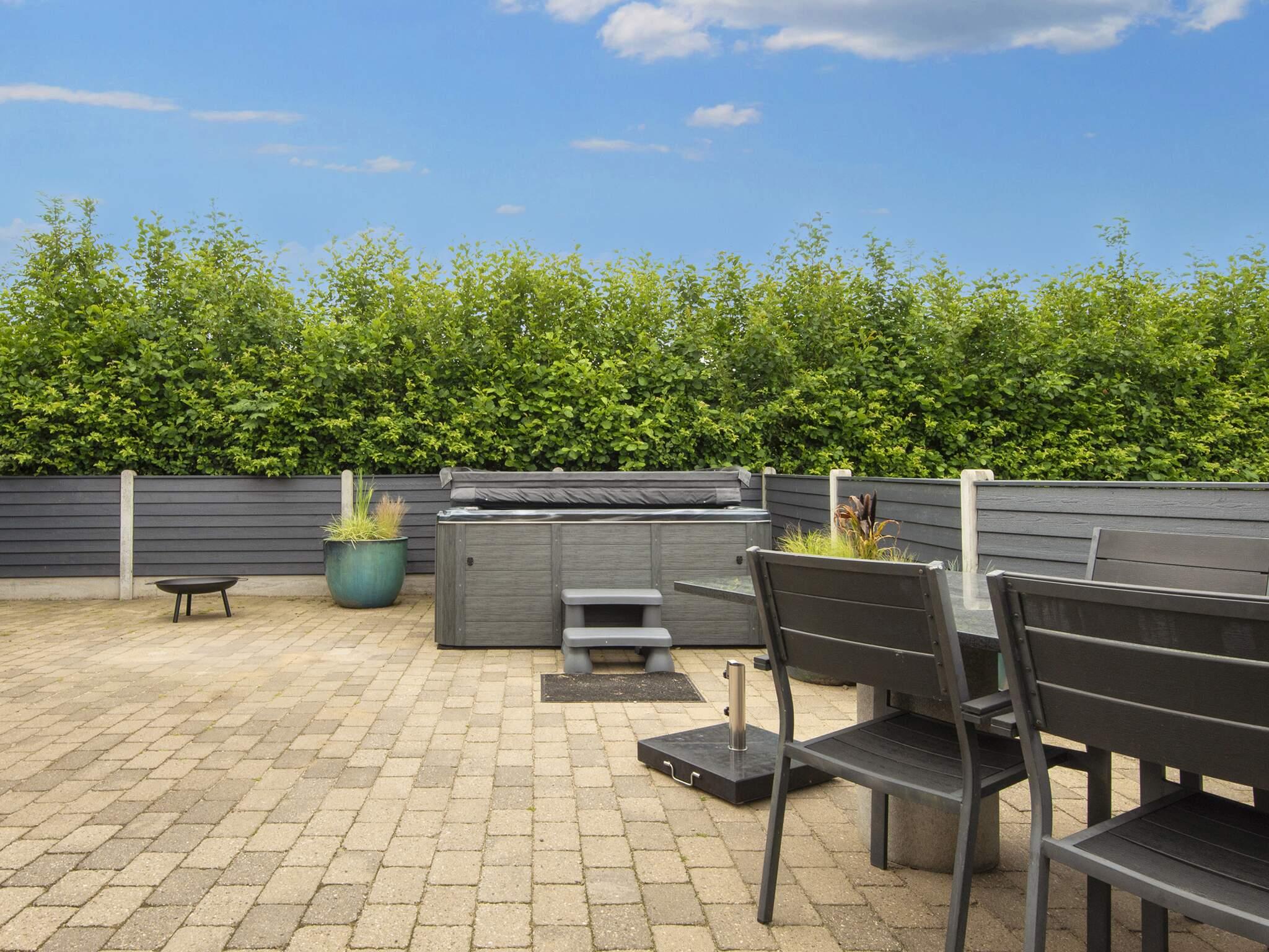 Huset byder på en stor terrasse med gode havemøbler, liggestole samt gasgrill, hvor I kan nyde aftensmaden, mens solen går ned over Fjorden. Det er også her husets 6-personers udespa findes.