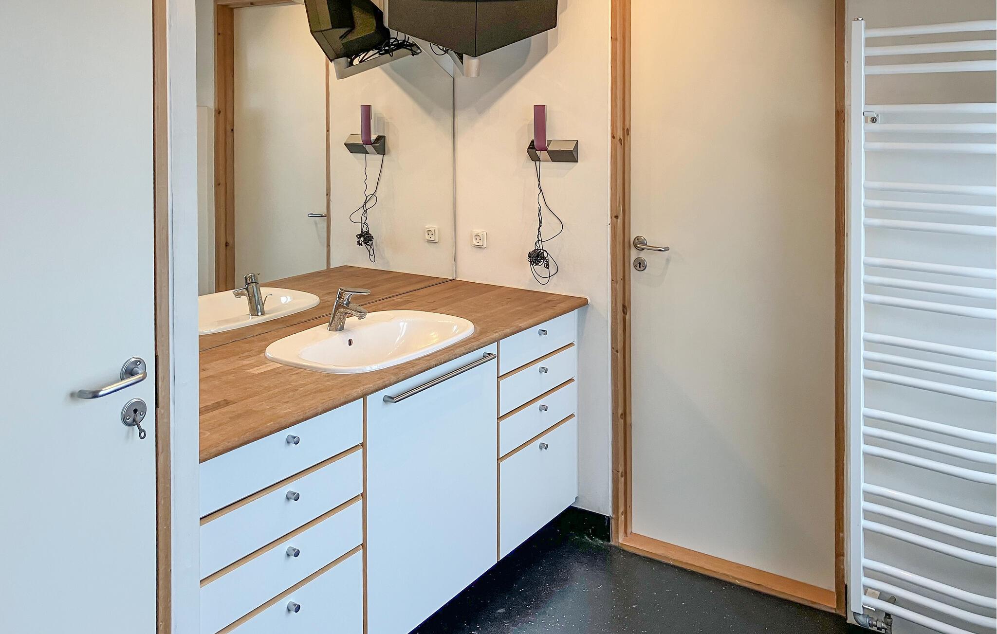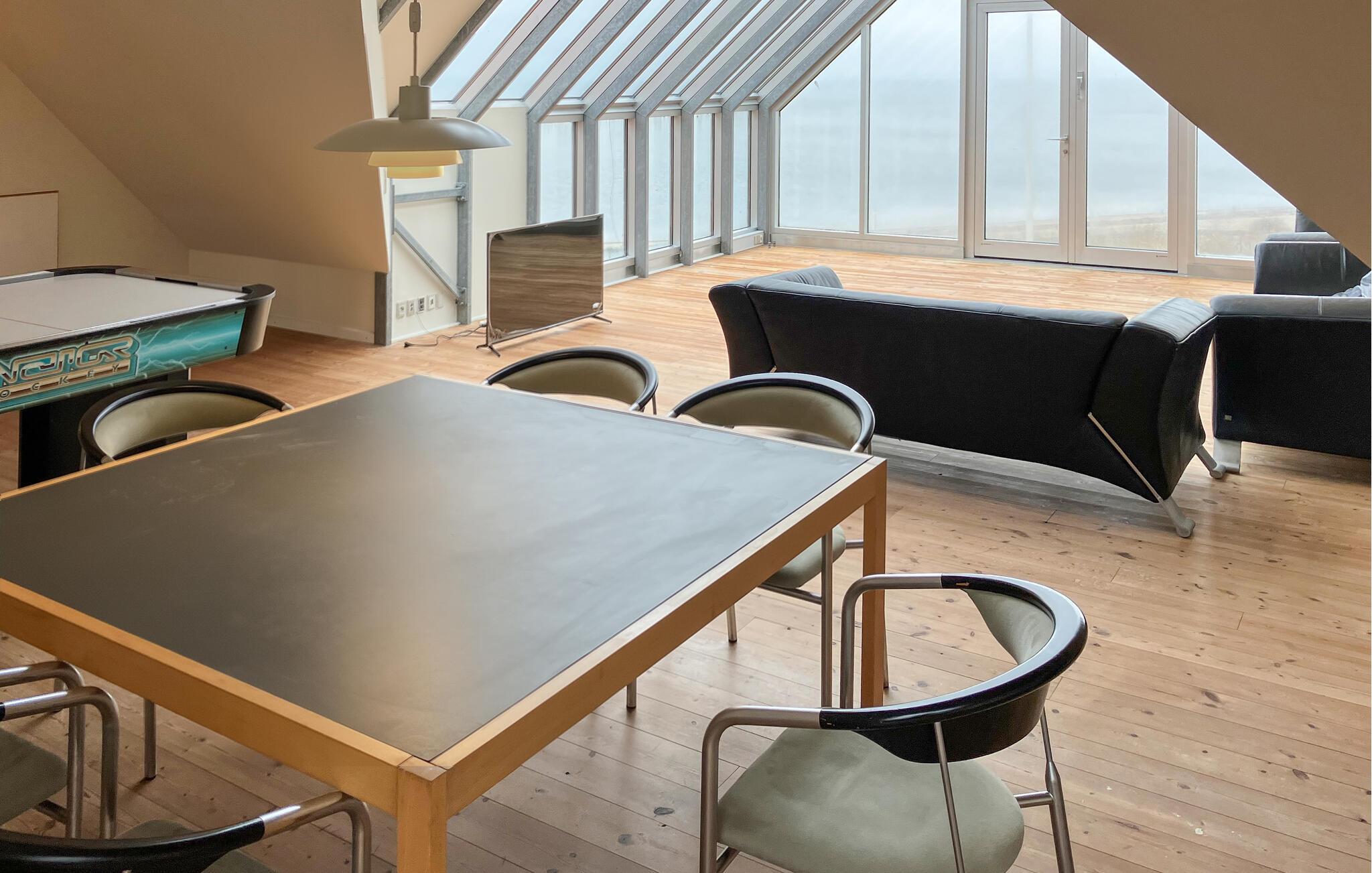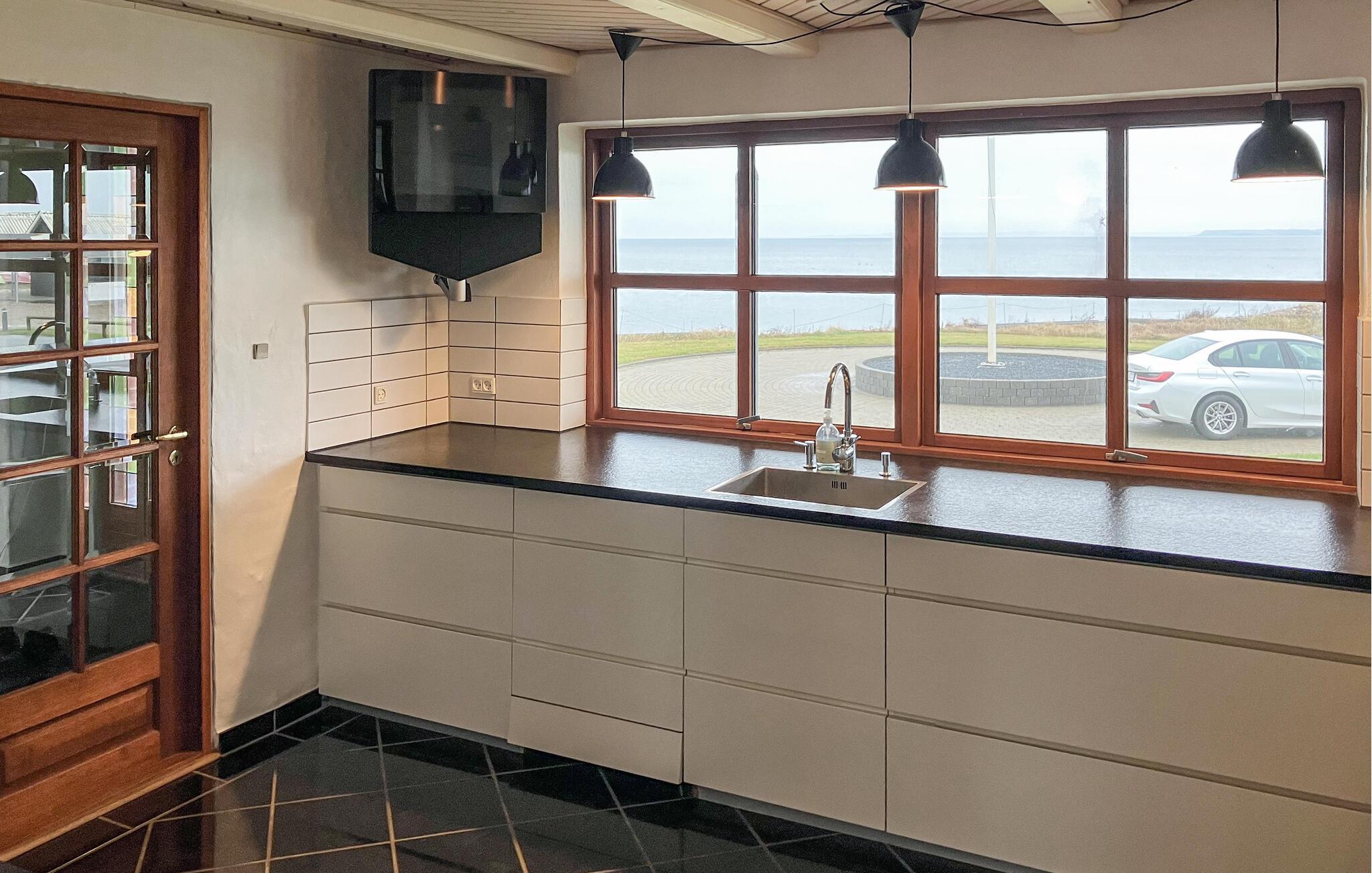 Der er lagt op til nogle herlige dage i dette smukt beliggende feriehus lige ved stranden. Mærk den rummelige atmosfære i jeres feriehus. De store vinduer på første sal åbner udsigten over vandet og skaber en særlig følelse af vidstrakthed. Find jer til rette i de hyggelige sofaer og nyd udsigten. Det lange spisebord i opholdsstuen lægger op til hyggelige måltider, mens det moderne køkken tilbyder fremragende muligheder for at lave mad sammen om aftenen. Efter en begivenhedsrig dag sørger det indendørs spabad for beroligende afslapning.