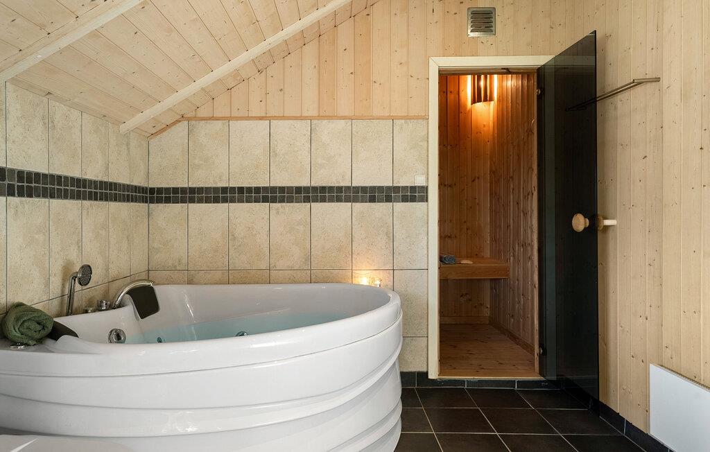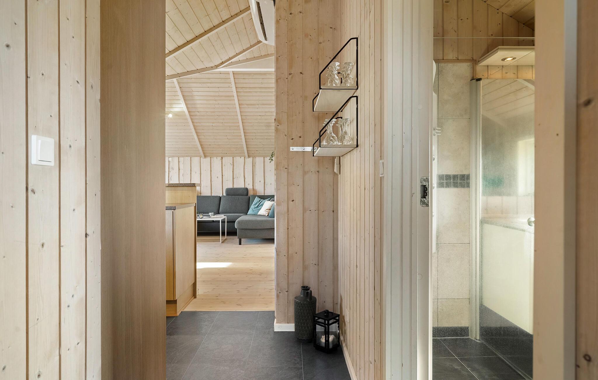 Nyd jeres tid ude i jeres roligt beliggende feriehus, som er noget særligt med sine naturlige omgivelser og hjemlige atmosfære. Gør morgenmaden klar i det praktiske køkken og sæt jer sammen ved det indbydende spisebord for at begynde dagene i fred og planlægge jeres udflugter. I den lyse opholdsstue inviterer den store vinduesfront til at kigge ud i haven. Læn jer tilbage på sofaen og lad den afslappede atmosfære sænke sig. jeres eget lille wellnessområde med sauna og spabad sikrer total afslapning om aftenen.
